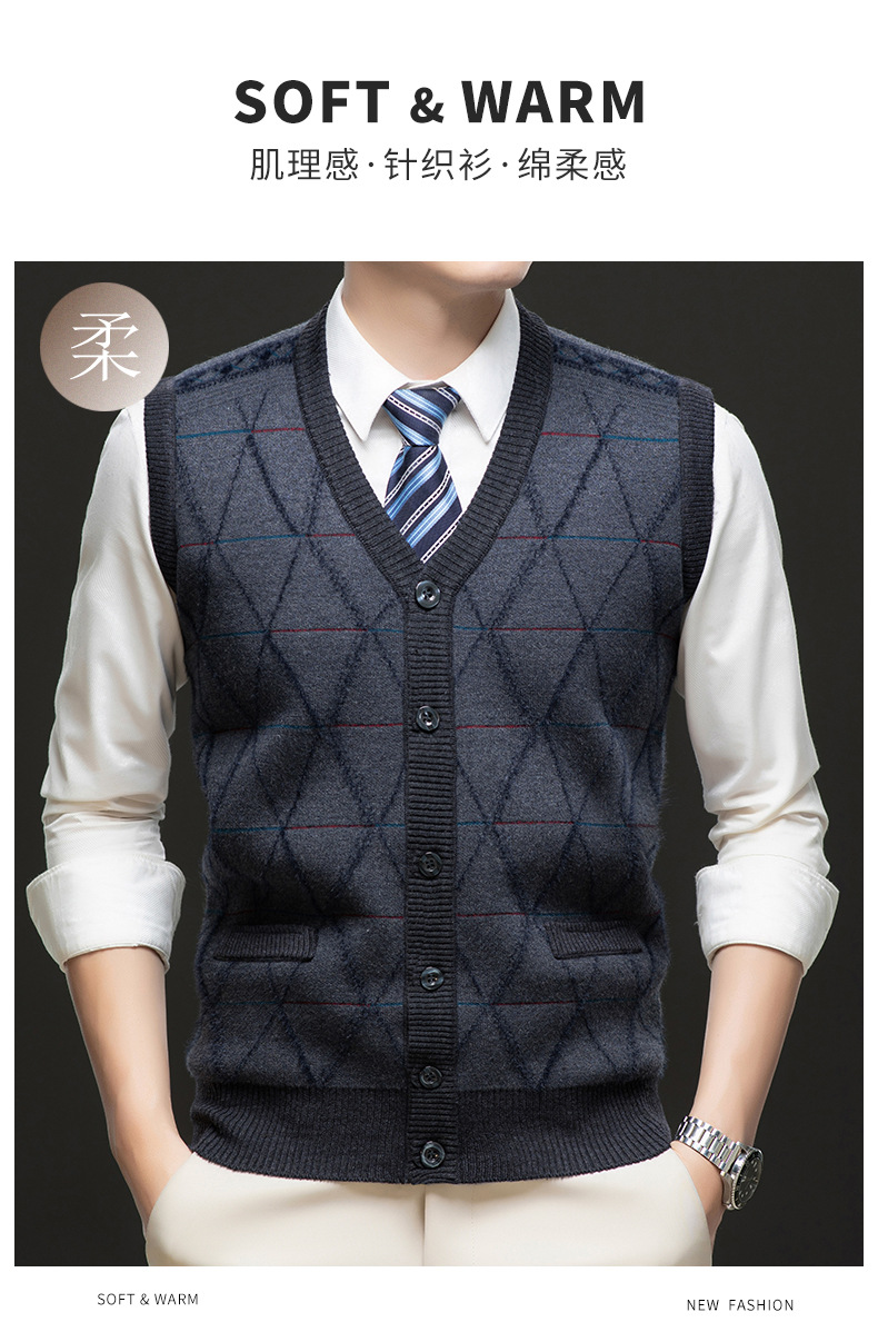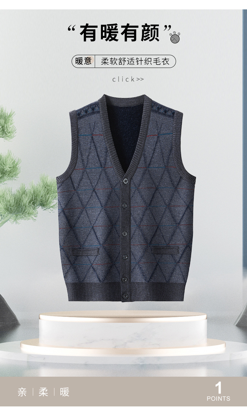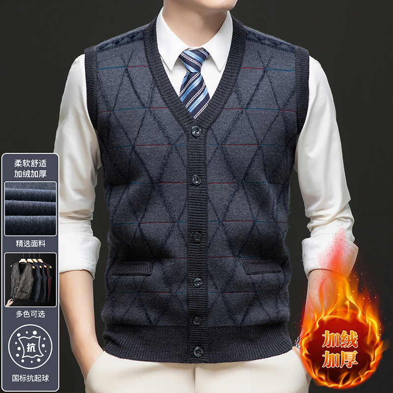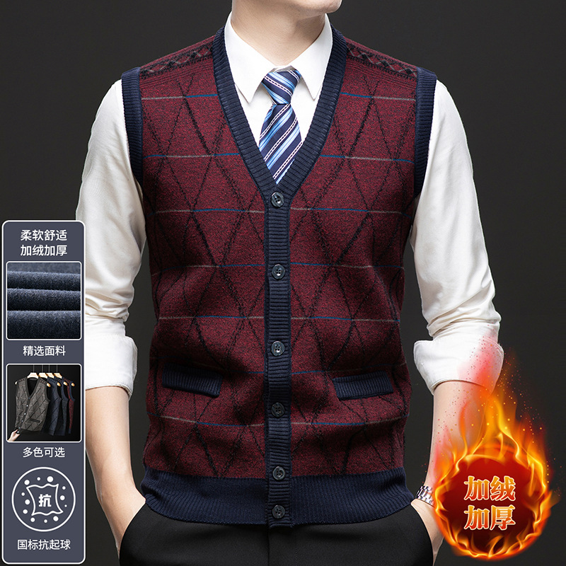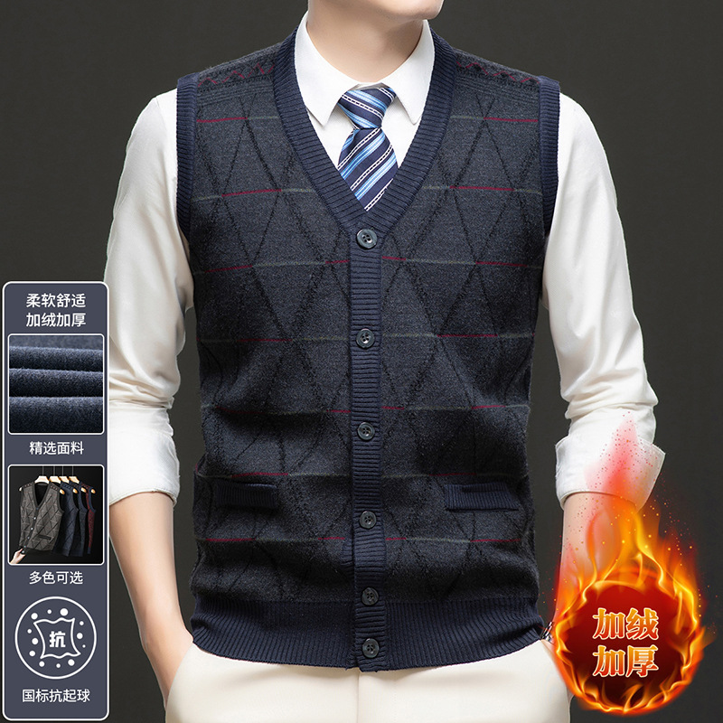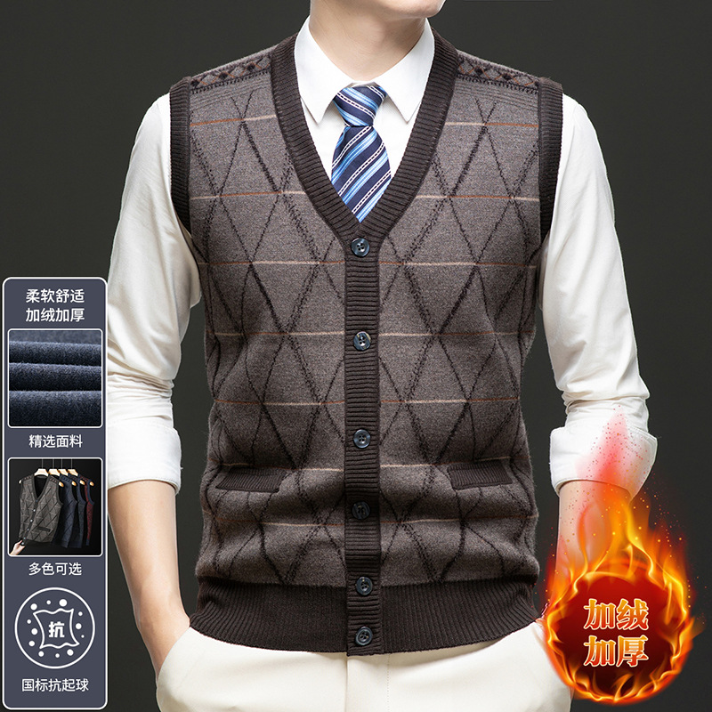 국경 간 남성 니트 민소매 스웨터 2024 겨울 새 기모 따뜻한 중년 남성 양복 조끼스토어 가기