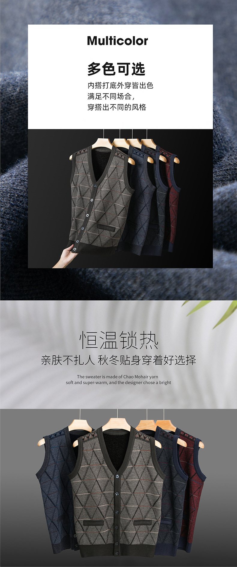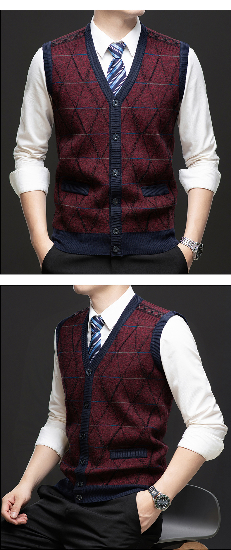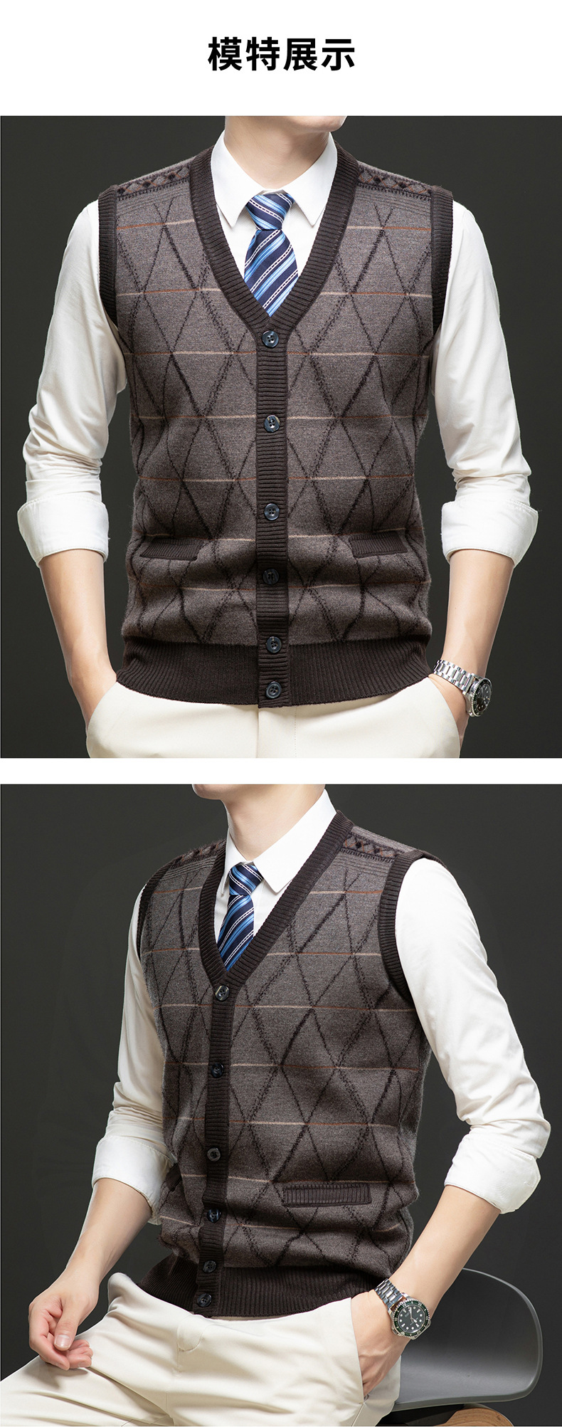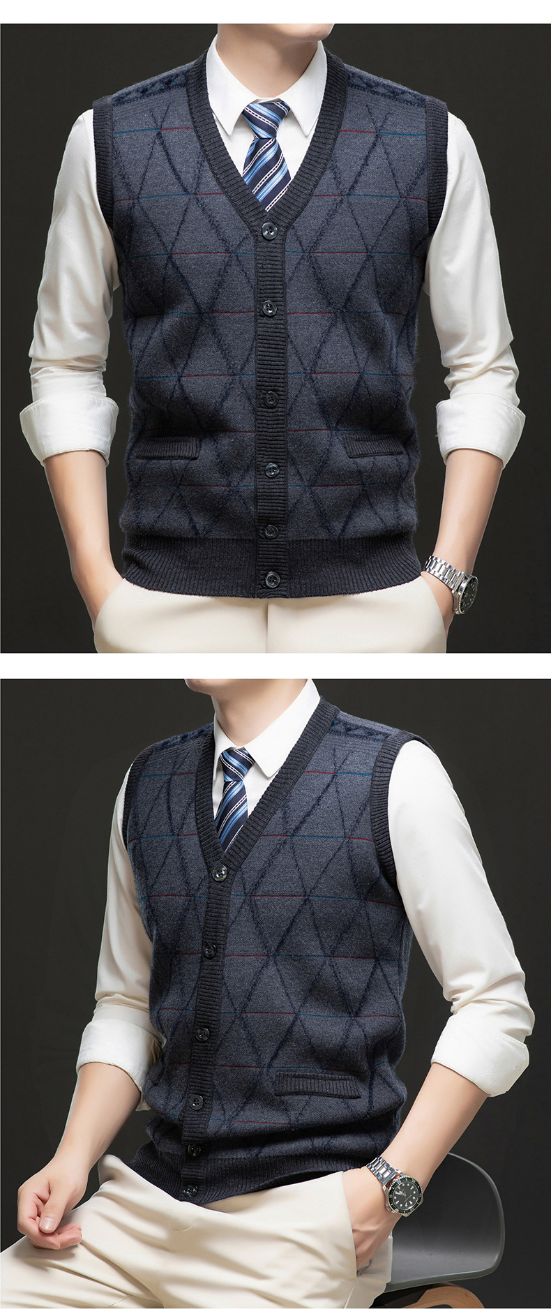 국경 간 남성 니트 민소매 스웨터 2024 겨울 새 기모 따뜻한 중년 남성 양복 조끼스토어 가기
