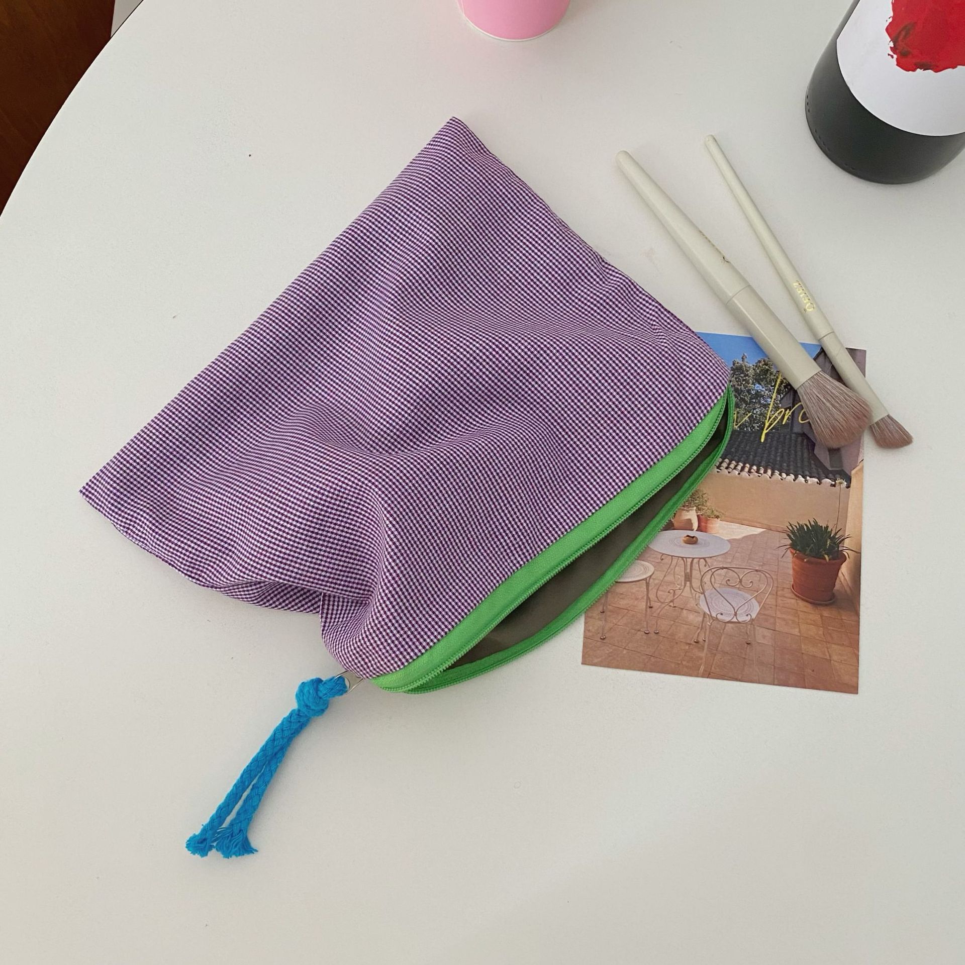 • 파란색과 흰색 격자 무늬 화장품 가방