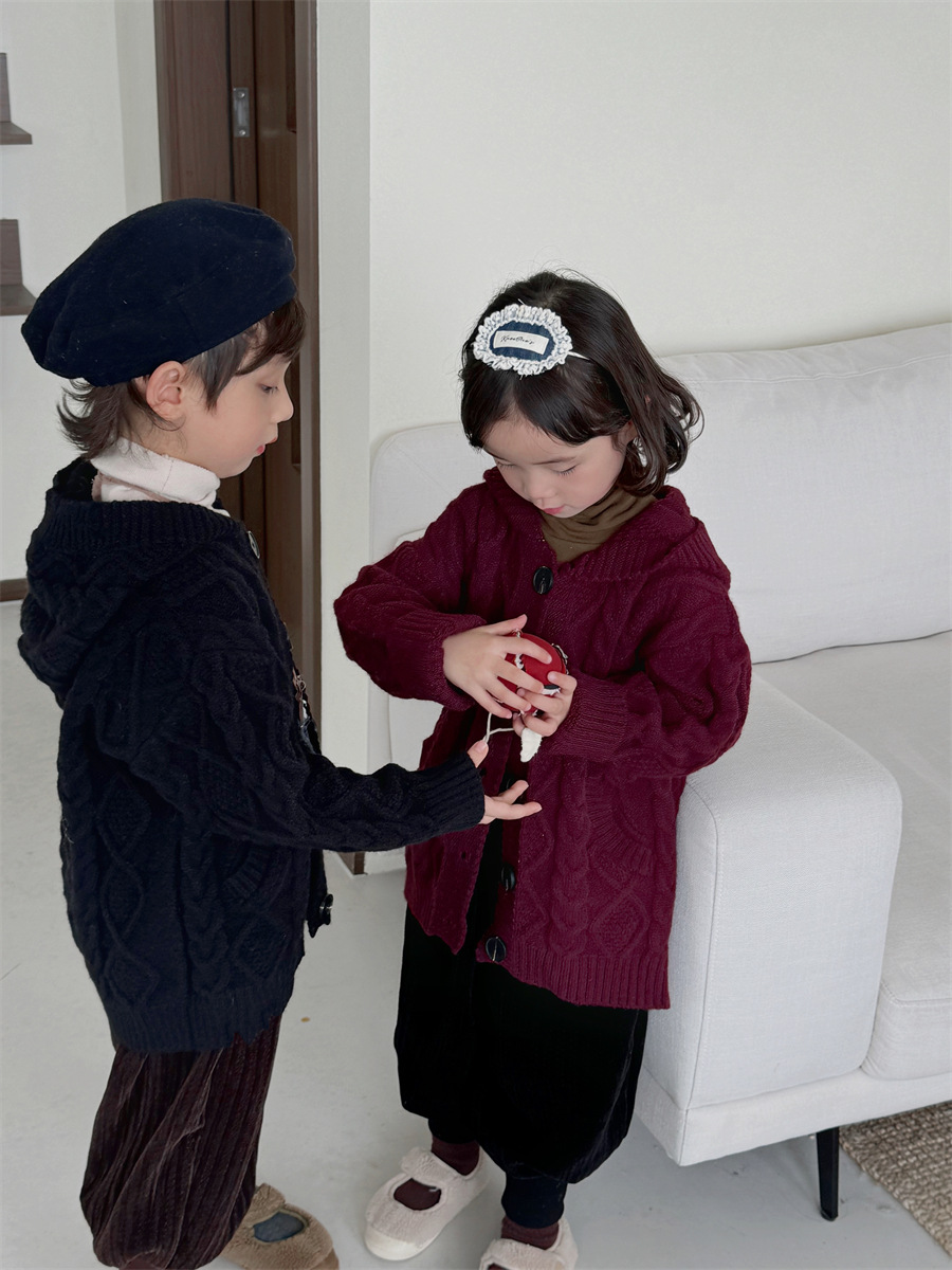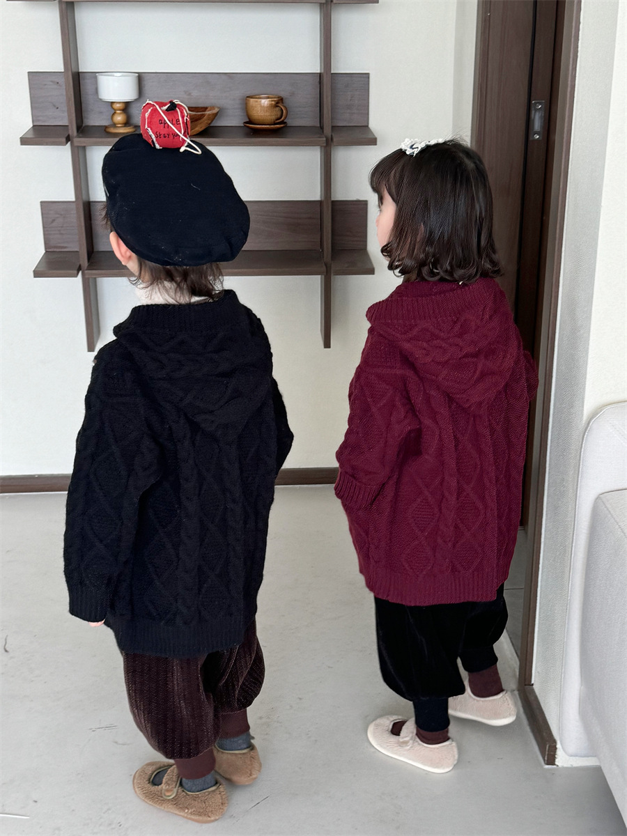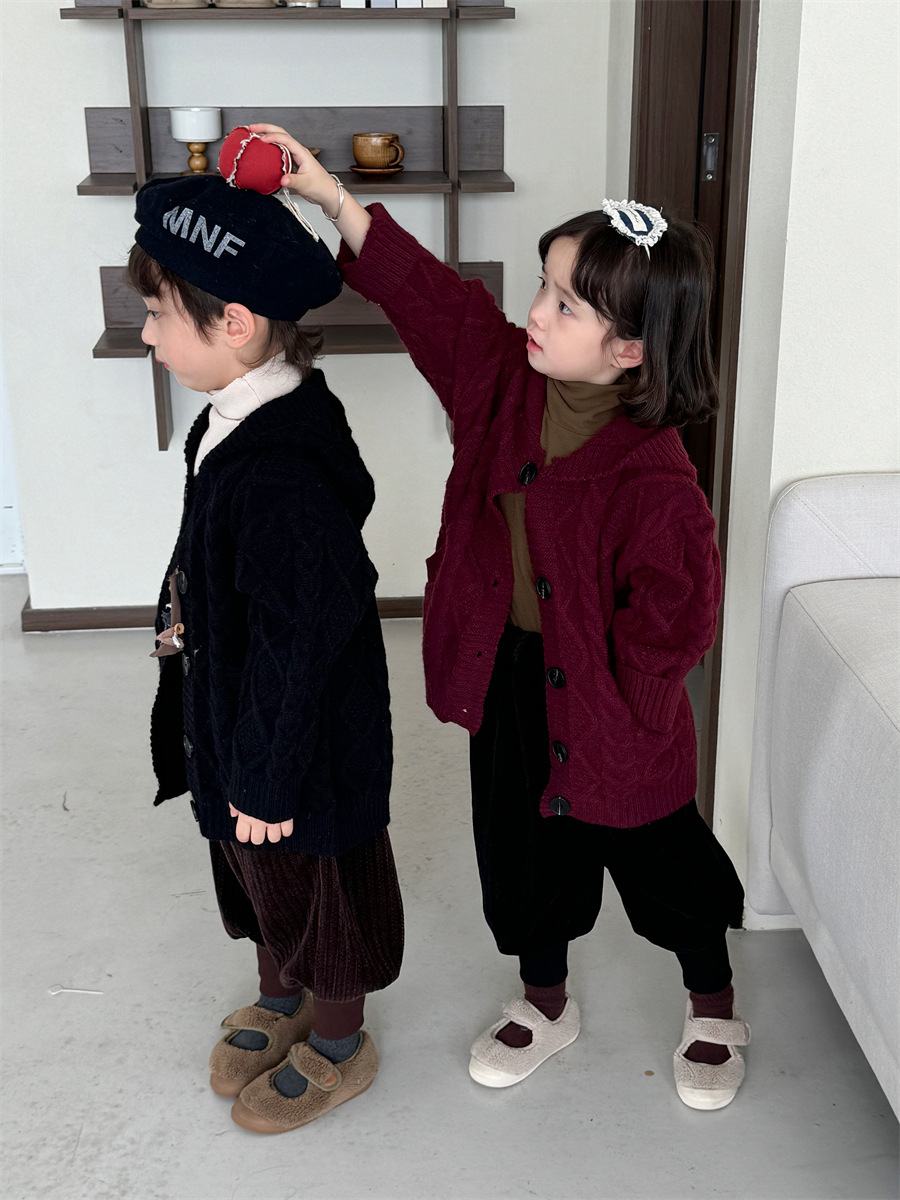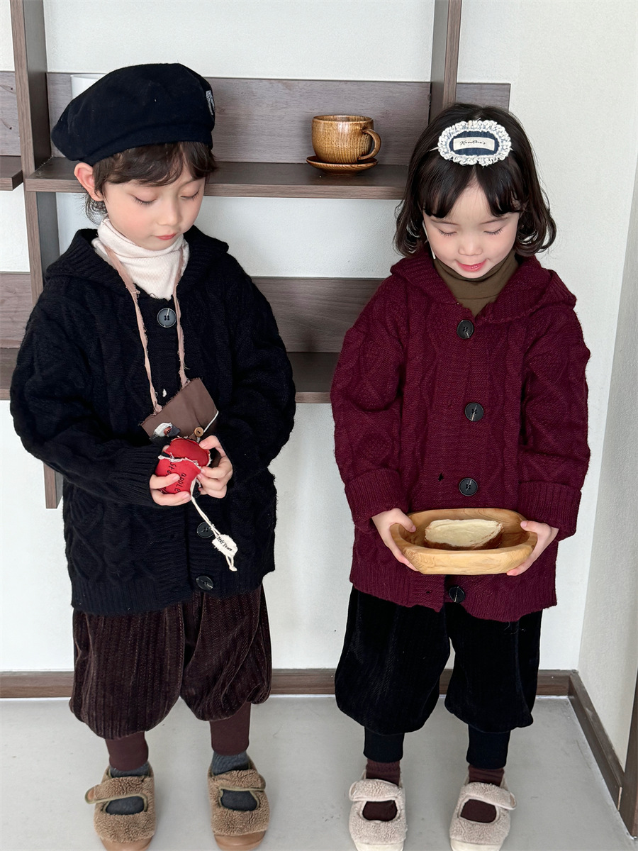 JiaYe 어린이 제품 2025년 가을 신상품 꼬임 니트 가디건 남녀 아기 레트로 스웨터 후드 코트