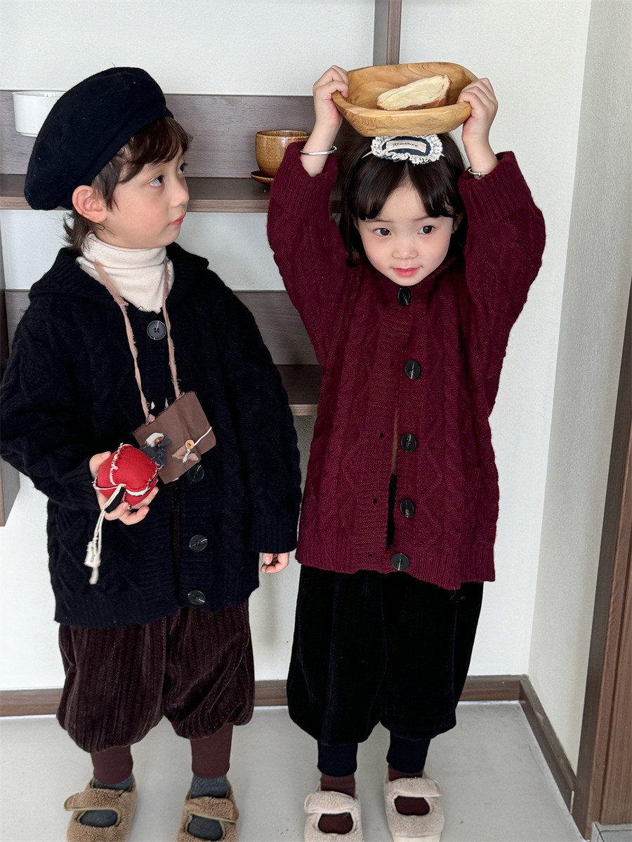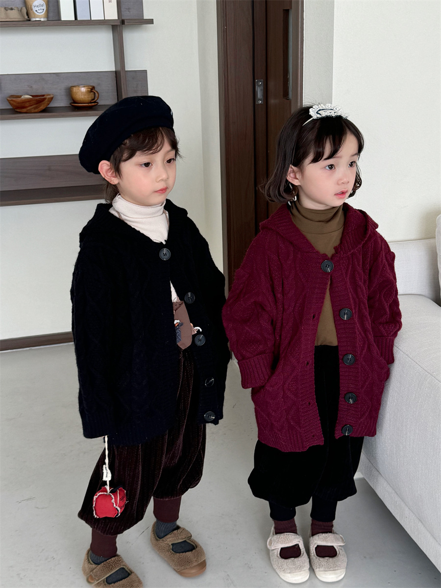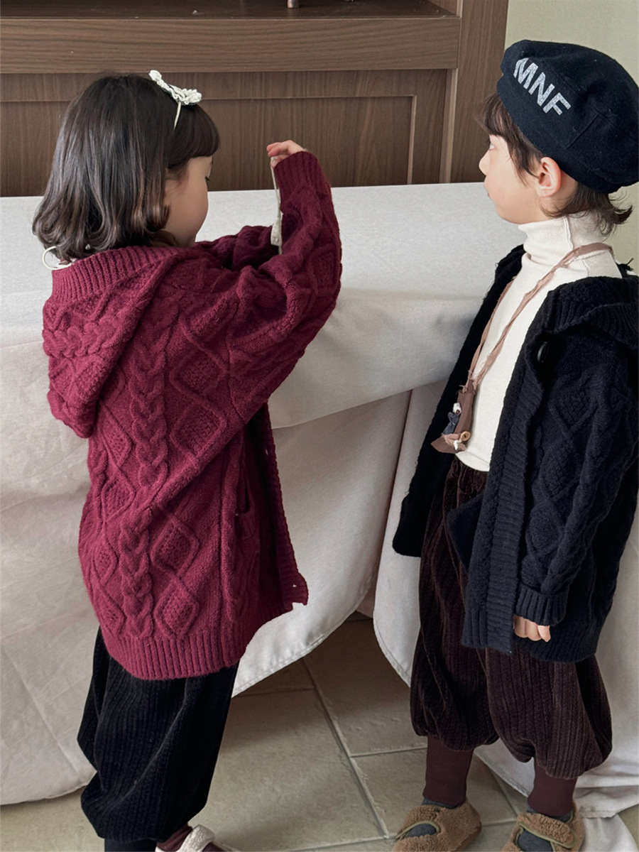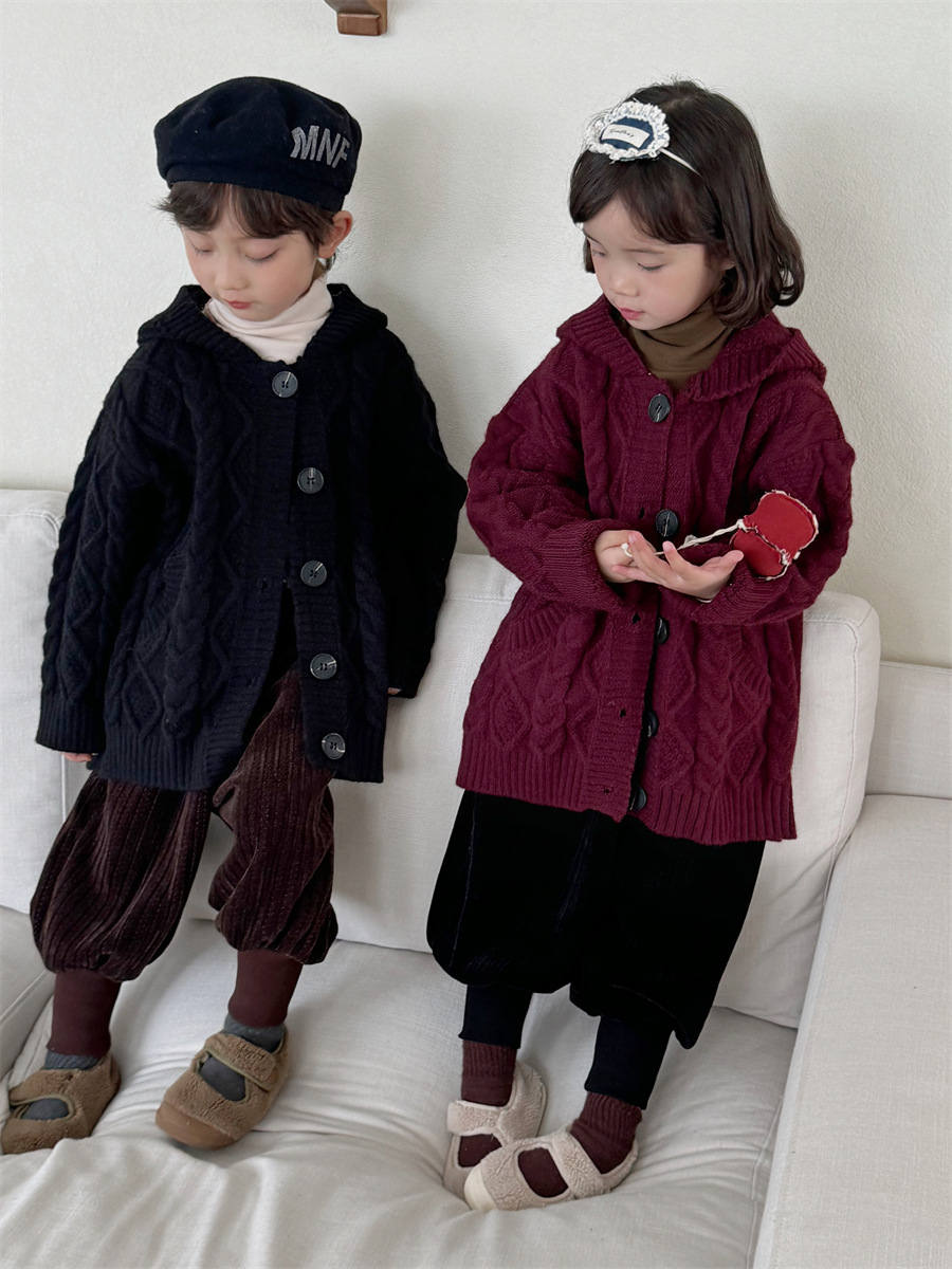 JiaYe 어린이 제품 2025년 가을 신상품 꼬임 니트 가디건 남녀 아기 레트로 스웨터 후드 코트