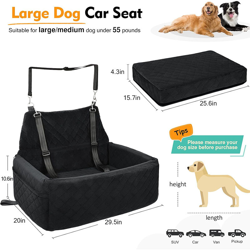 • 【大型狗狗汽车座椅】尺寸为 29.5 英寸(长)x 20 英寸(宽)x 20 英寸(高),这款狗狗汽车座椅可以容纳体重不超过 55 磅的大型或中型犬或两只体重不超过 25 磅的小型宠物,适用于几乎所有类型的车辆,如汽车、卡车、SUV,您可以轻松地将其安装在空间更大的汽车后座或后备箱中。