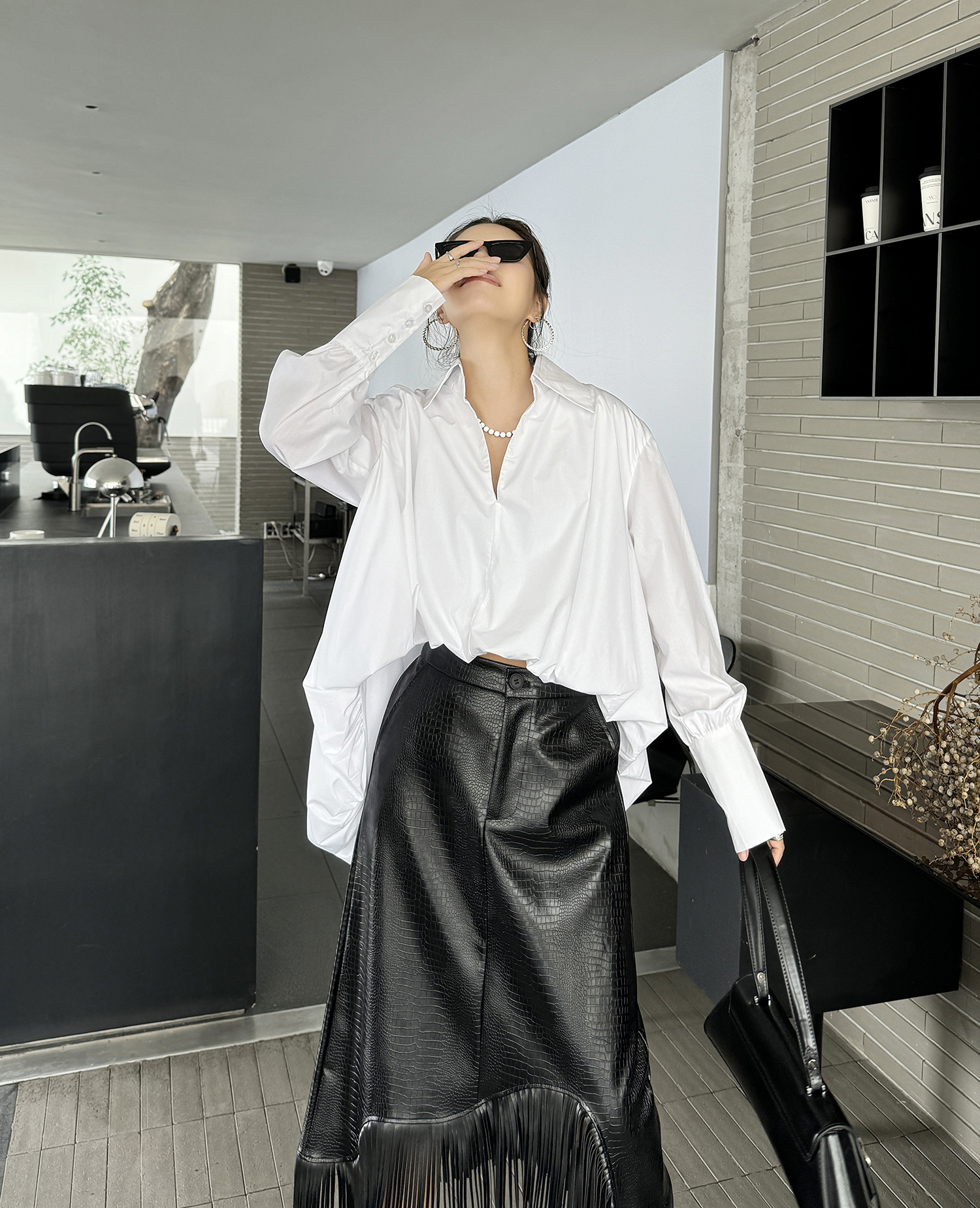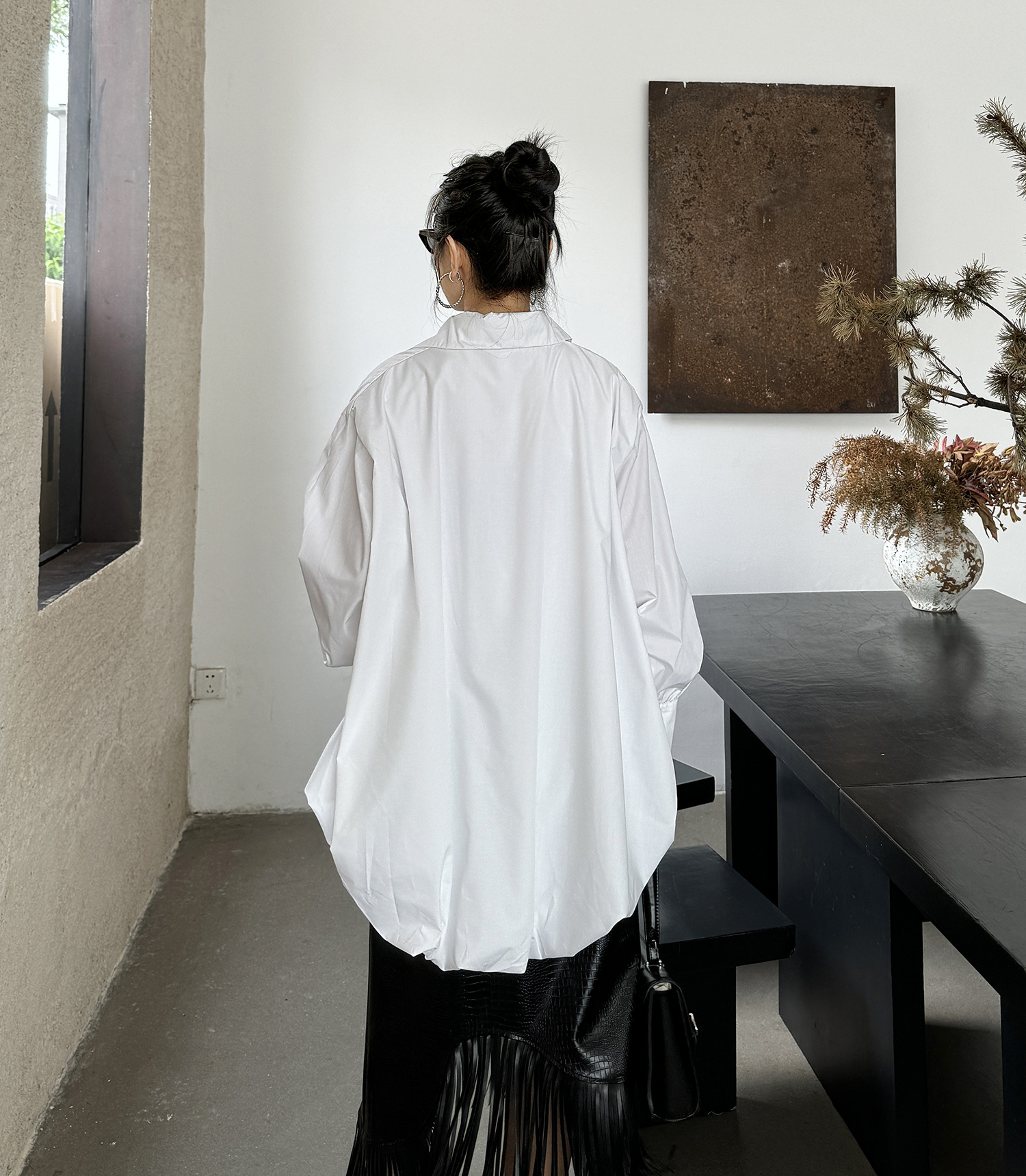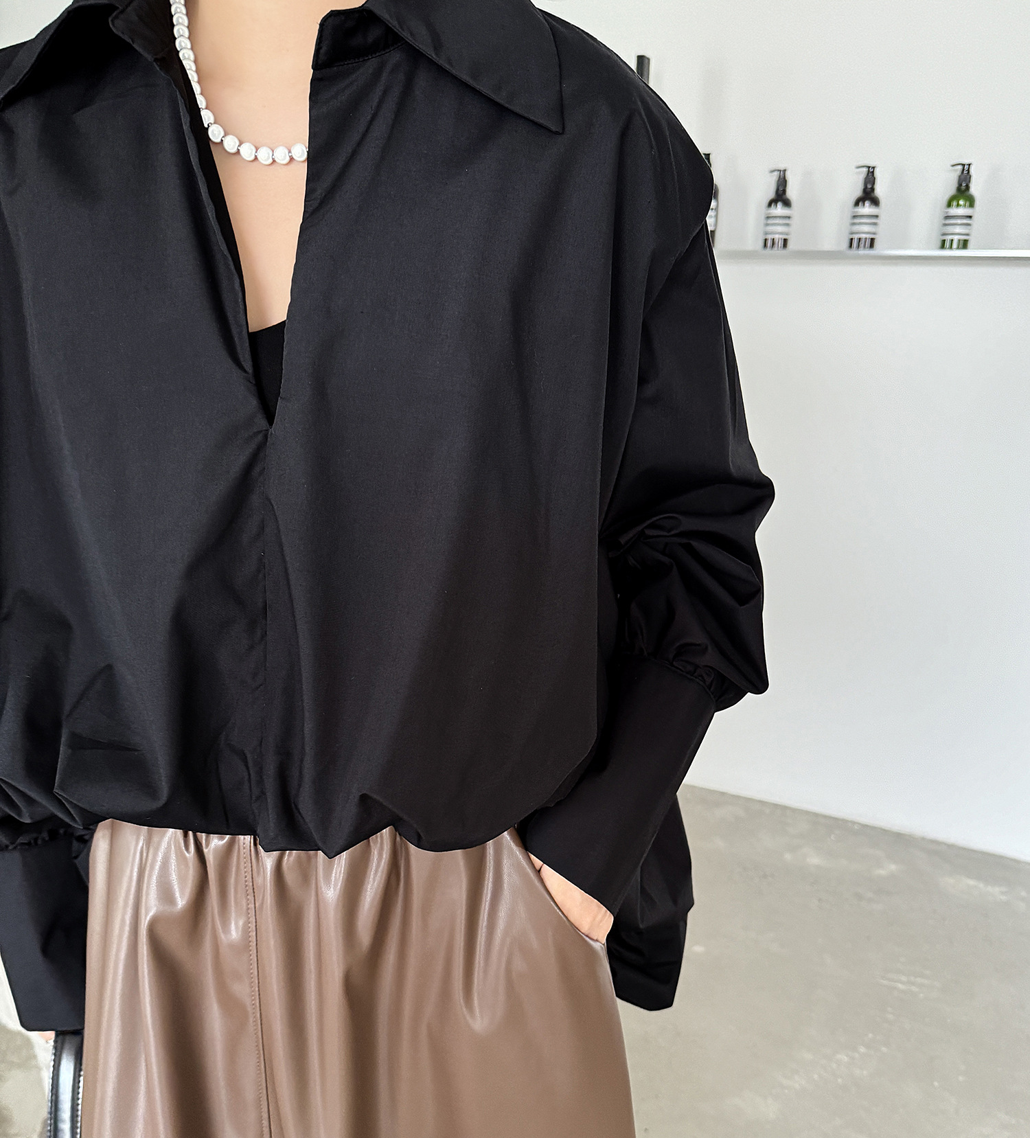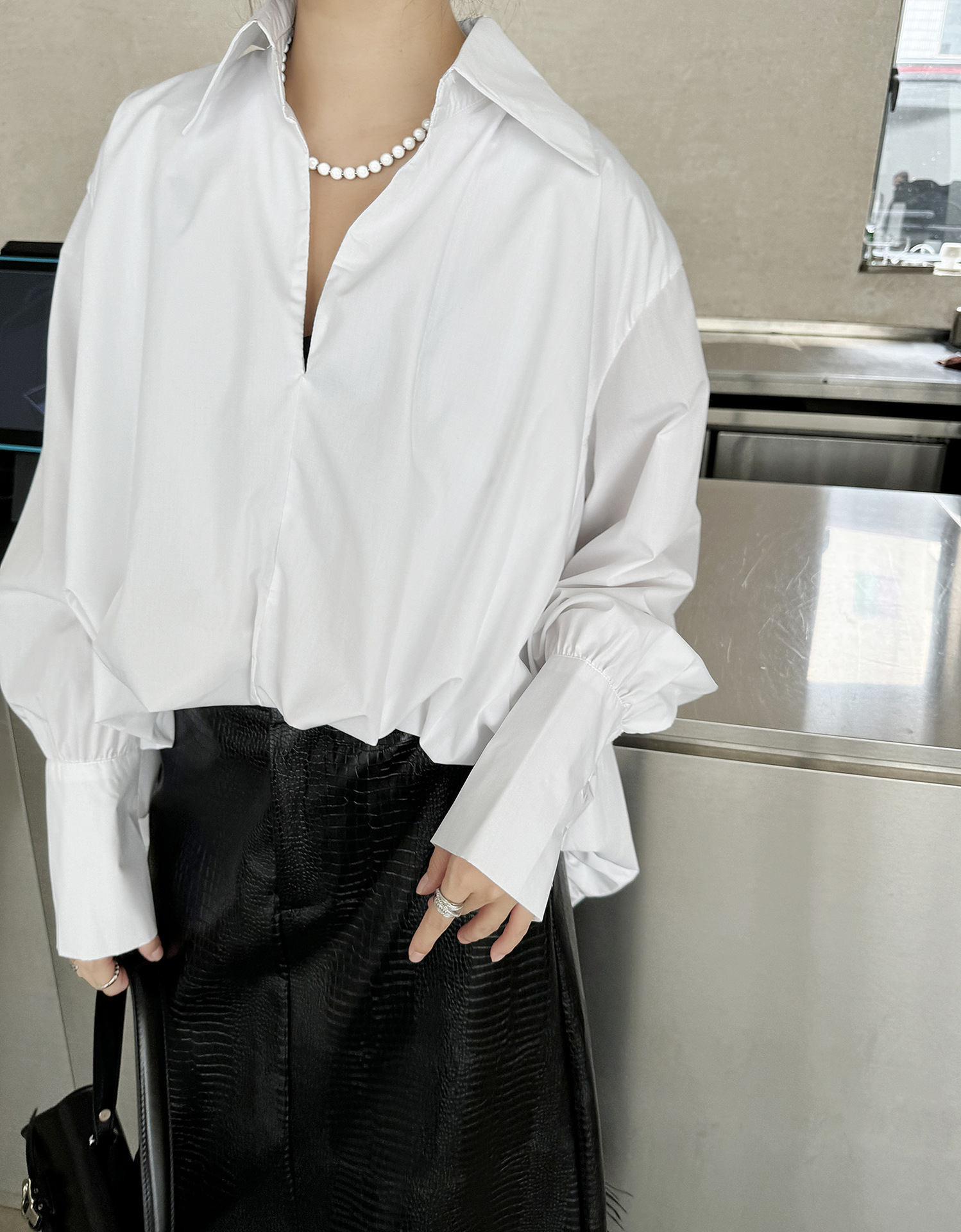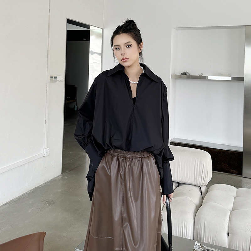 프렌치 스타일 브이넥 게으른 불규칙한 주름 긴팔 셔츠 여성 가을 신작 루즈 통근 맞춤형 탑스토어 가기