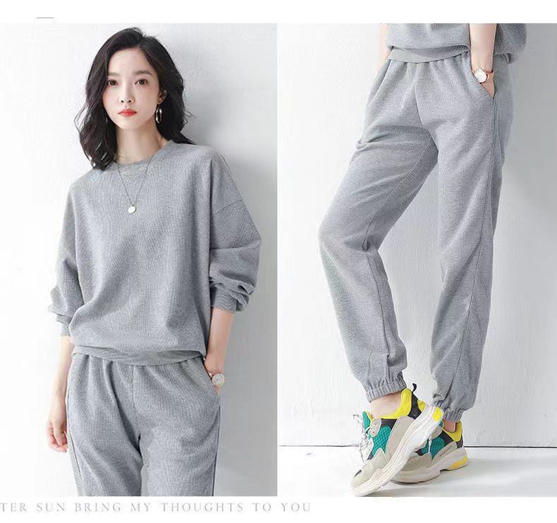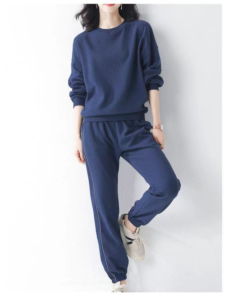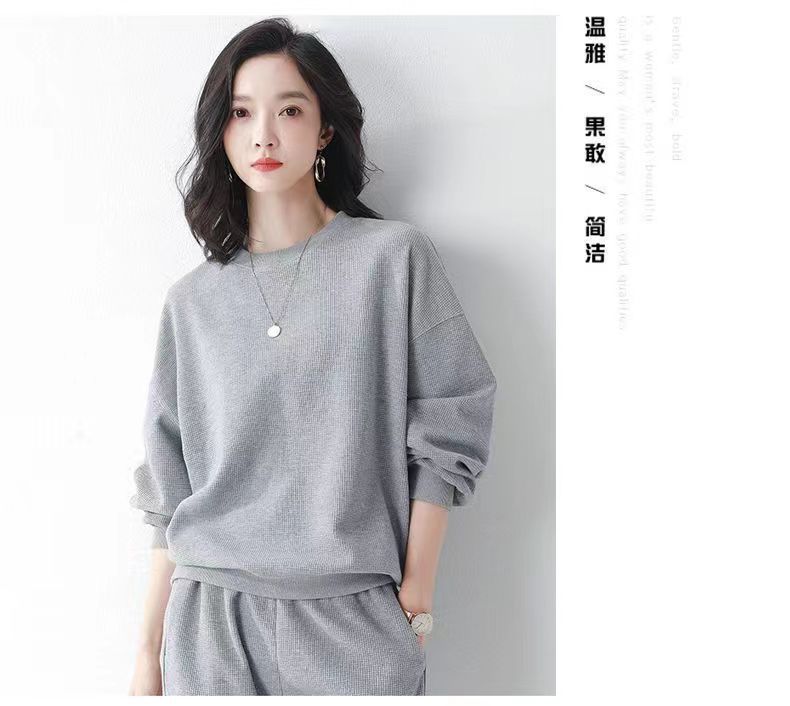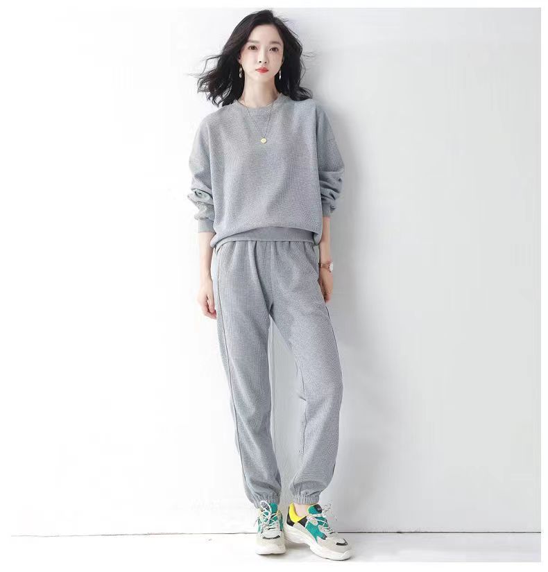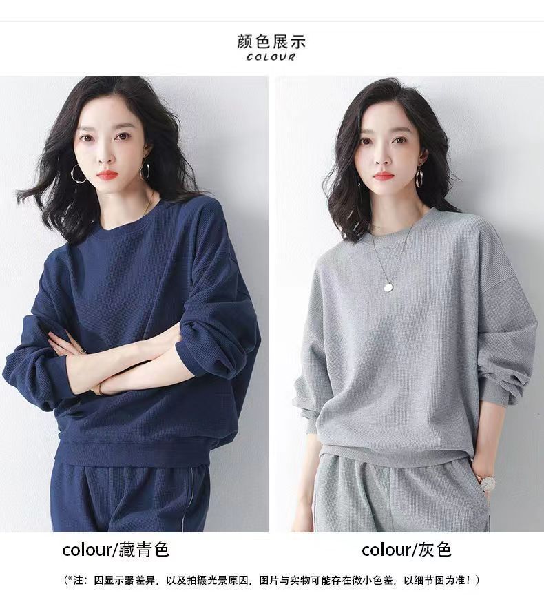 코튼 와플 스포츠 세트 여성의 2024 년 봄과 가을 새로운 패션 라운드 넥 긴 소매 캐주얼 러닝 의류 여성용 스웨터스토어 가기