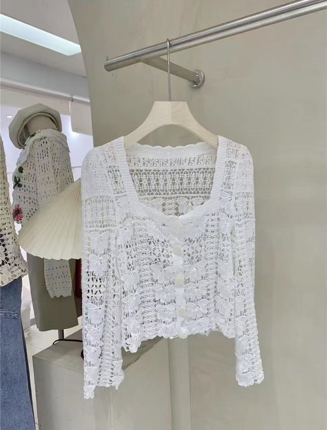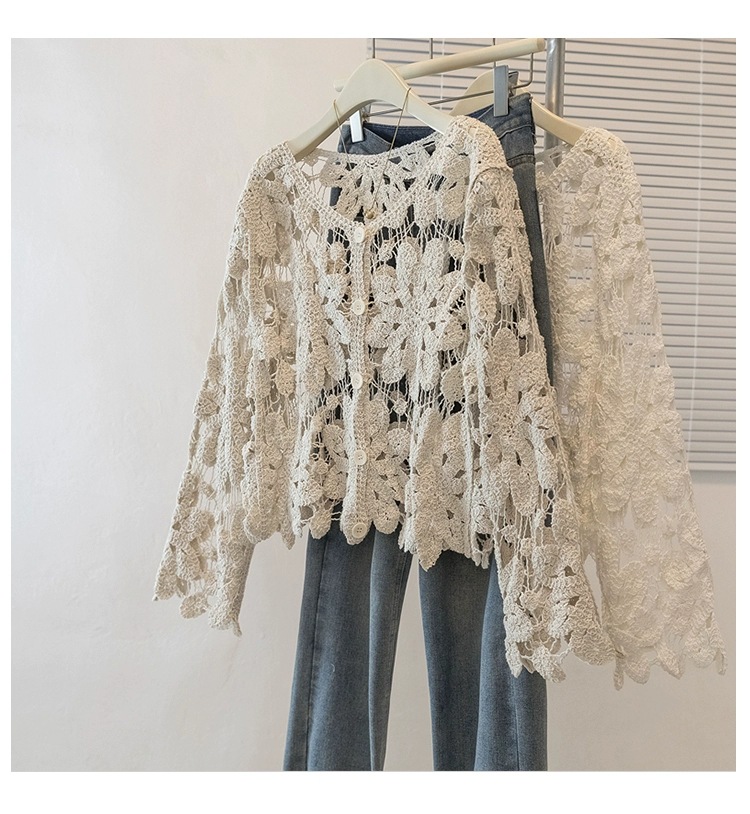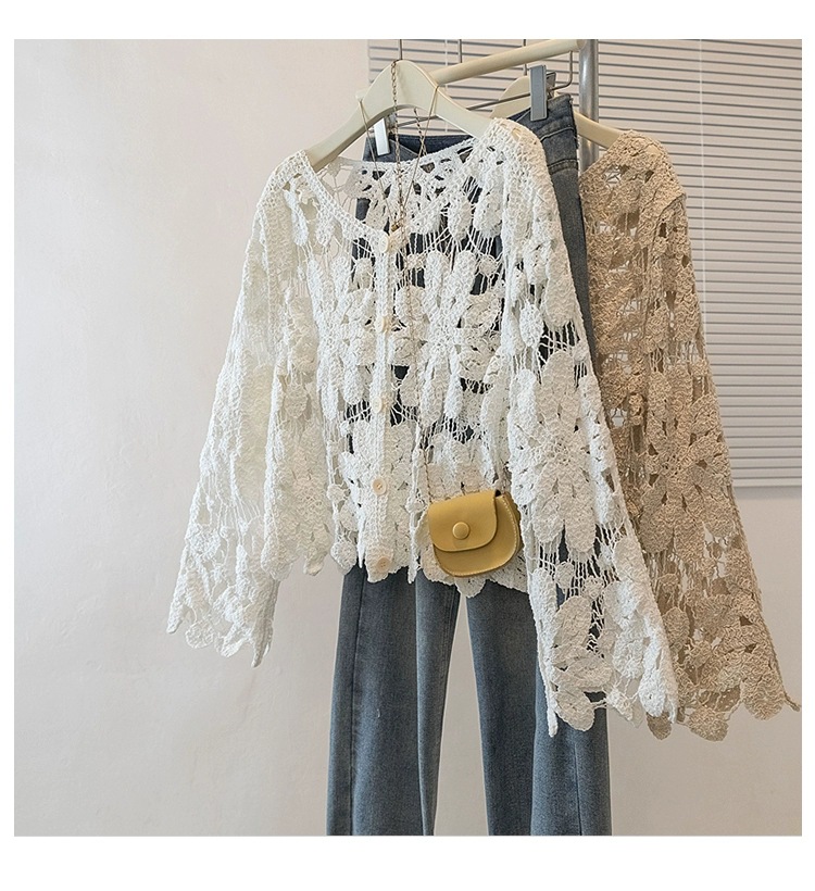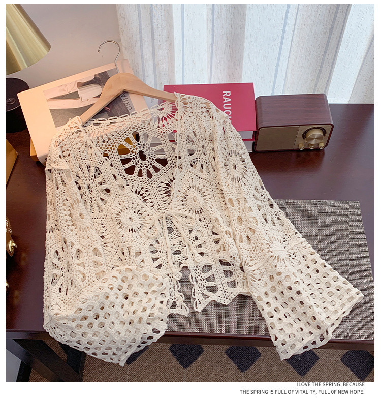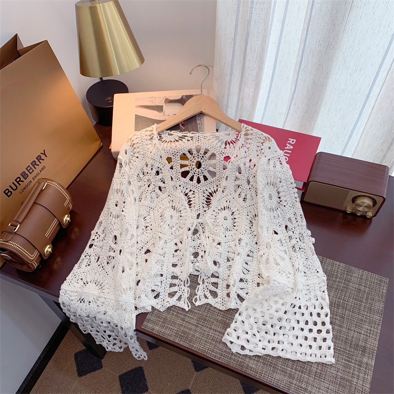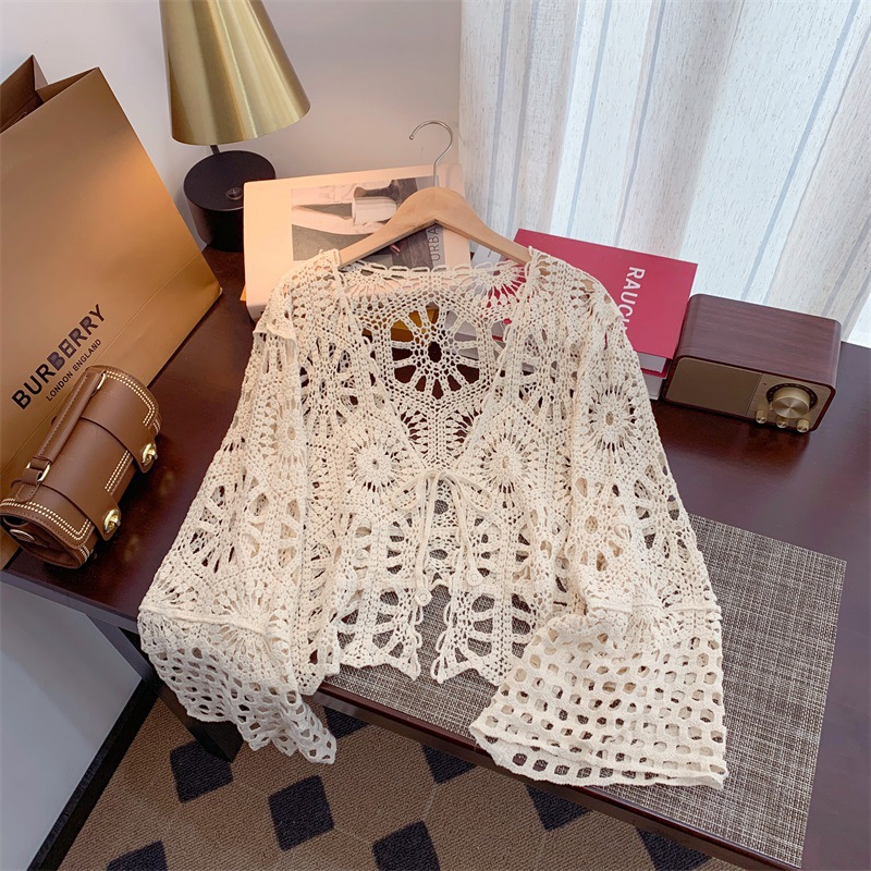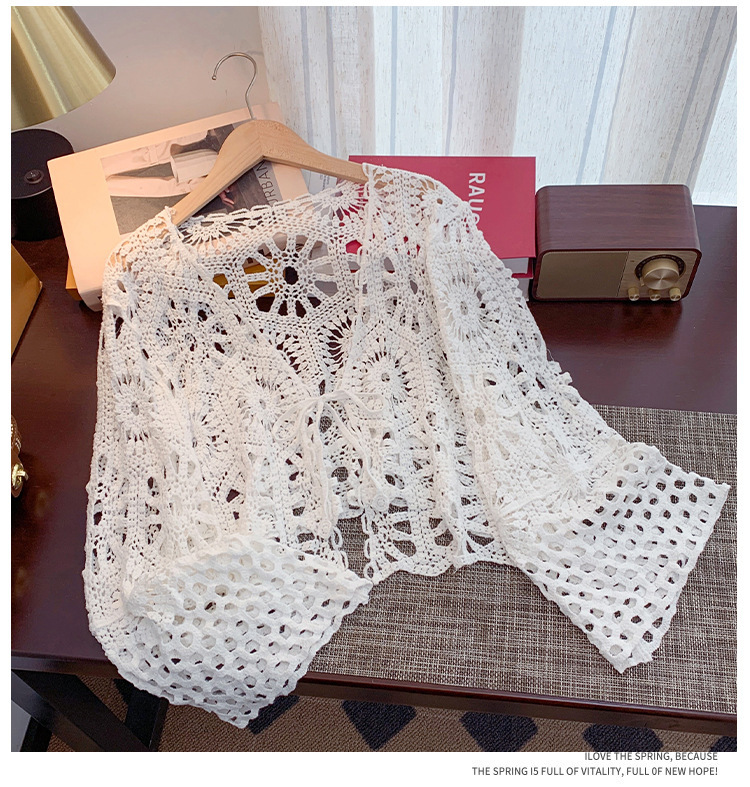 2025 여름 얇은 스웨터 여성 자수 중공 긴팔 비치웨어 여성 탑 재킷 외부 다용도스토어 가기
