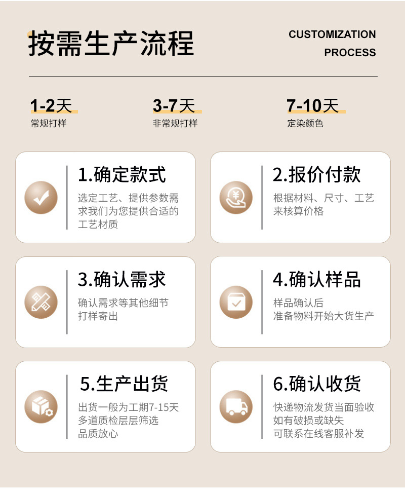【定制】:请将产品的款式、数量、规格、材料类别、制作工艺等告诉客服人员,便于我们准确报价。定制类产品根据工艺和数量的不同