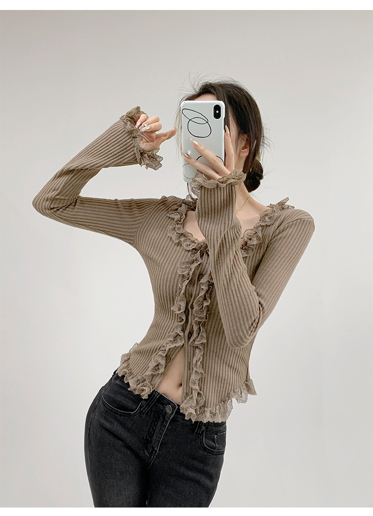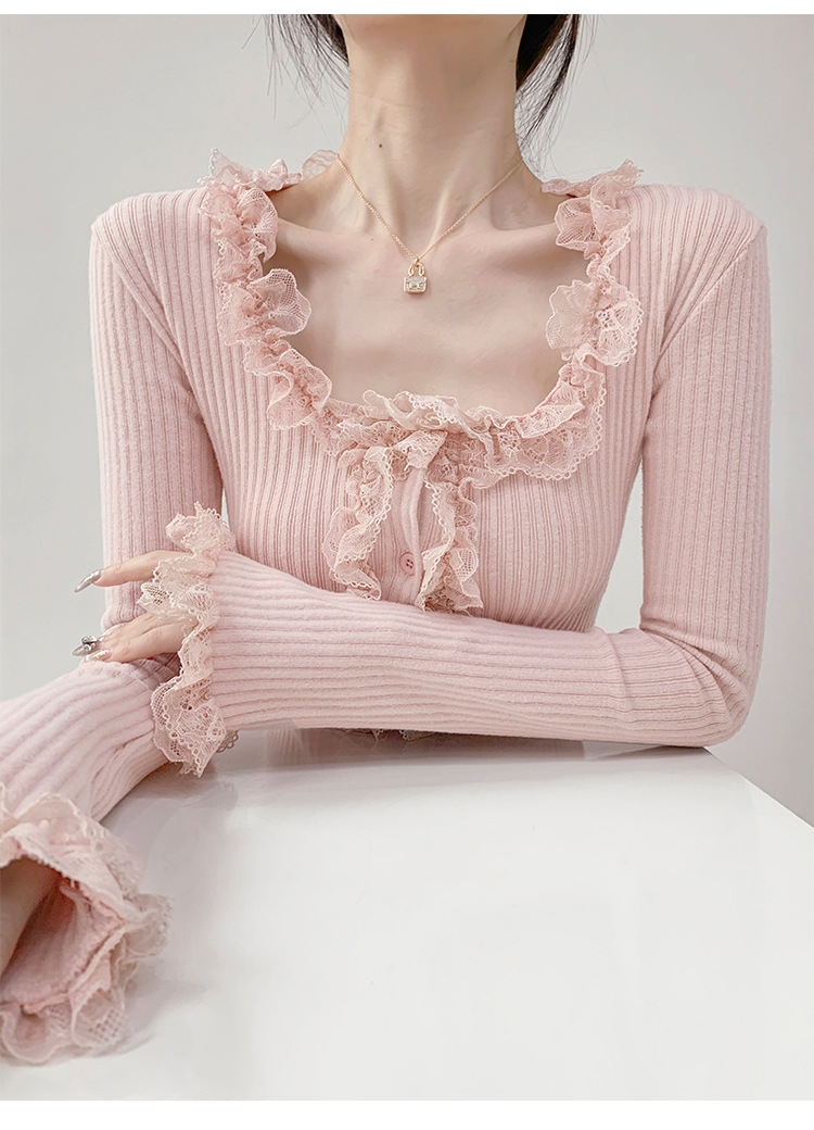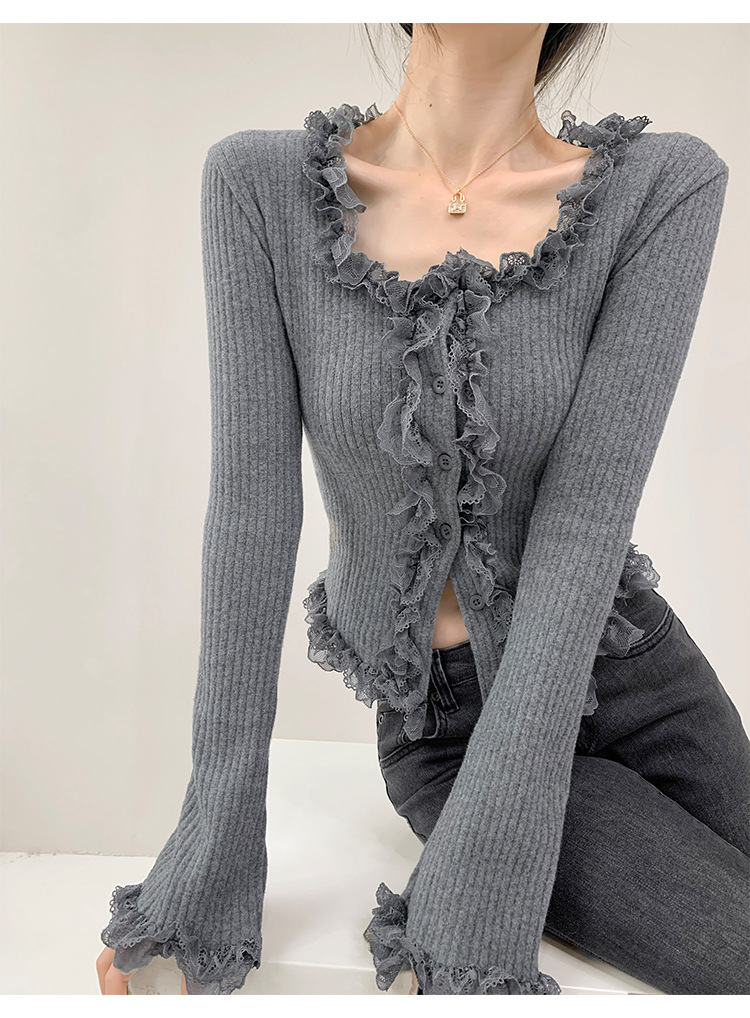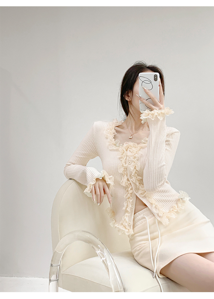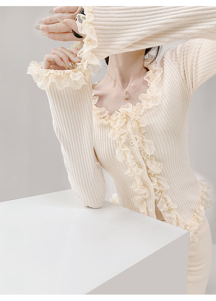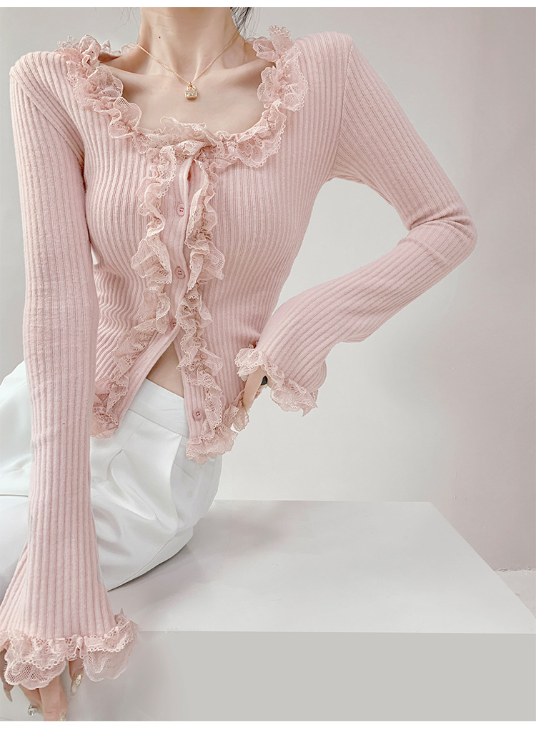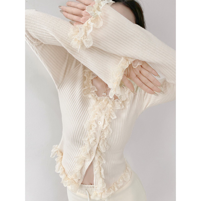 프랑스 스타일 퓨어 V 넥 레이스 니트 카디건 여성의 봄과 가을 새로운 솔리드 컬러 슬림 핏 슬리밍 아우터웨어 탑
