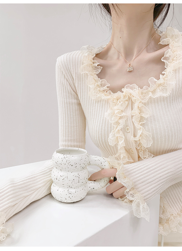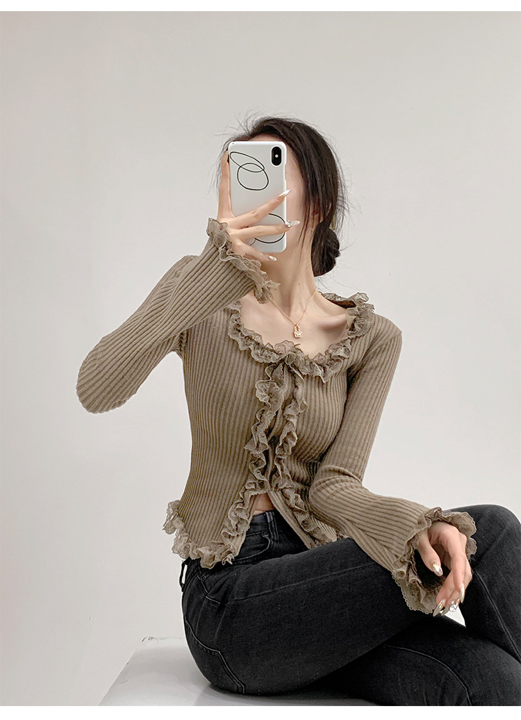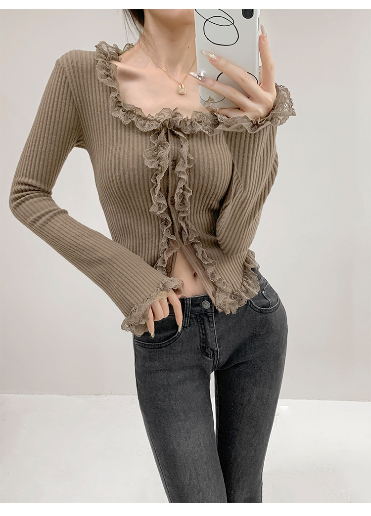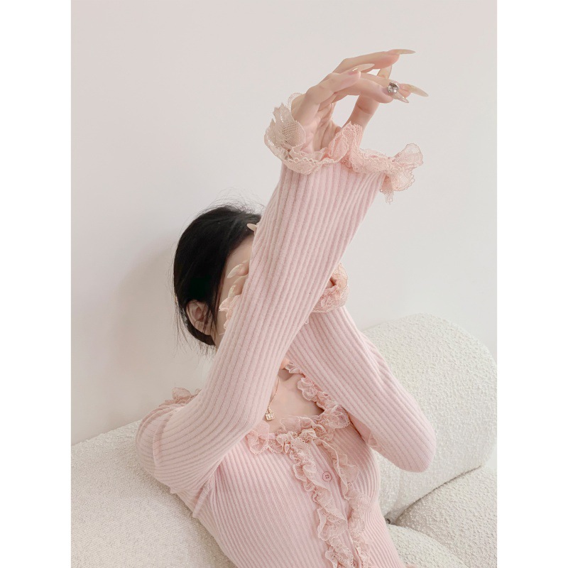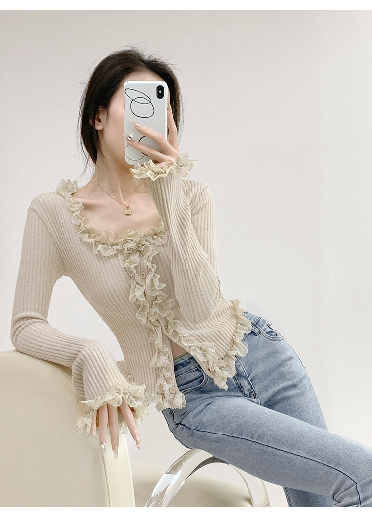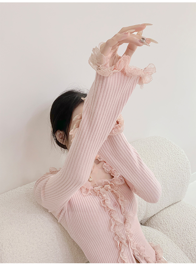 프랑스 스타일 퓨어 V 넥 레이스 니트 카디건 여성의 봄과 가을 새로운 솔리드 컬러 슬림 핏 슬리밍 아우터웨어 탑