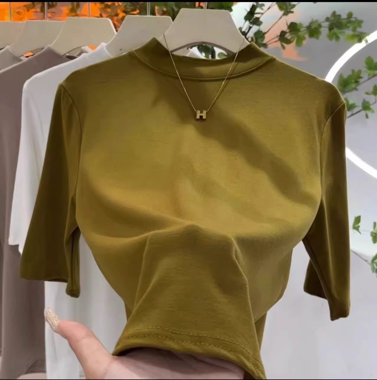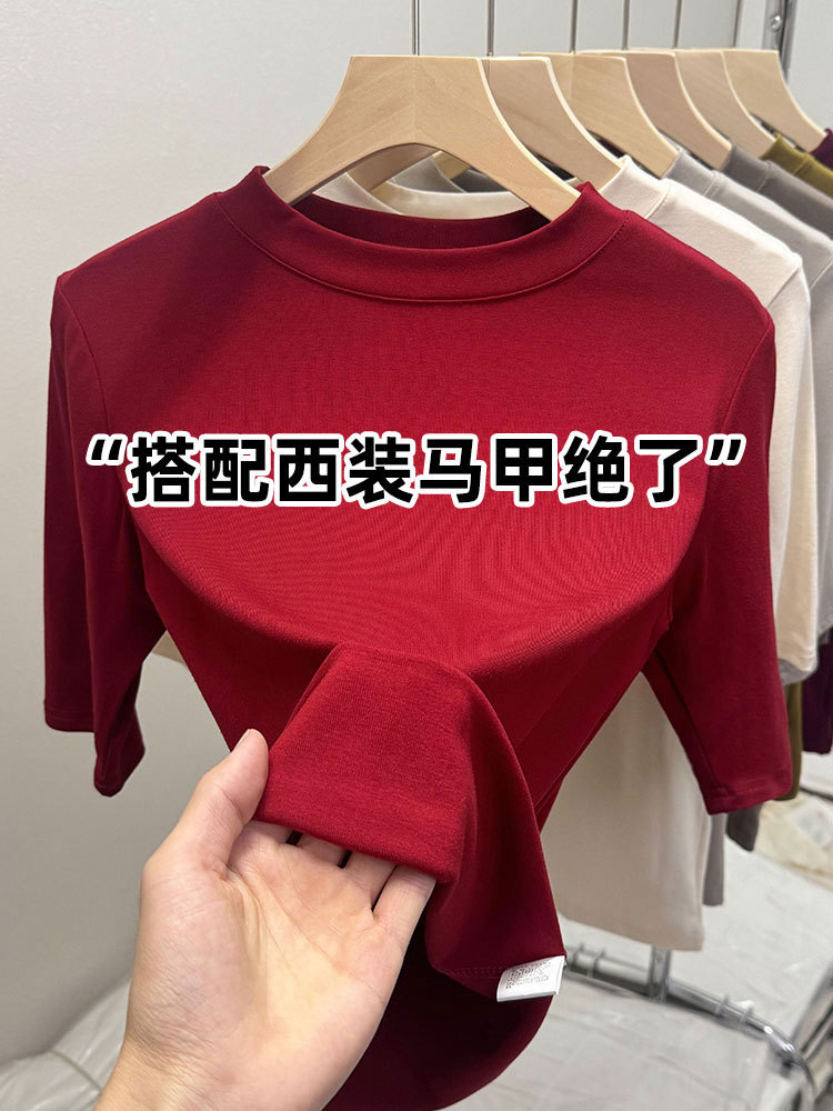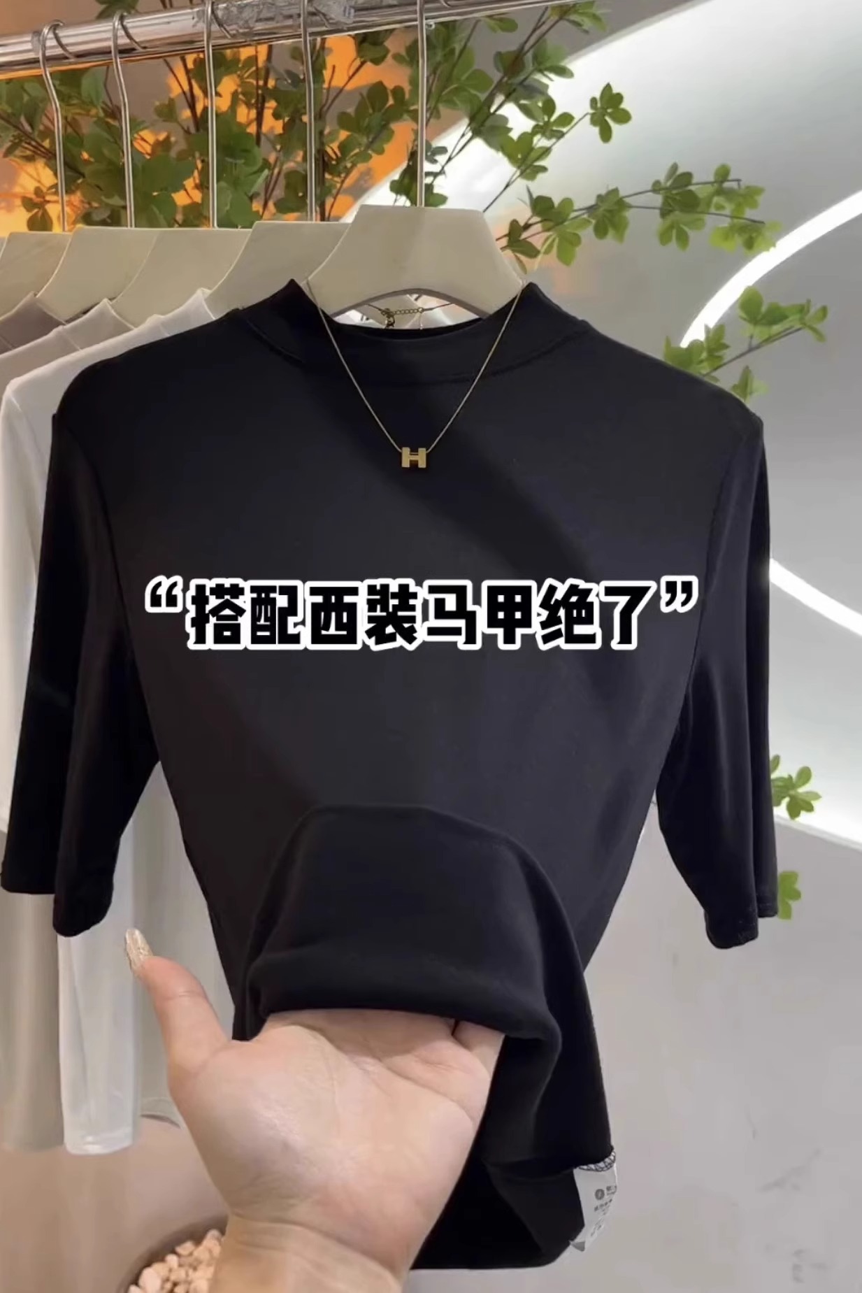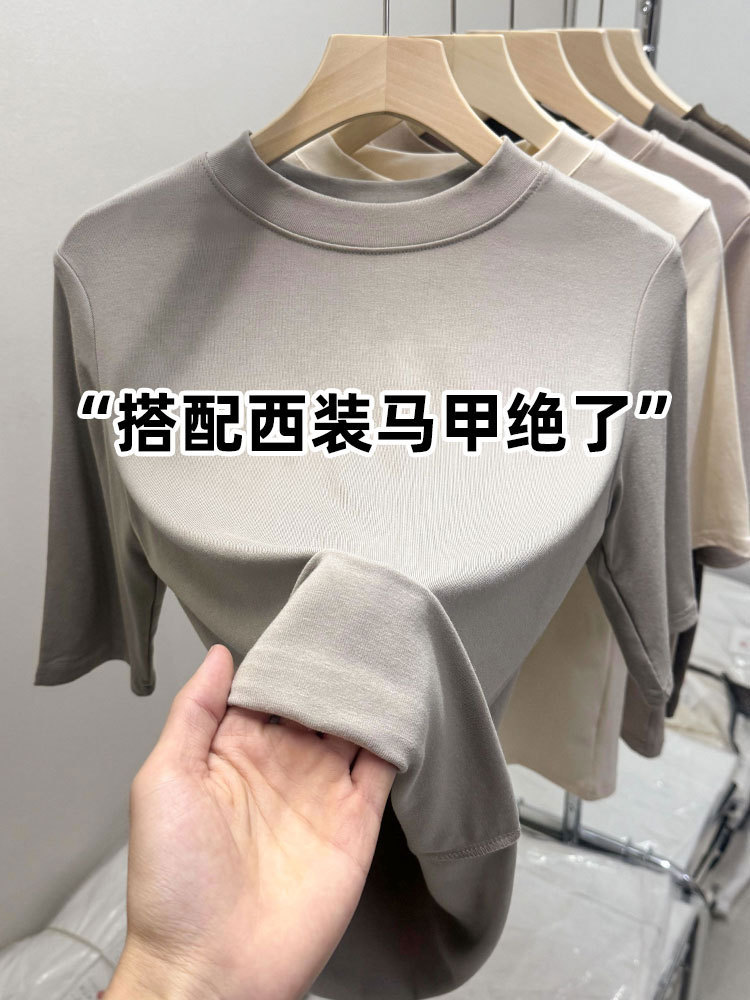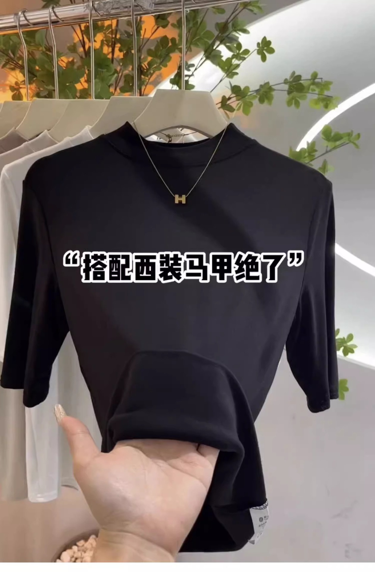 2024新款半高领纯色五分袖内搭打底衫女春季百搭显瘦气质上衣T恤
