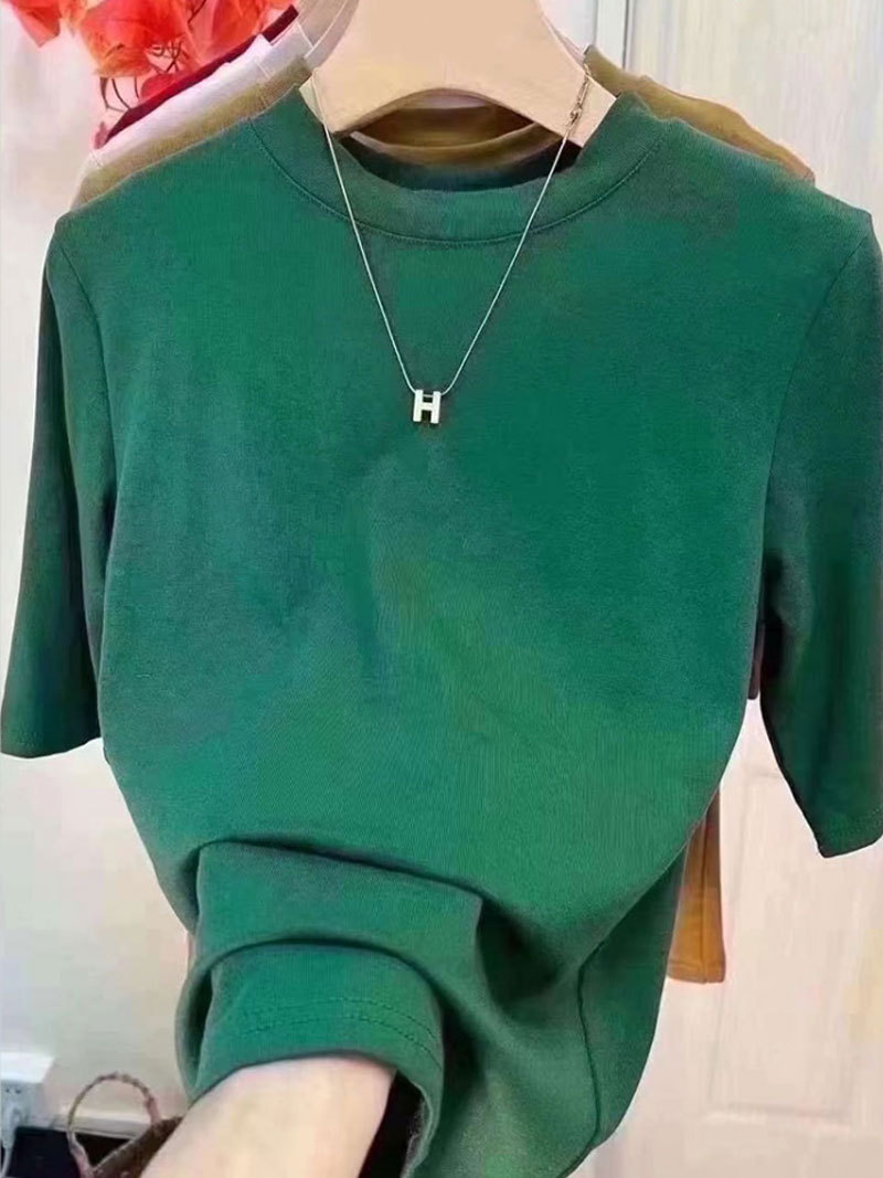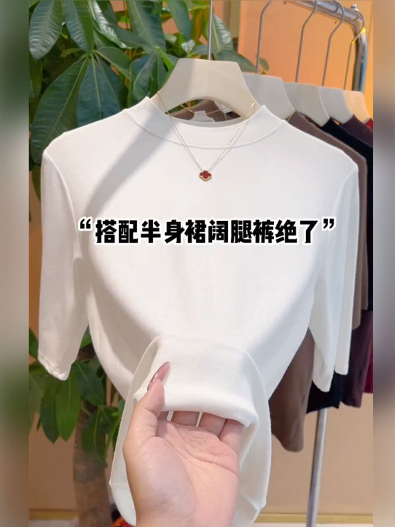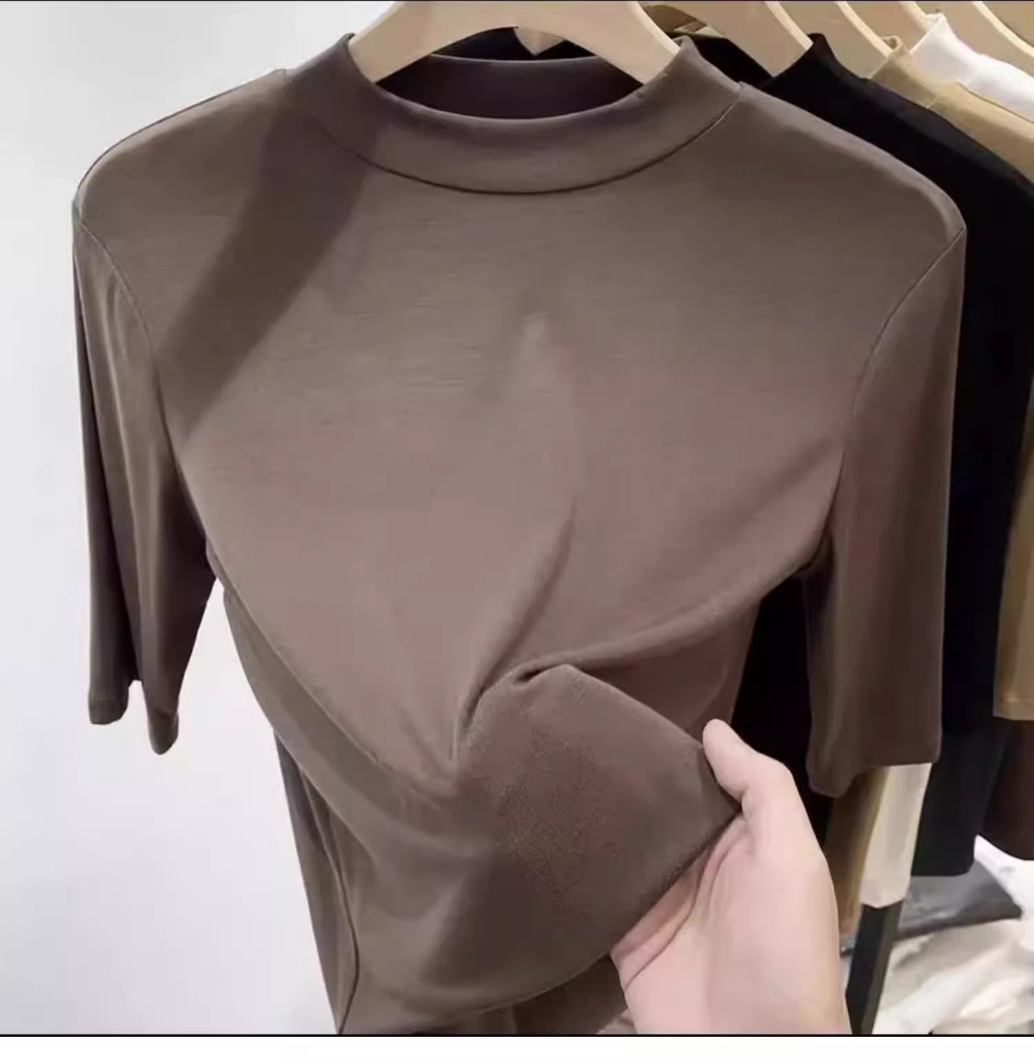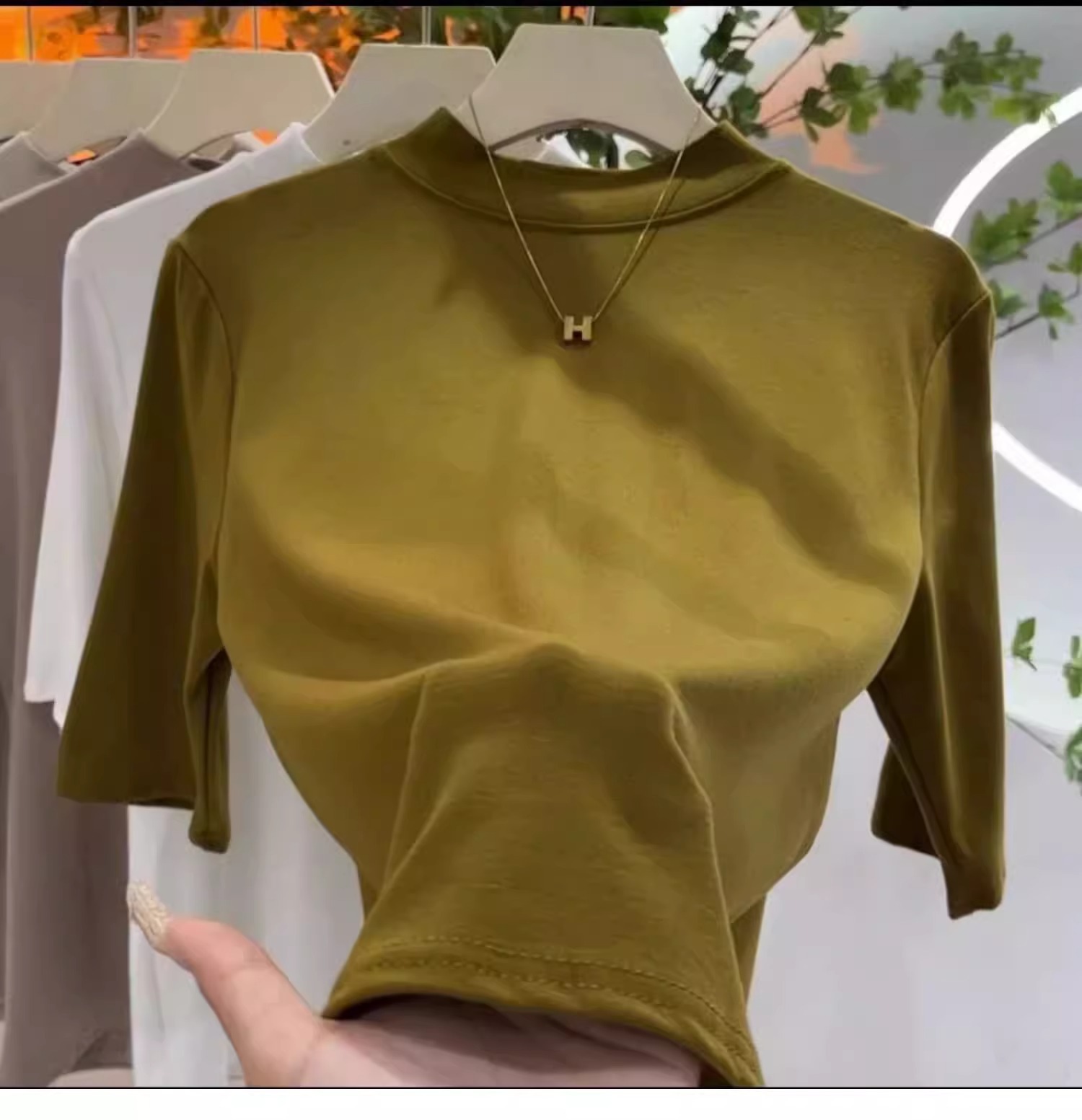 2024新款半高领纯色五分袖内搭打底衫女春季百搭显瘦气质上衣T恤
