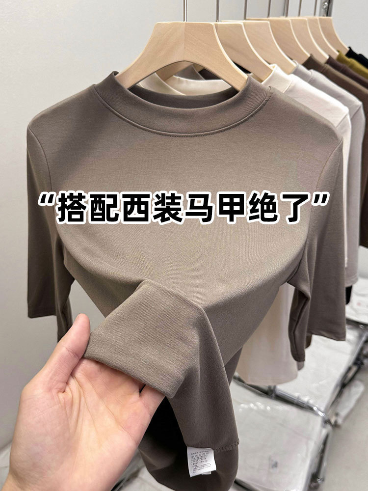 2024秋冬新款加磨毛内搭小立领纯色简约百搭显瘦半高领打底t恤女