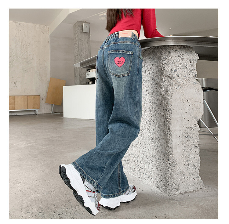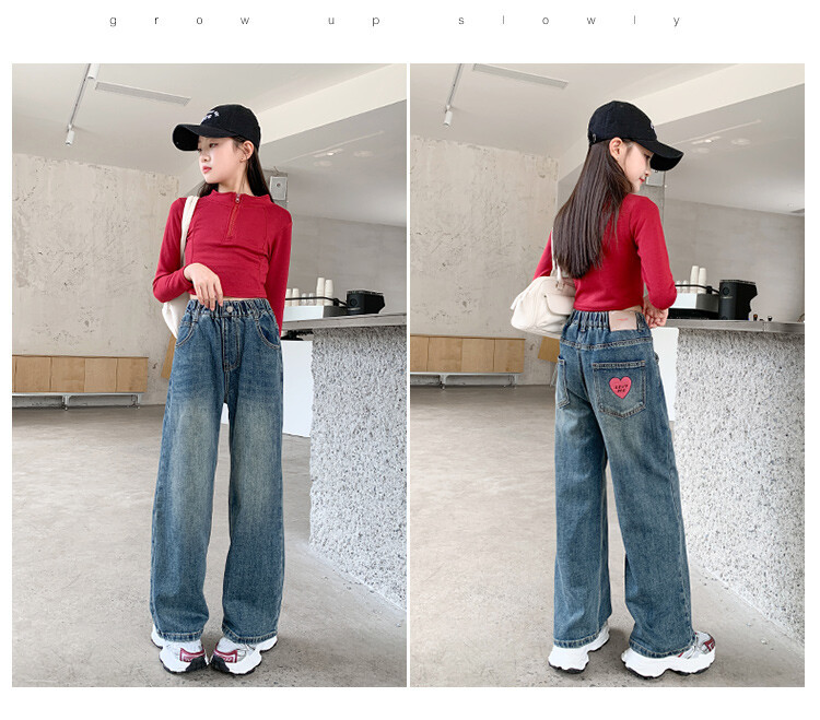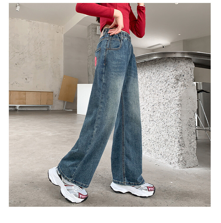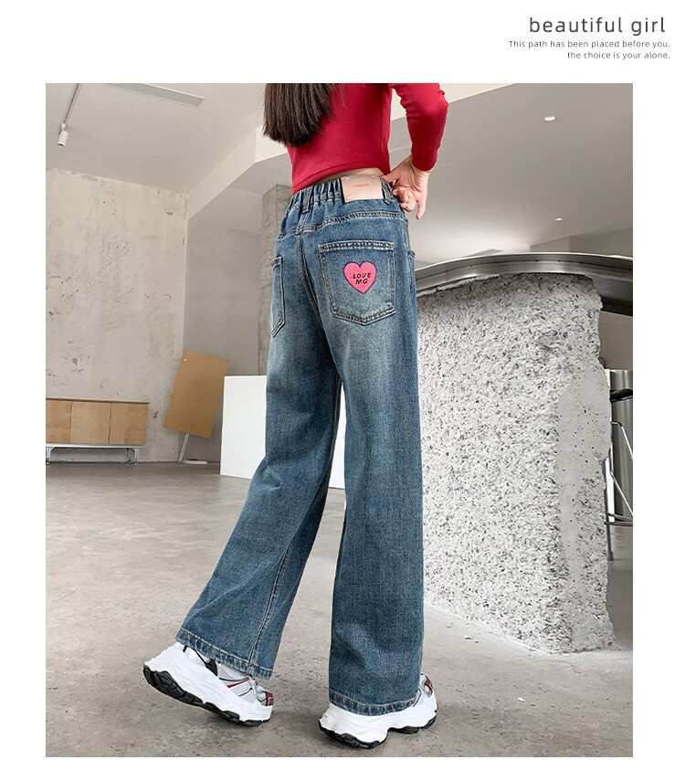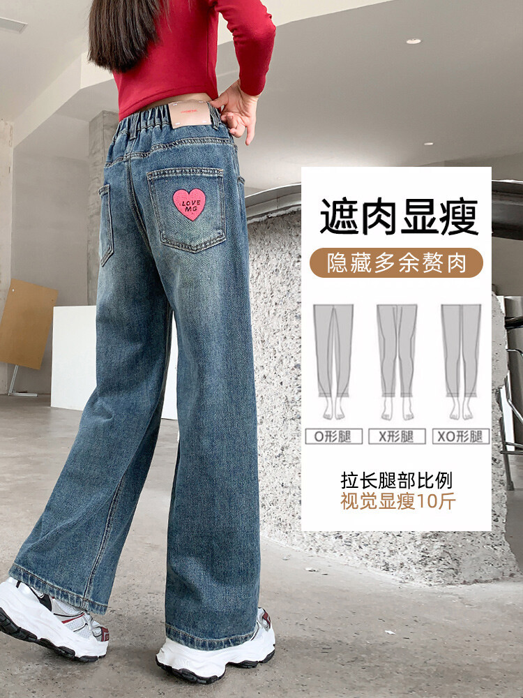 소녀 청바지 봄과 가을 어린이 2024 새로운 스타일 소녀의 Styky Straight Wide Leg Pants 소녀 가을 바지