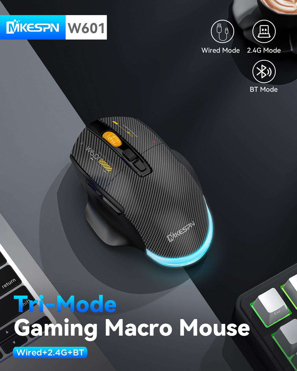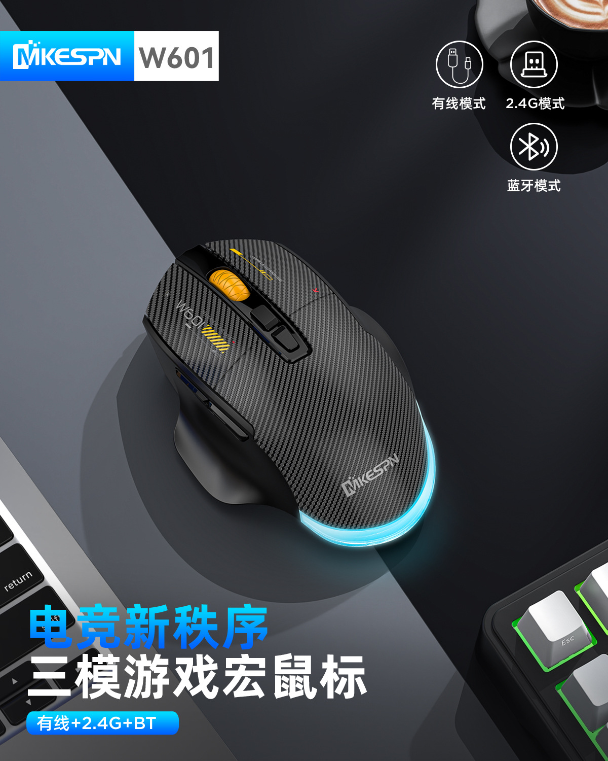 무선 3모드 마우스 하드웨어 매크로, 드라이버 프로그래밍 기능 탑재, TYPE-C 내장 충전, 탄소 섬유, 블루투스, 2.4G, 무소음스토어 가기