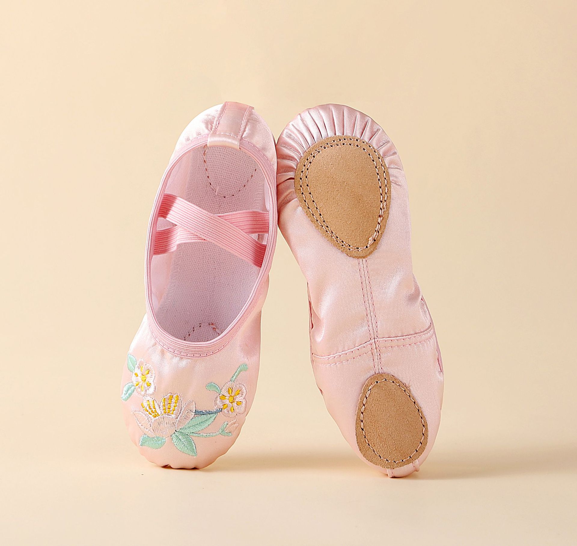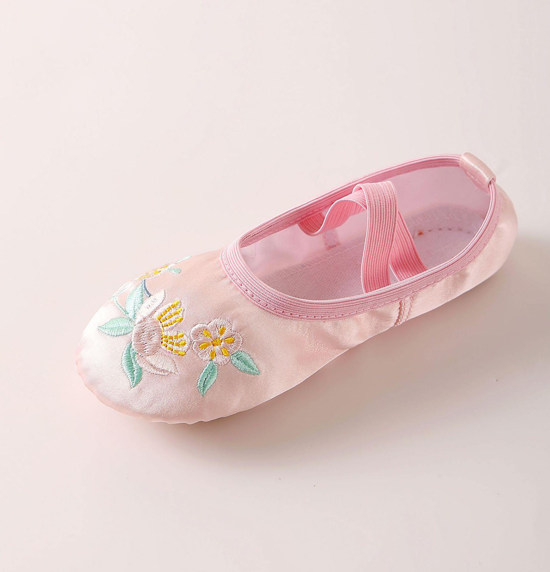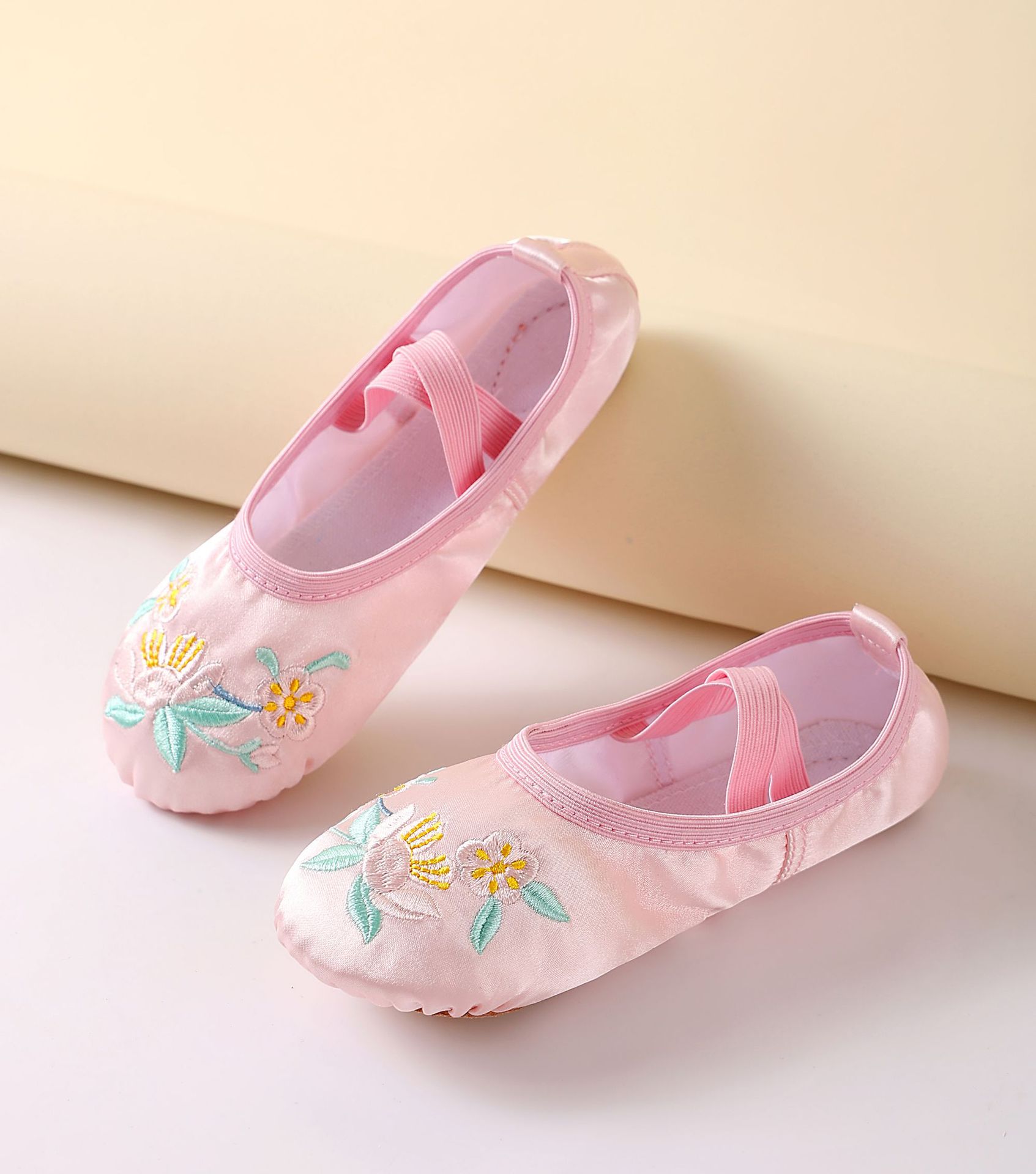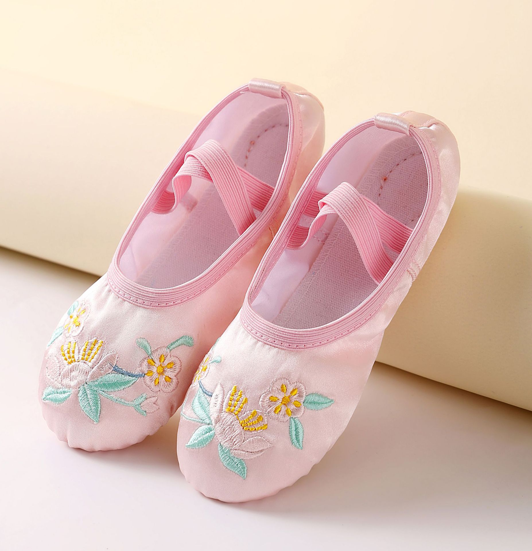 핑크 새틴 자수 중국풍 댄스 슈즈 어린이 및 성인용 부드러운 밑창 고양이 발톱 발레 연습화 미끄럼 방지 실내용