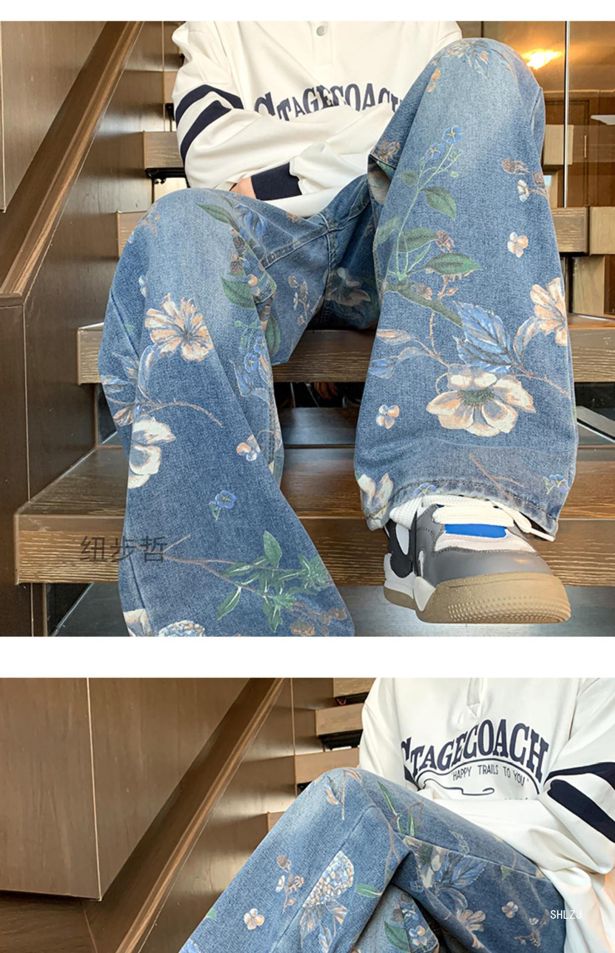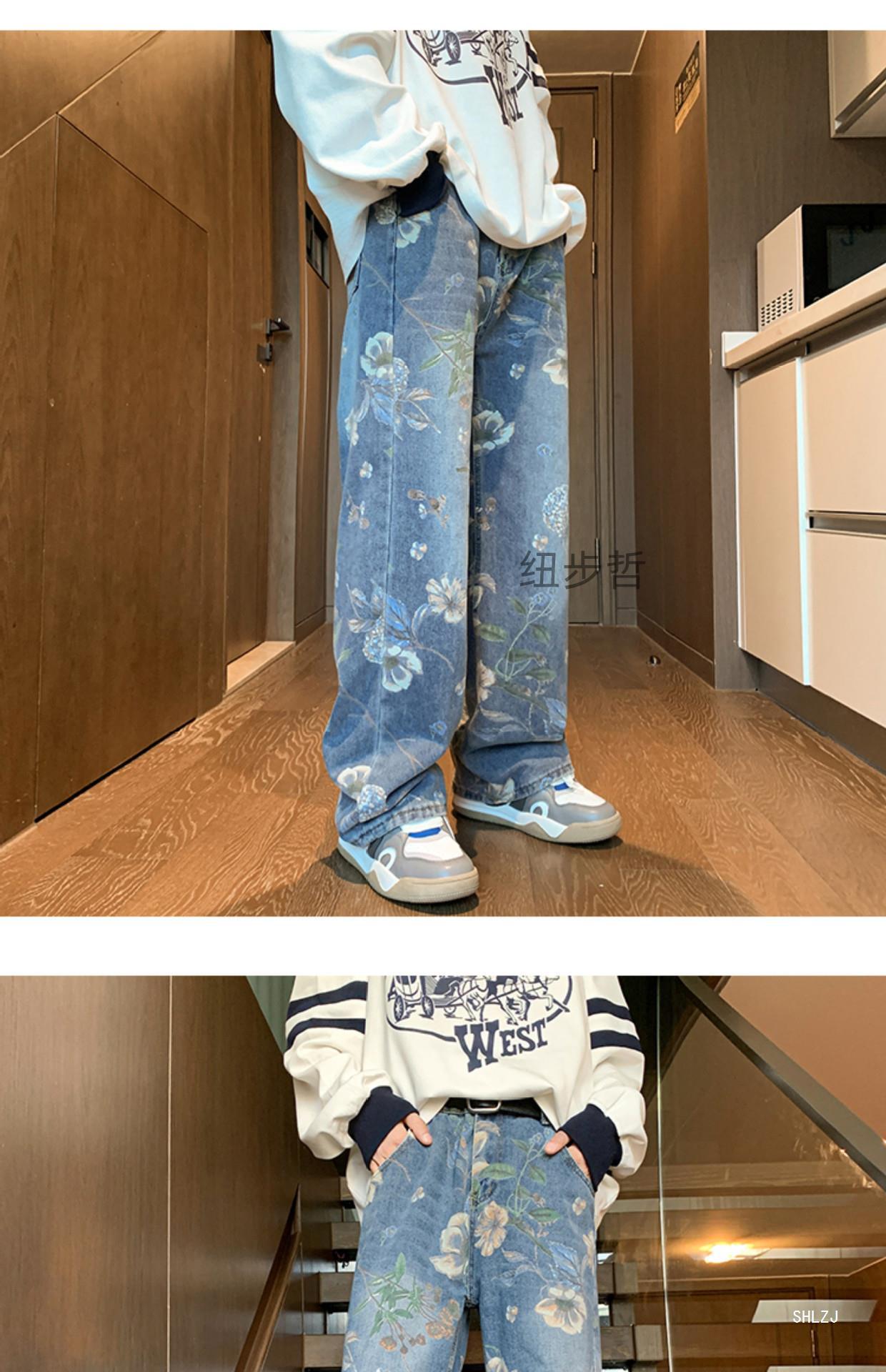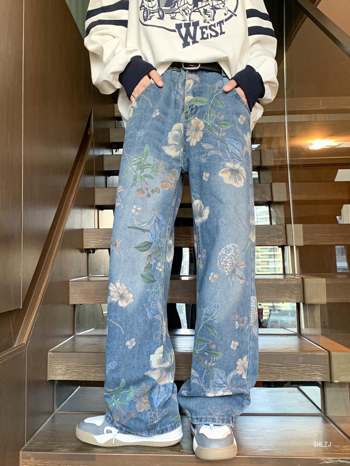 아메리칸 스타일 스트리트 프린트 청바지 남성 가을 패션 브랜드 바이브 스타일 느슨한 올 매치 디자인 센스 플로어 메이핑 와이드 레그 바지스토어 가기