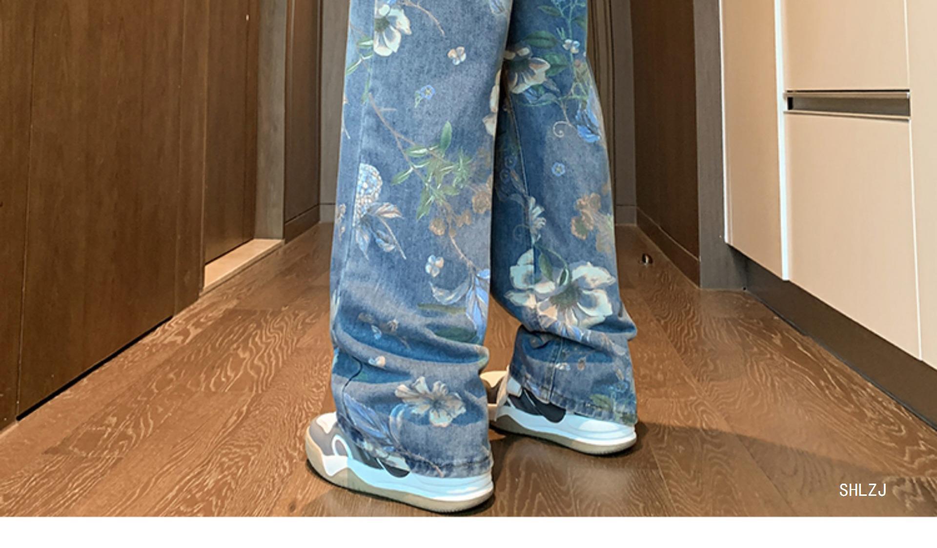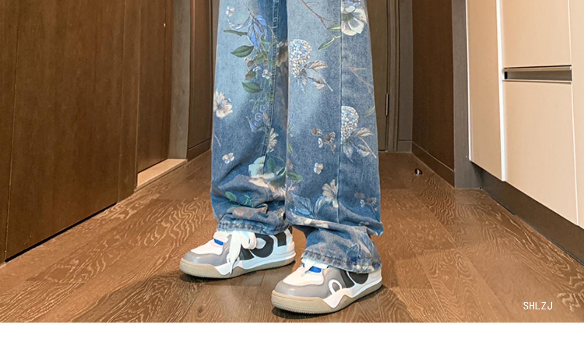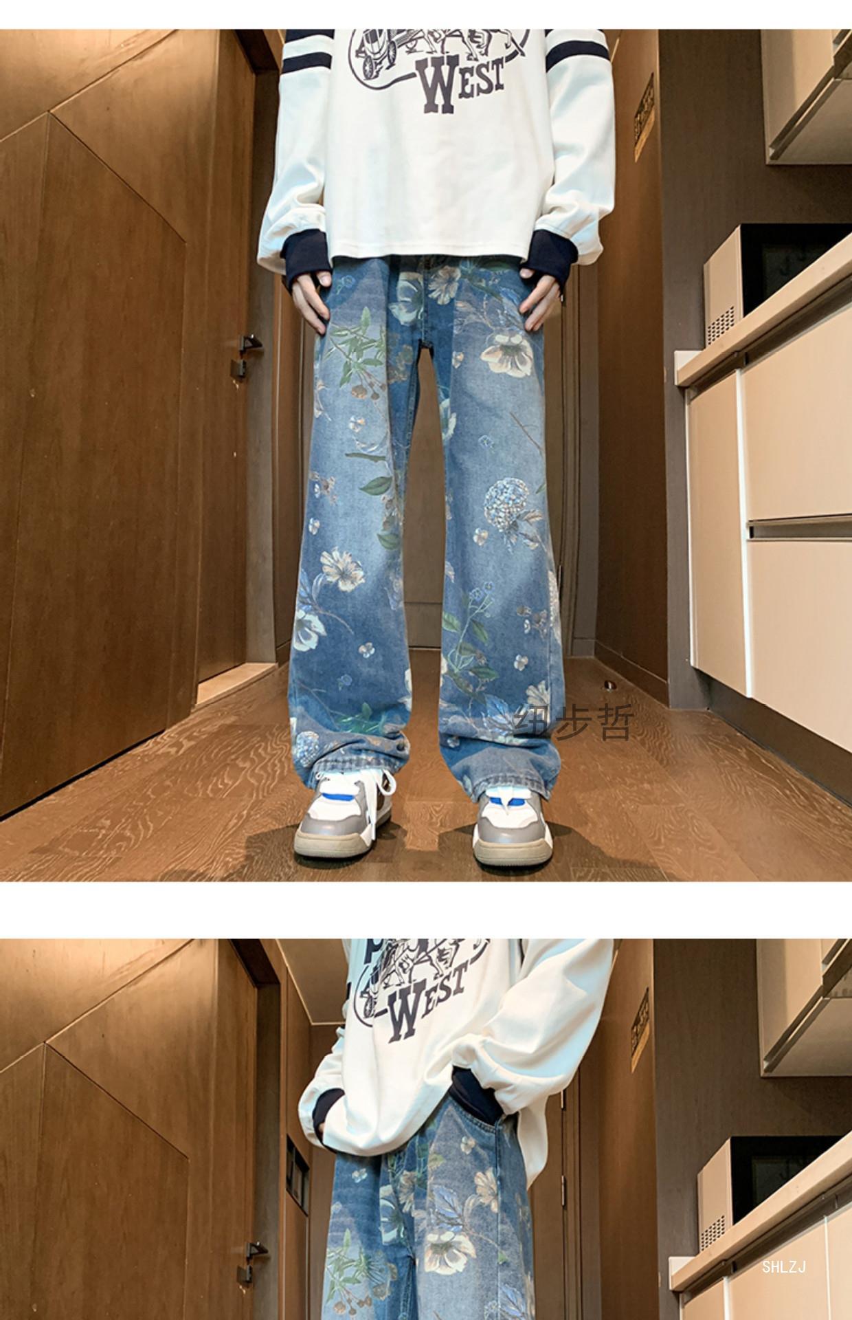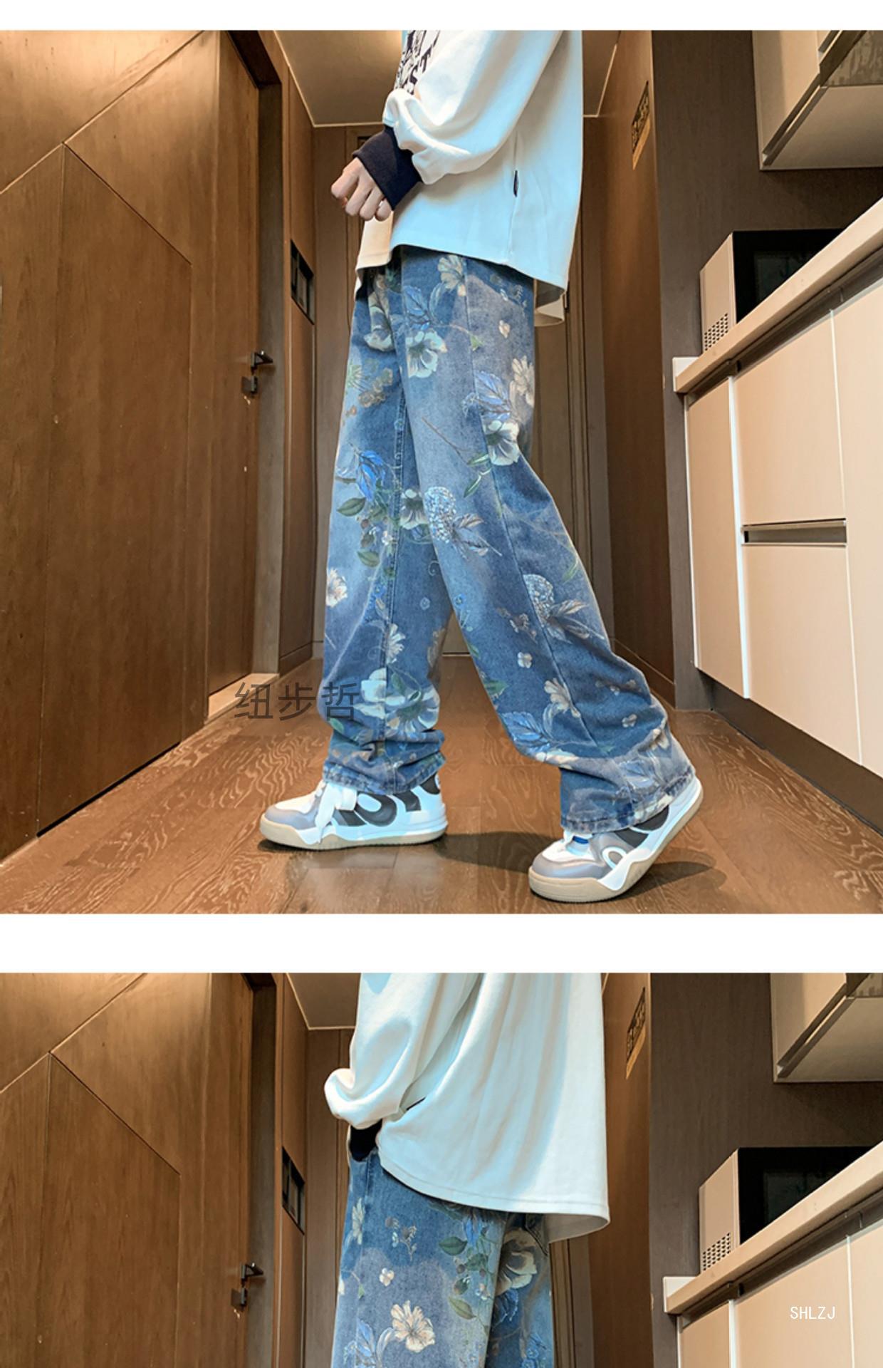 아메리칸 스타일 스트리트 프린트 청바지 남성 가을 패션 브랜드 바이브 스타일 느슨한 올 매치 디자인 센스 플로어 메이핑 와이드 레그 바지스토어 가기