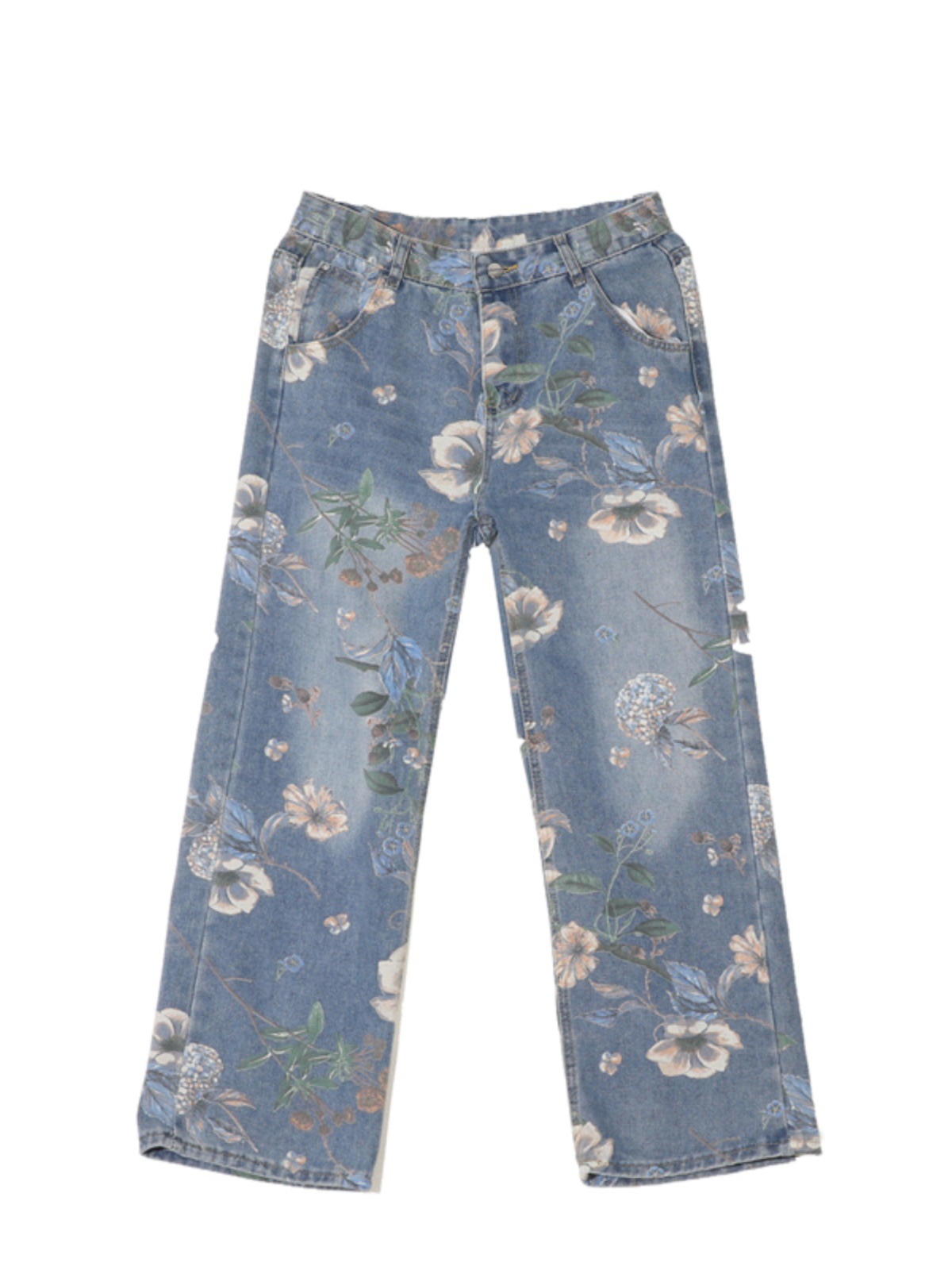 아메리칸 스타일 스트리트 프린트 청바지 남성 가을 패션 브랜드 바이브 스타일 느슨한 올 매치 디자인 센스 플로어 메이핑 와이드 레그 바지