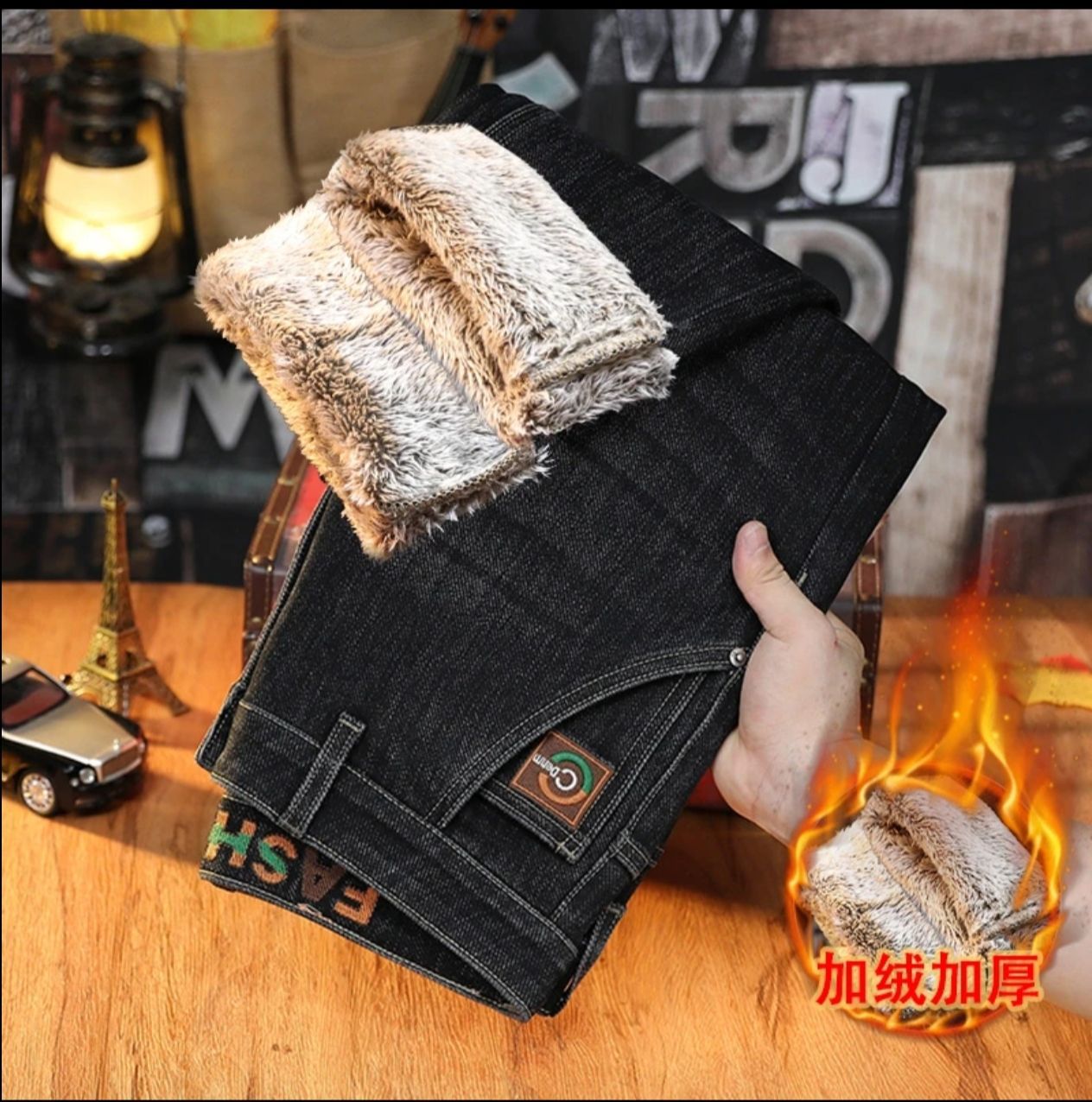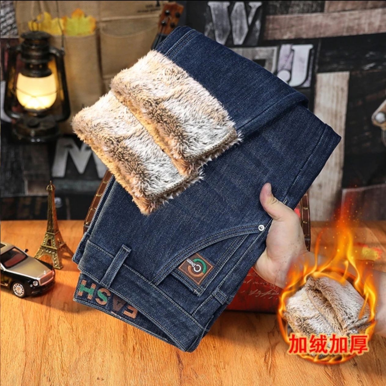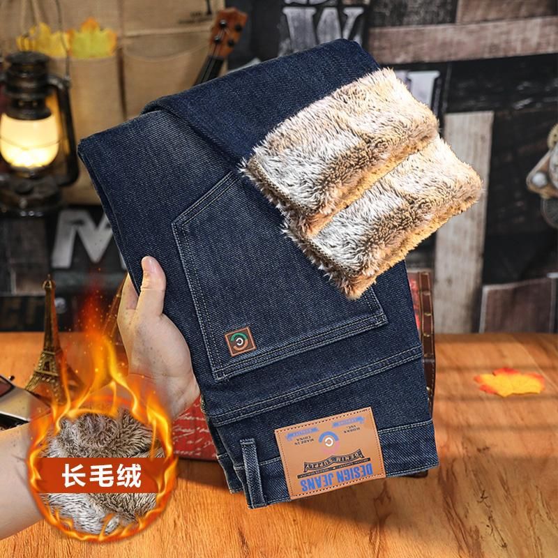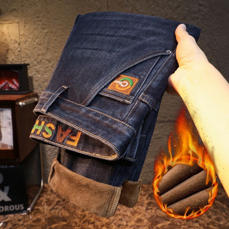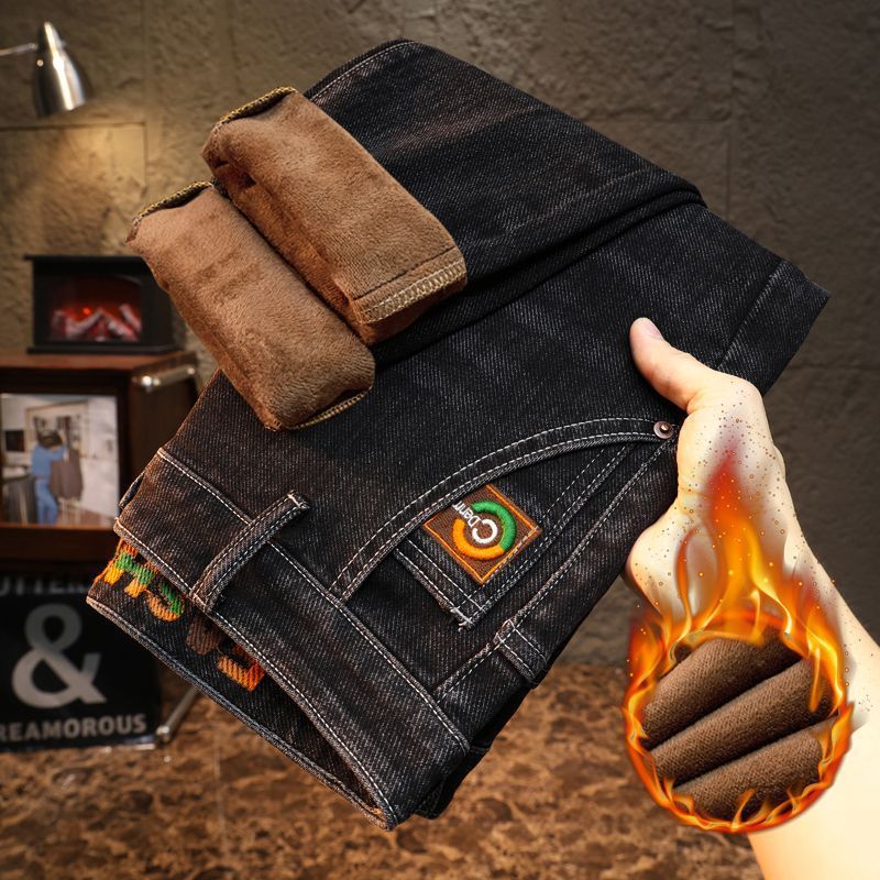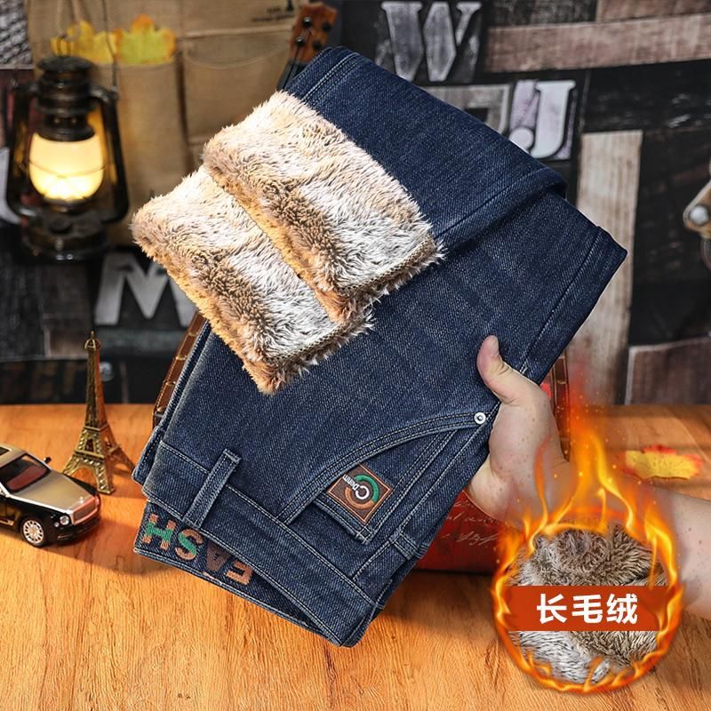 남성용 겨울용 신축성 있는 기모 데님 팬츠, 두꺼운 일자핏 중년용 보온 기모 바지, 입체적인 재단스토어 가기