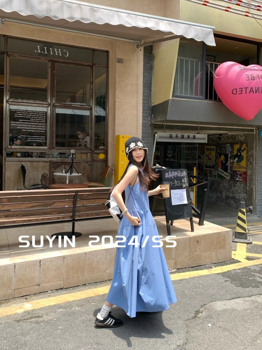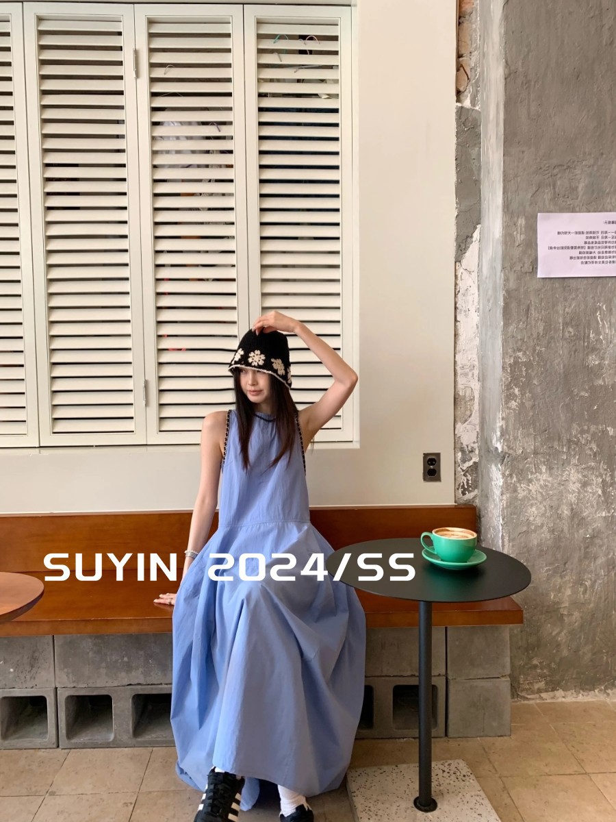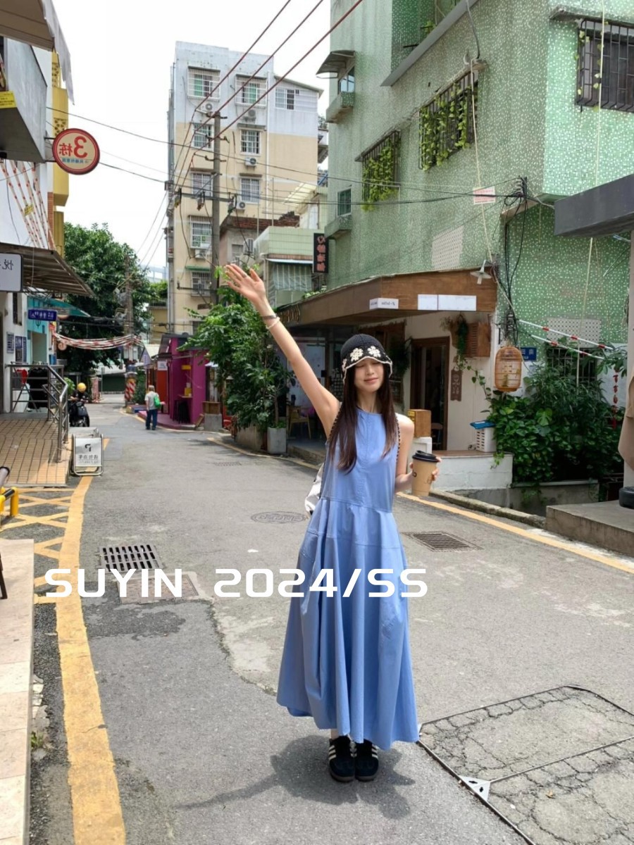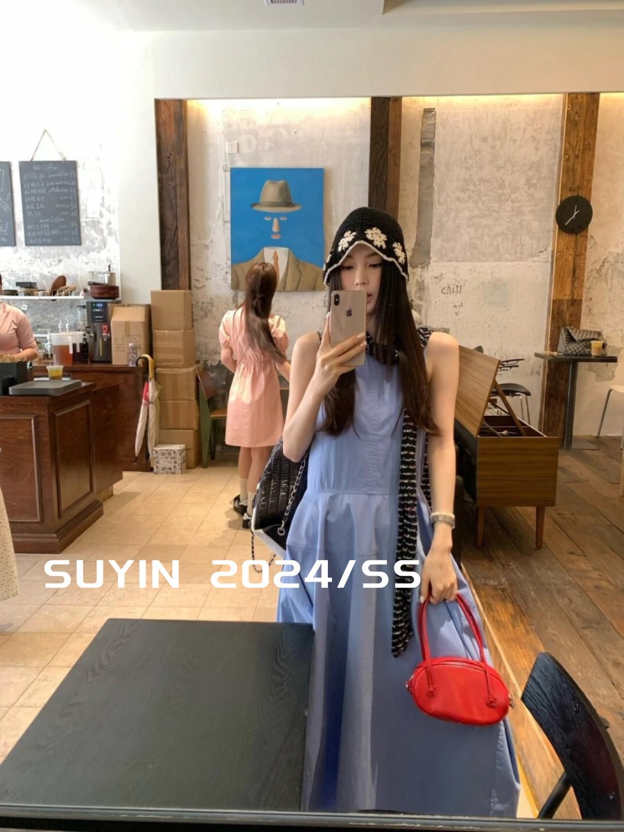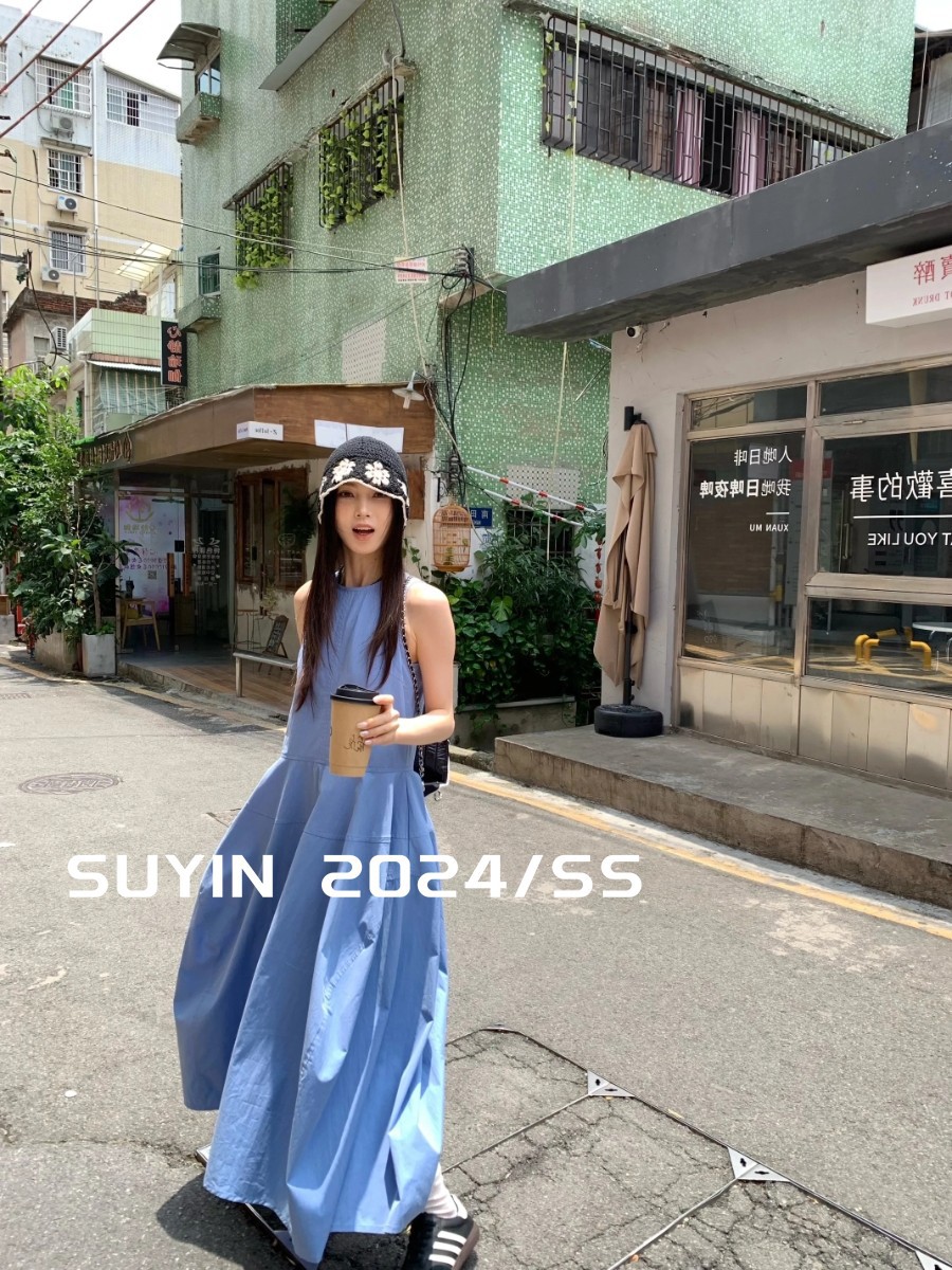 프랑스 스타일 홀리데이 스타일 우아한 블루 조끼 원피스 여성 여름 새로운 디자인 센스 타이트 허리 슬림 A-라인 긴 원피스스토어 가기