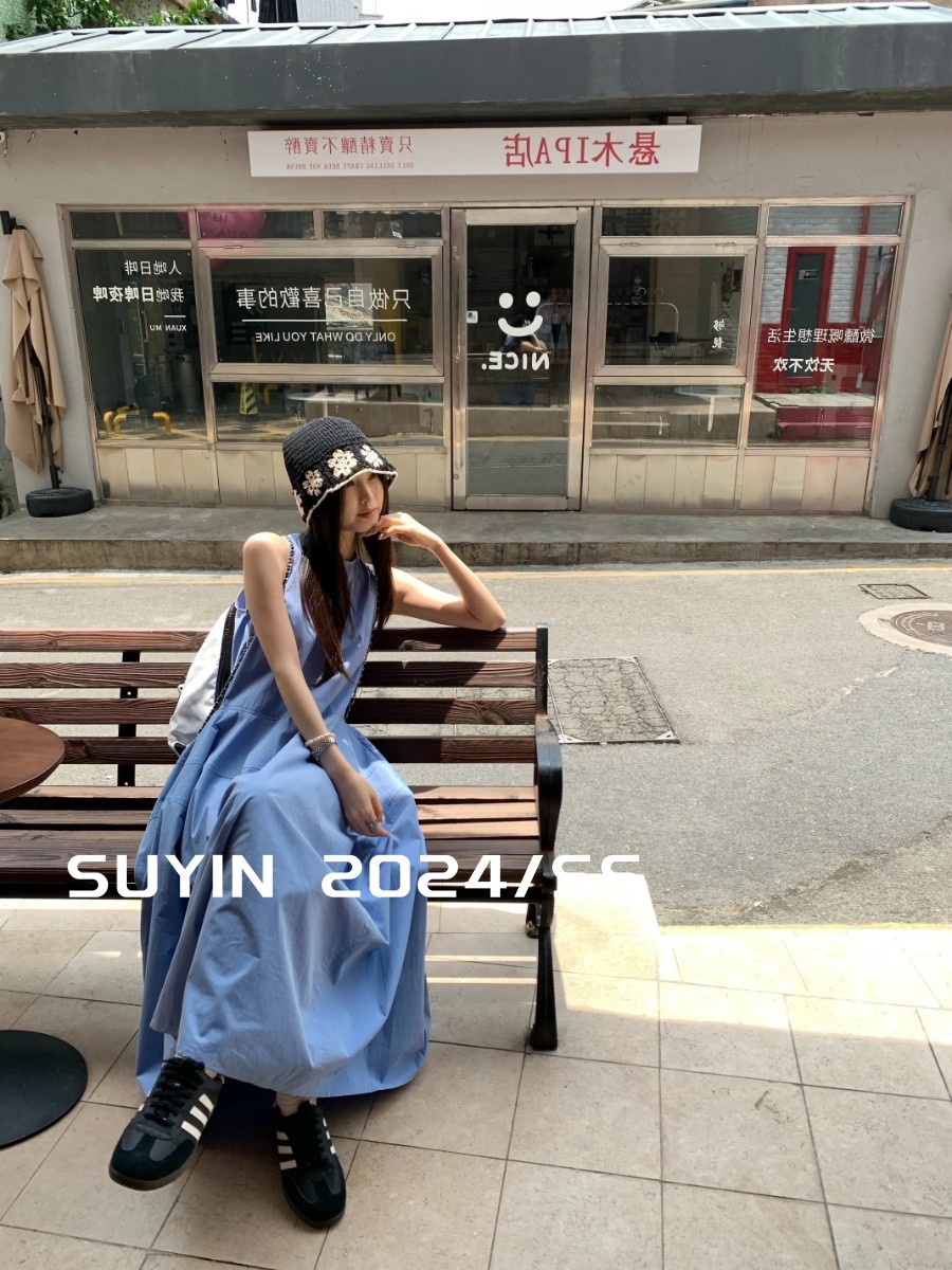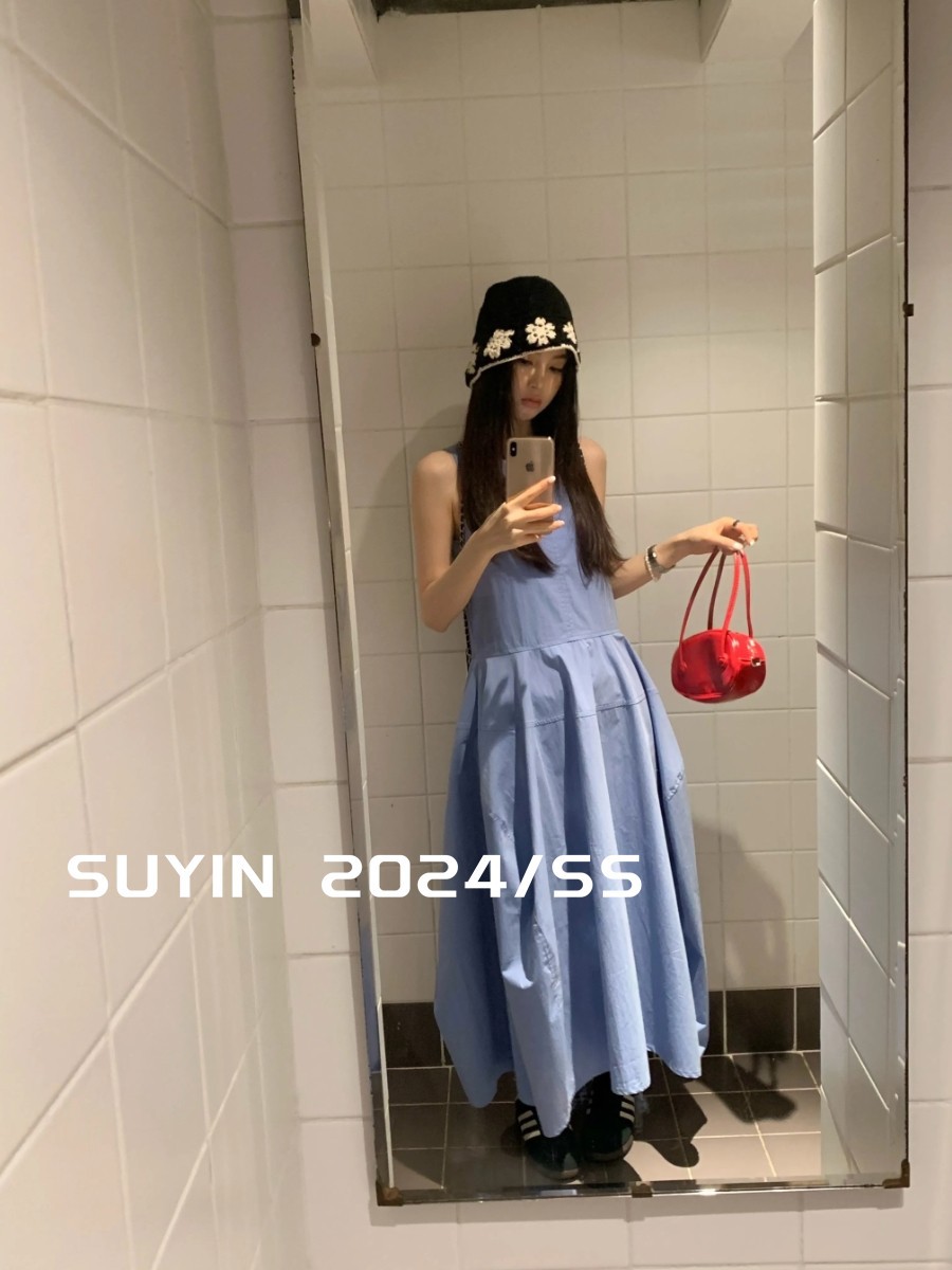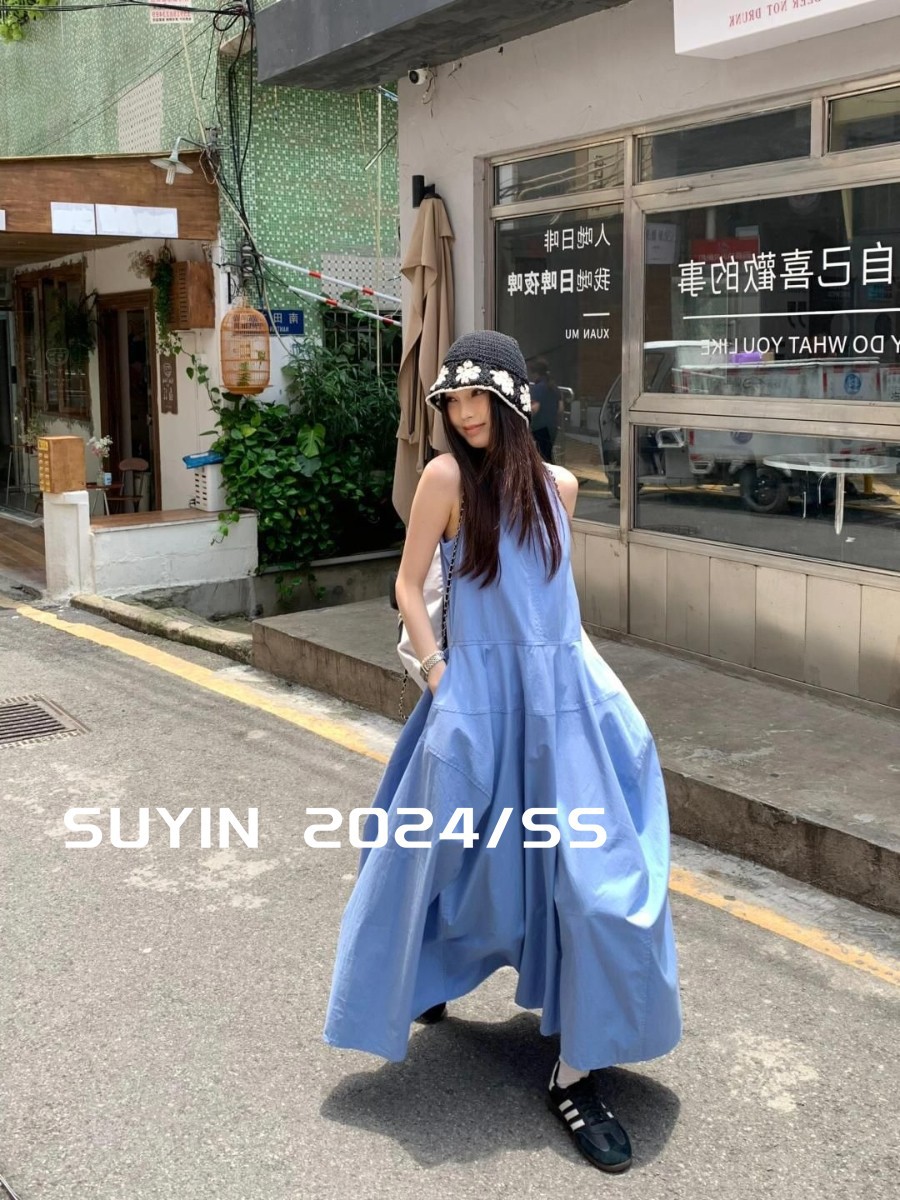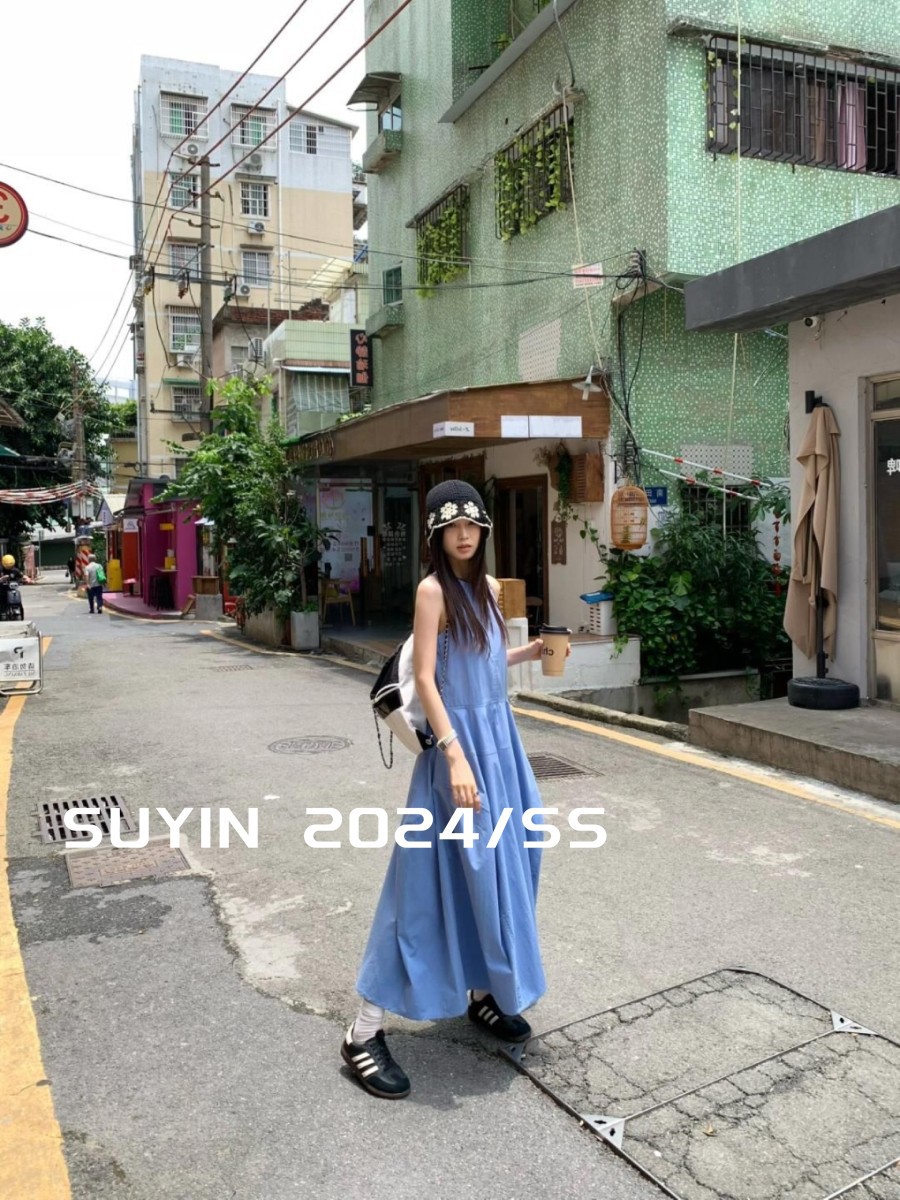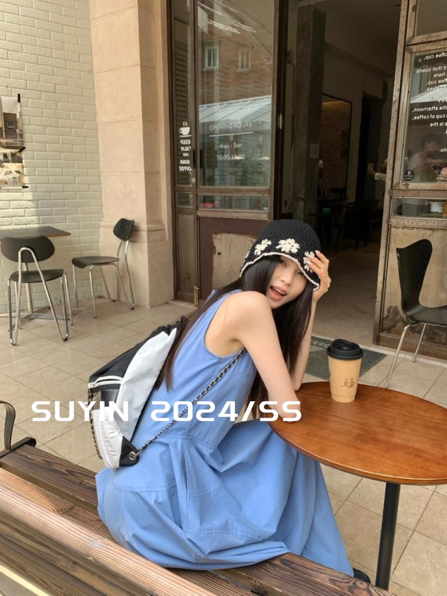 프랑스 스타일 홀리데이 스타일 우아한 블루 조끼 원피스 여성 여름 새로운 디자인 센스 타이트 허리 슬림 A-라인 긴 원피스스토어 가기