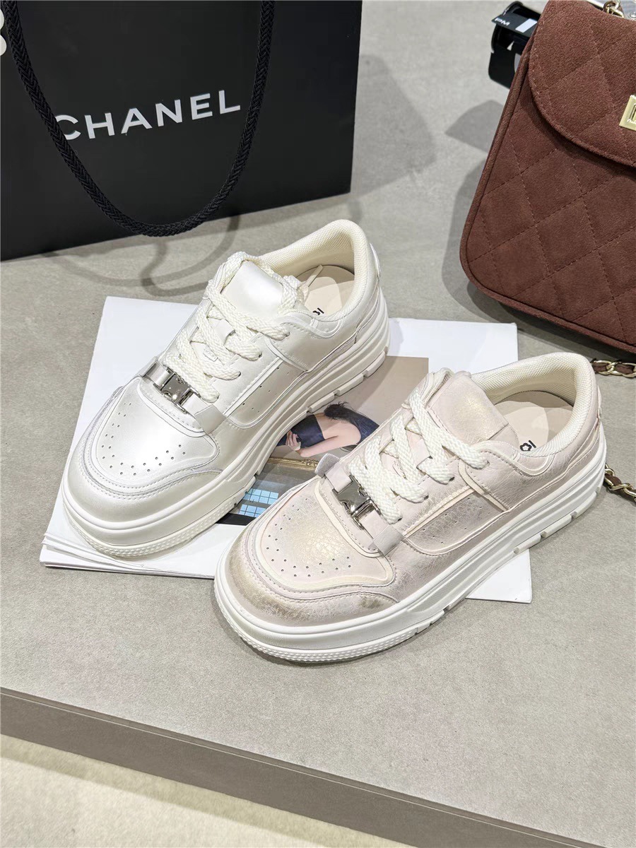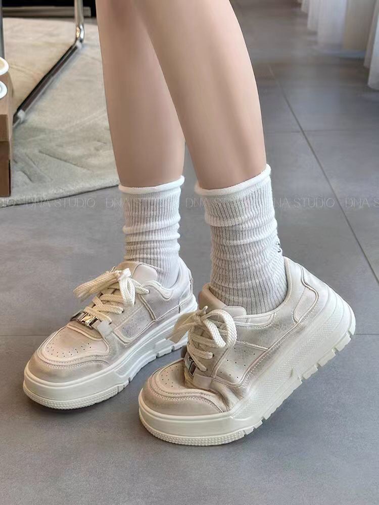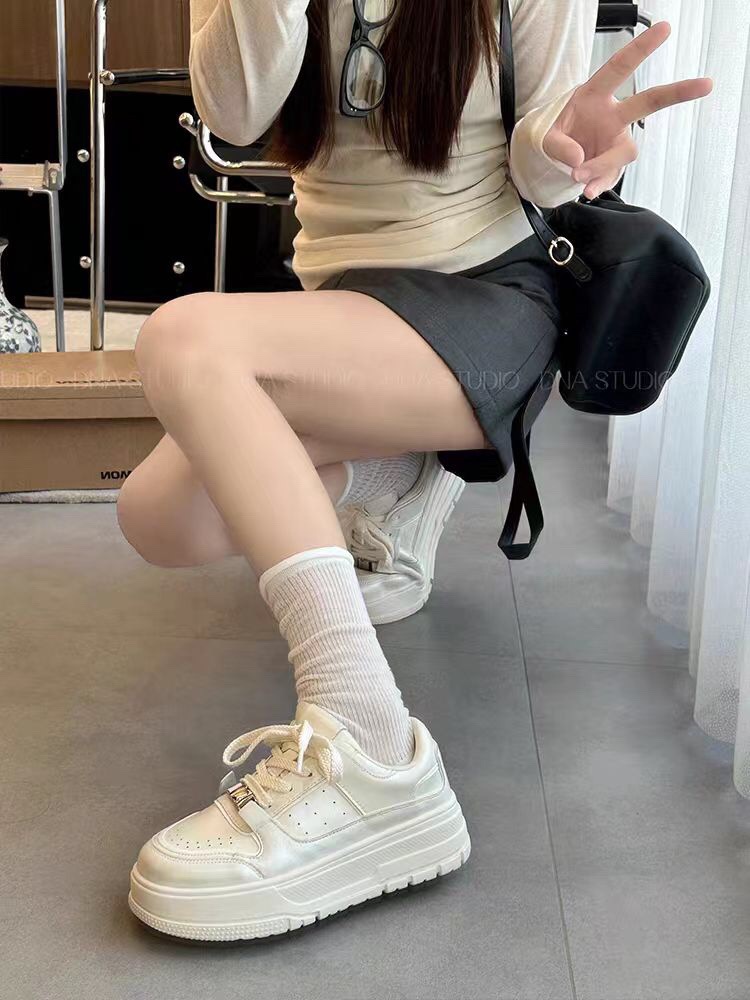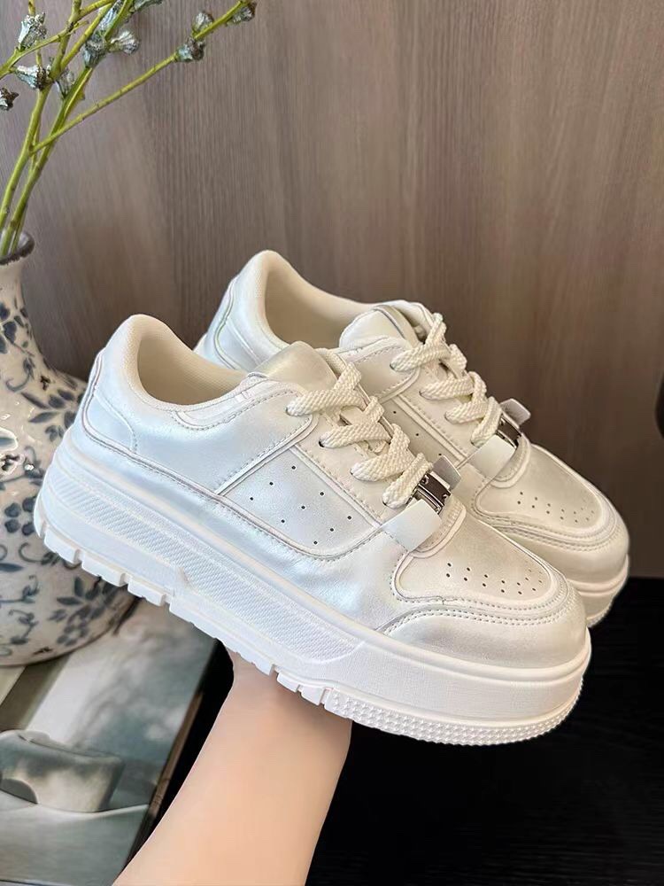 두꺼운 밑창 진주 버클 가죽 흰색 신발 여성 신발 2024 새로운 스포츠 캐주얼 신발 증가 레이스 업 오래된 신발스토어 가기
