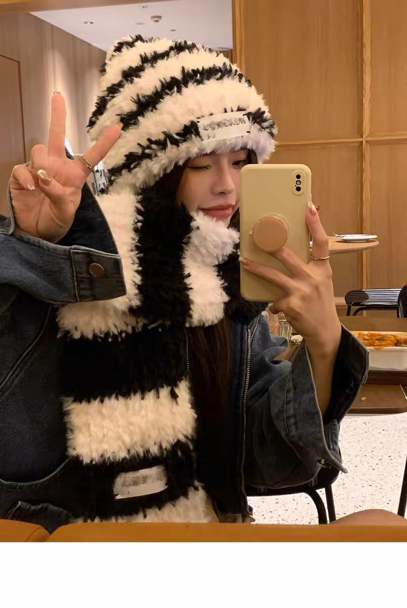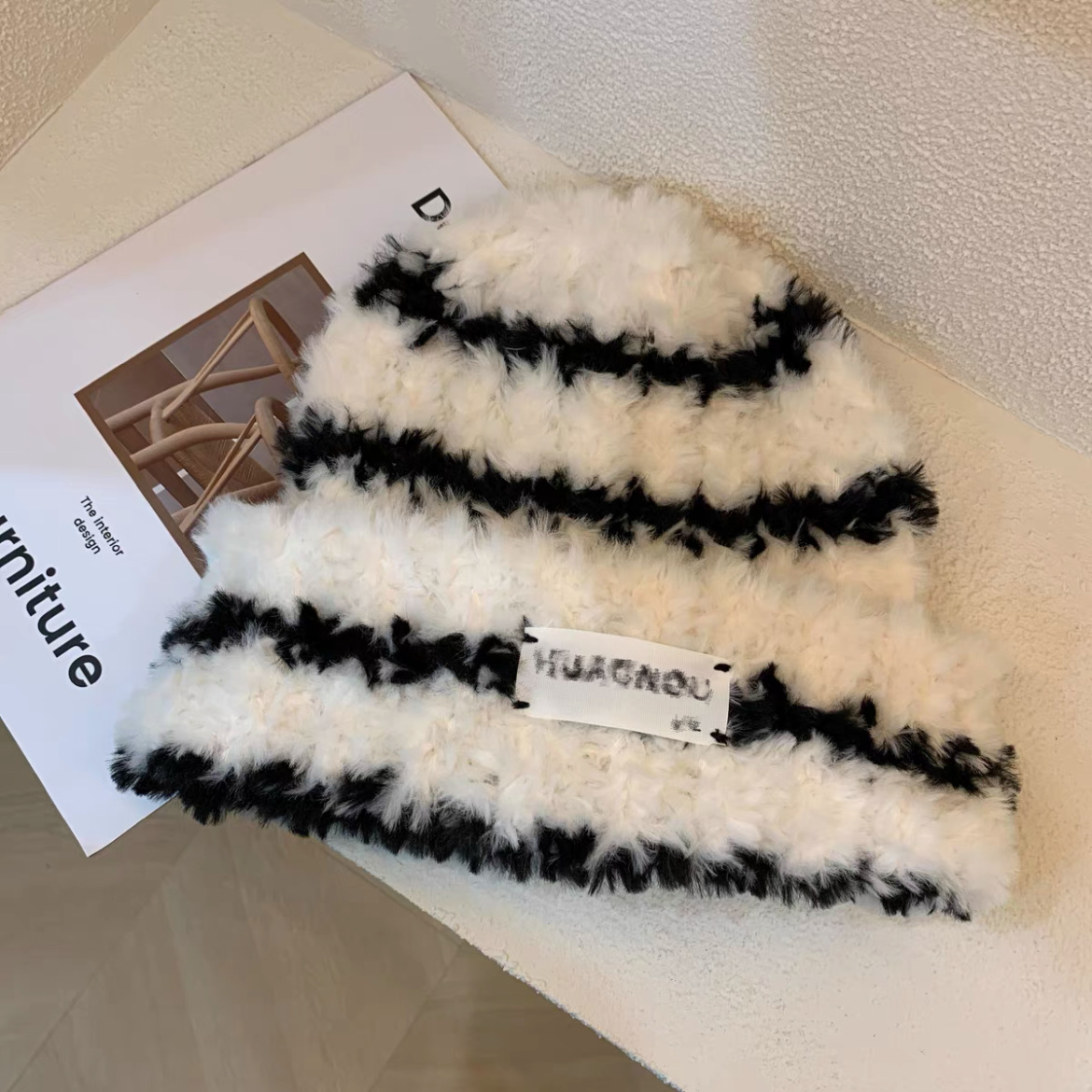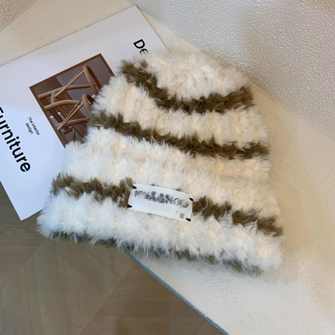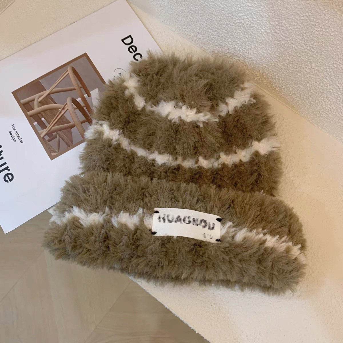 가을과 겨울 따뜻한 큰 머리는 니트 양모 모자 여성의 새로운 귀 보호 느슨한 줄무늬 솜털 모자 얼굴 작은 차가운 모자스토어 가기