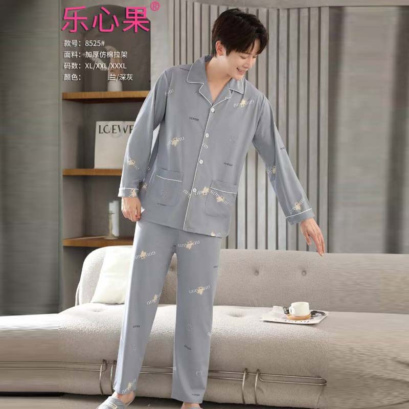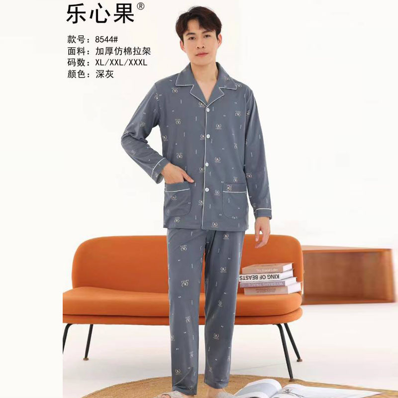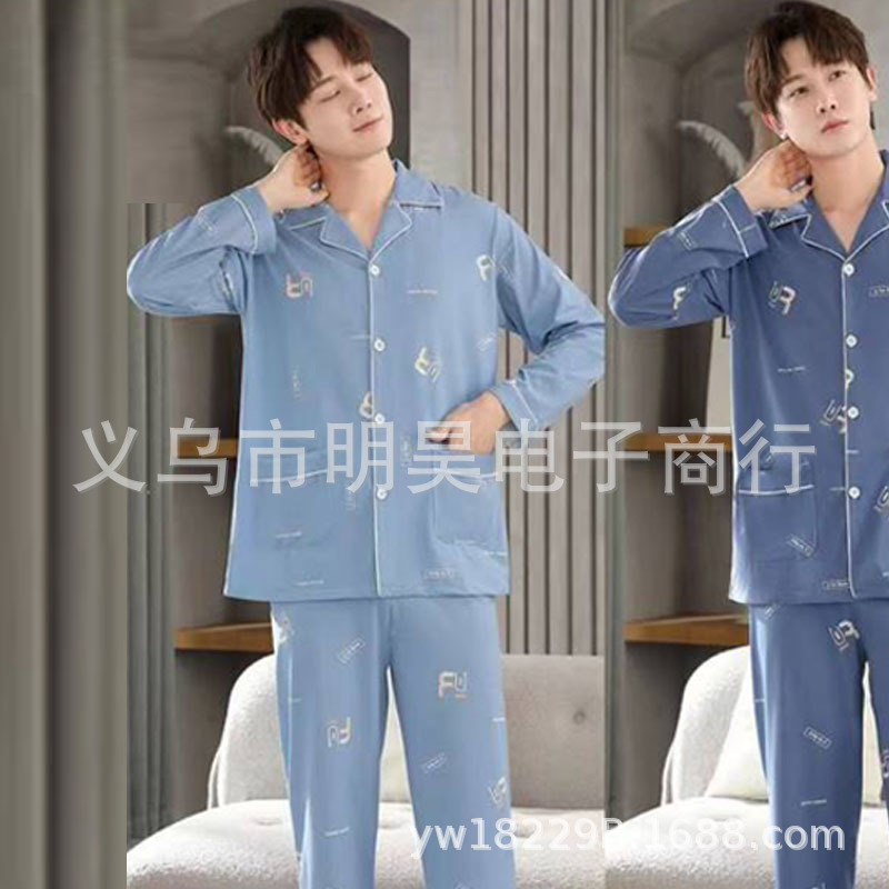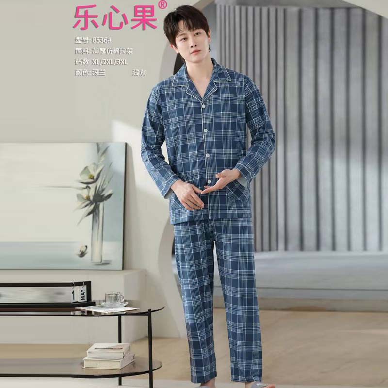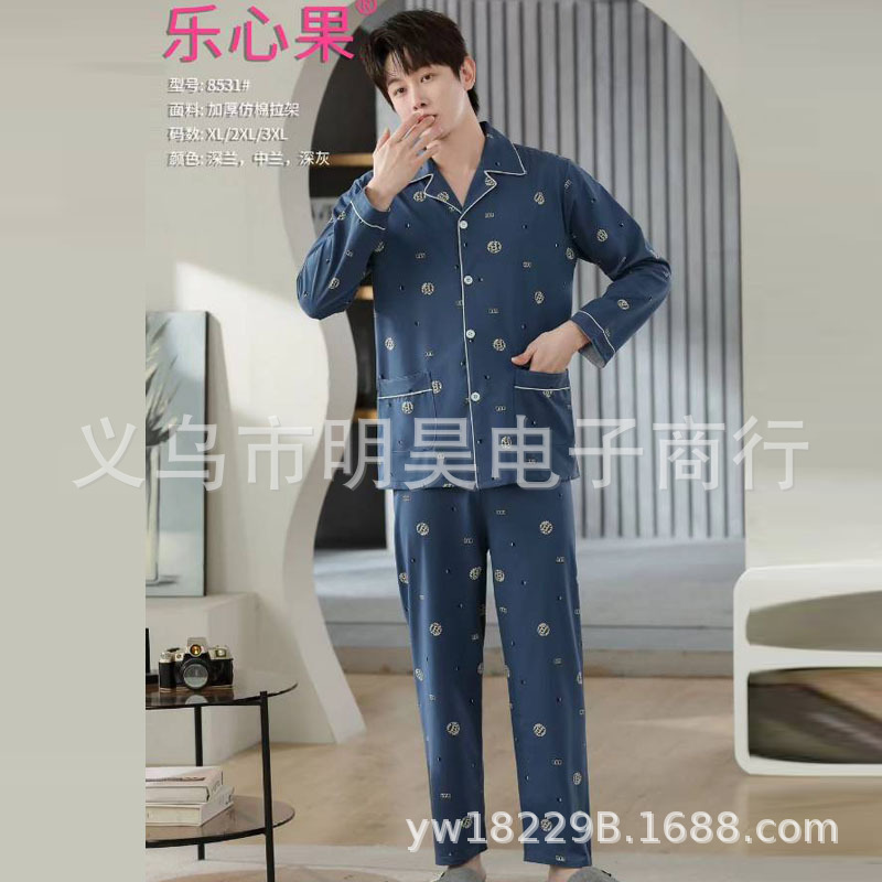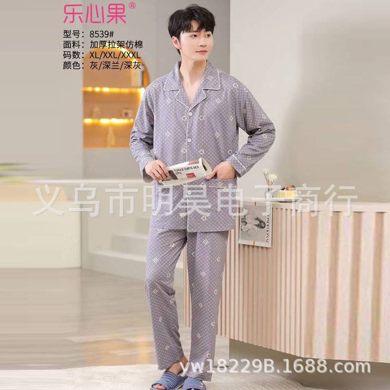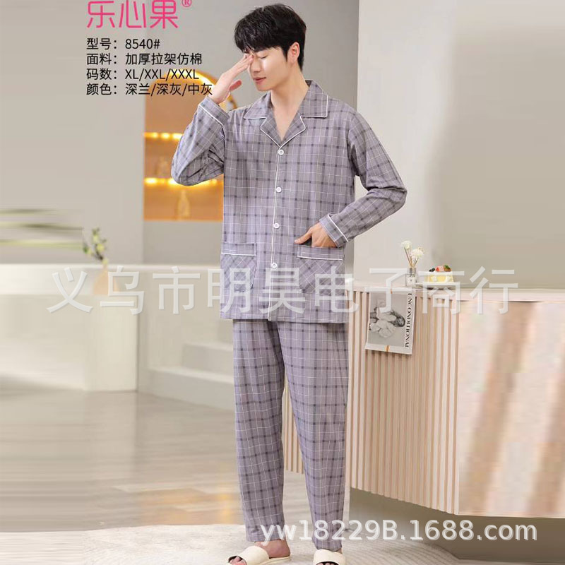 Le Xin Guo 피부 친화적 인 면화 모조 면 긴 소매 바지 홈 의류 카디건 세트 남성 25 개의 새로운 리버스 칼라 더블 롱 파자마스토어 가기