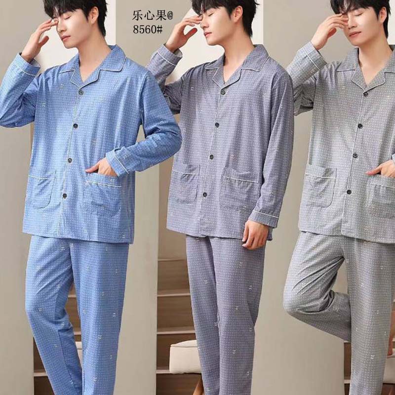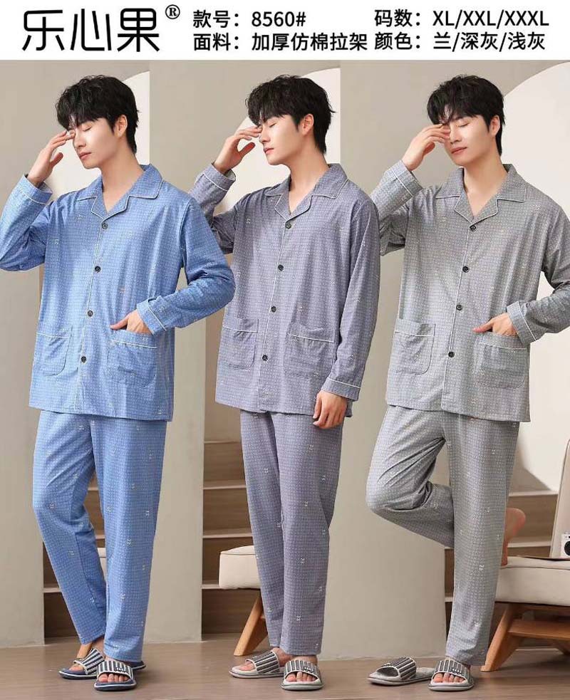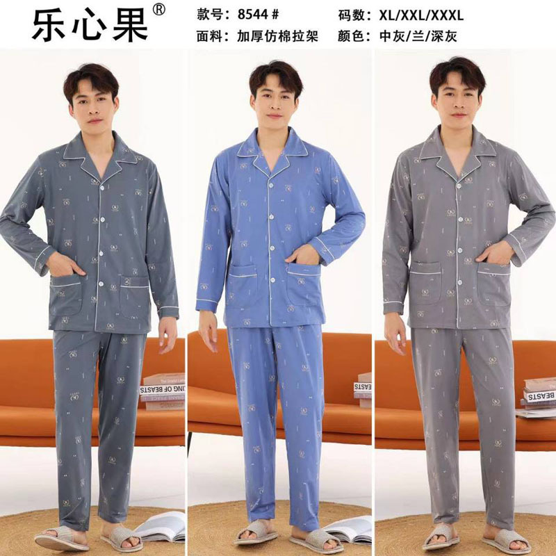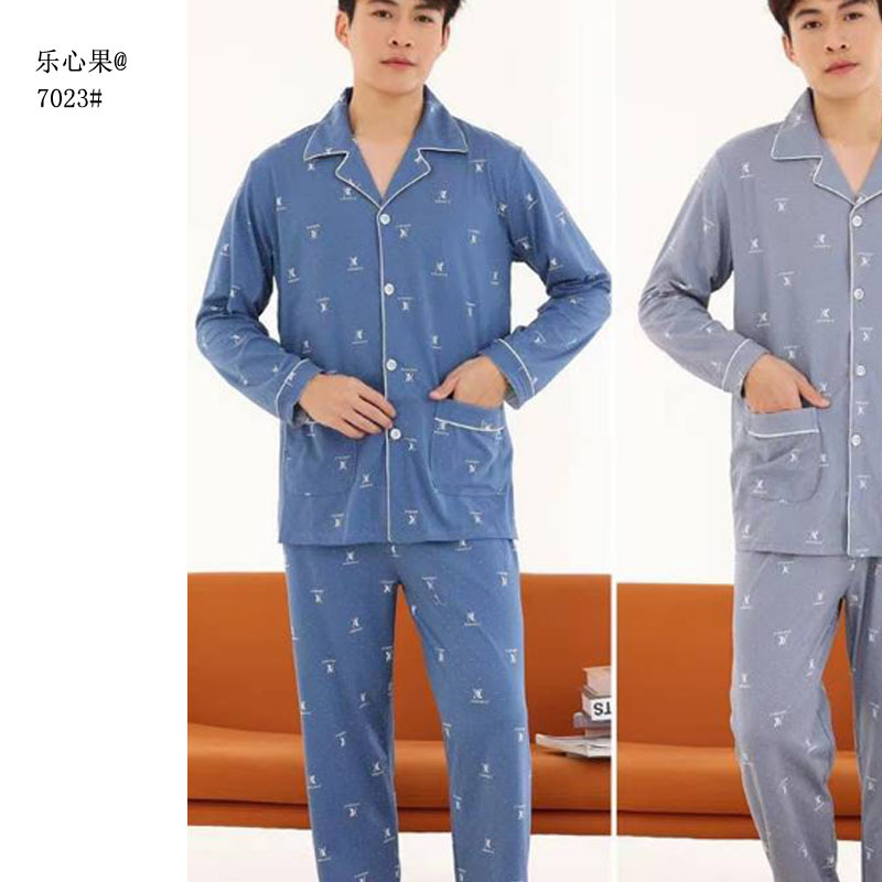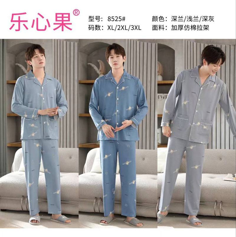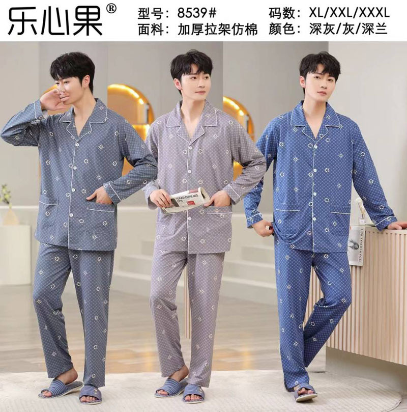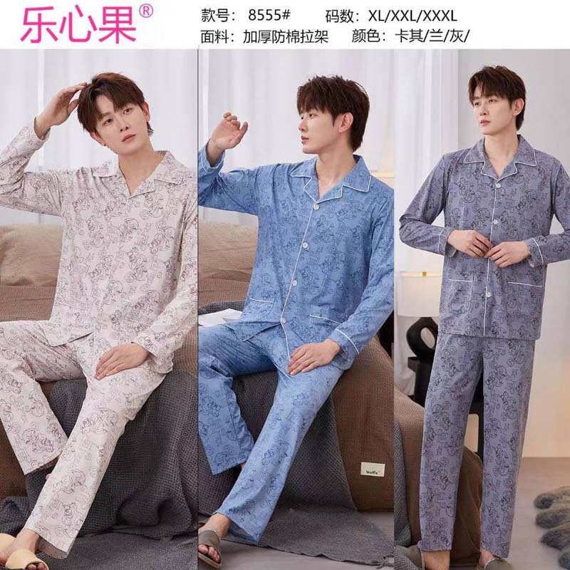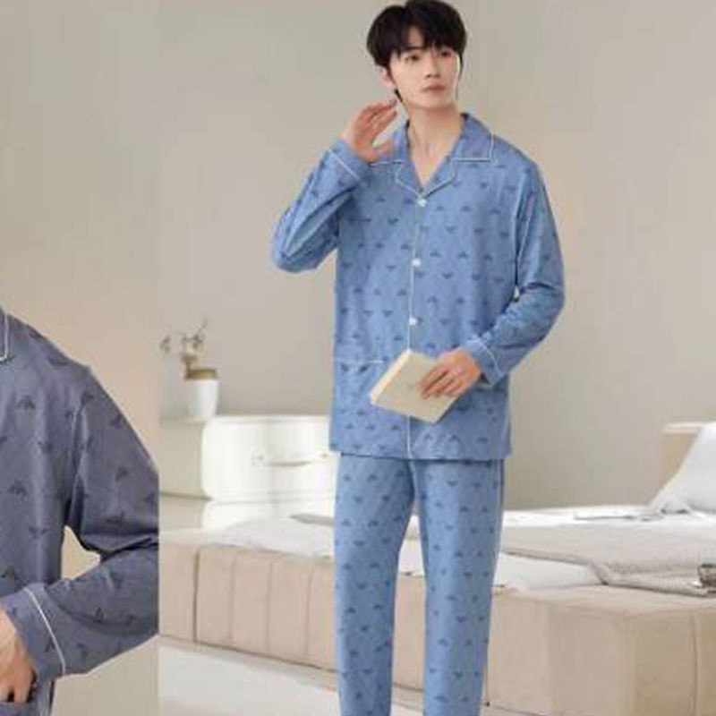 Le Xin Guo 피부 친화적 인 면화 모조 면 긴 소매 바지 홈 의류 카디건 세트 남성 25 개의 새로운 리버스 칼라 더블 롱 파자마스토어 가기