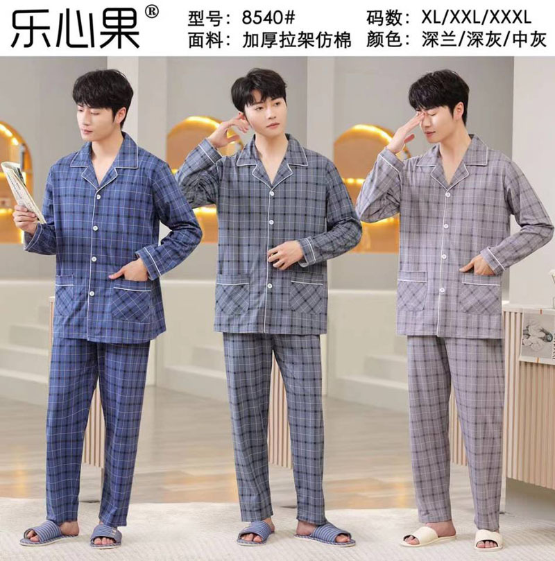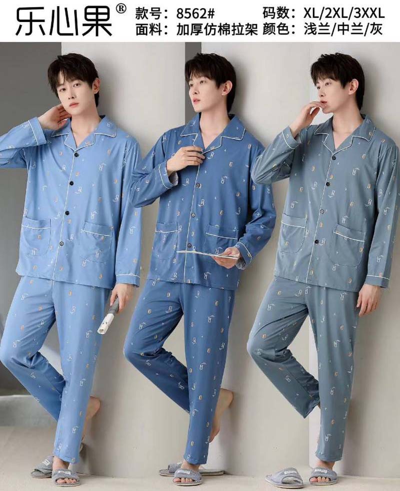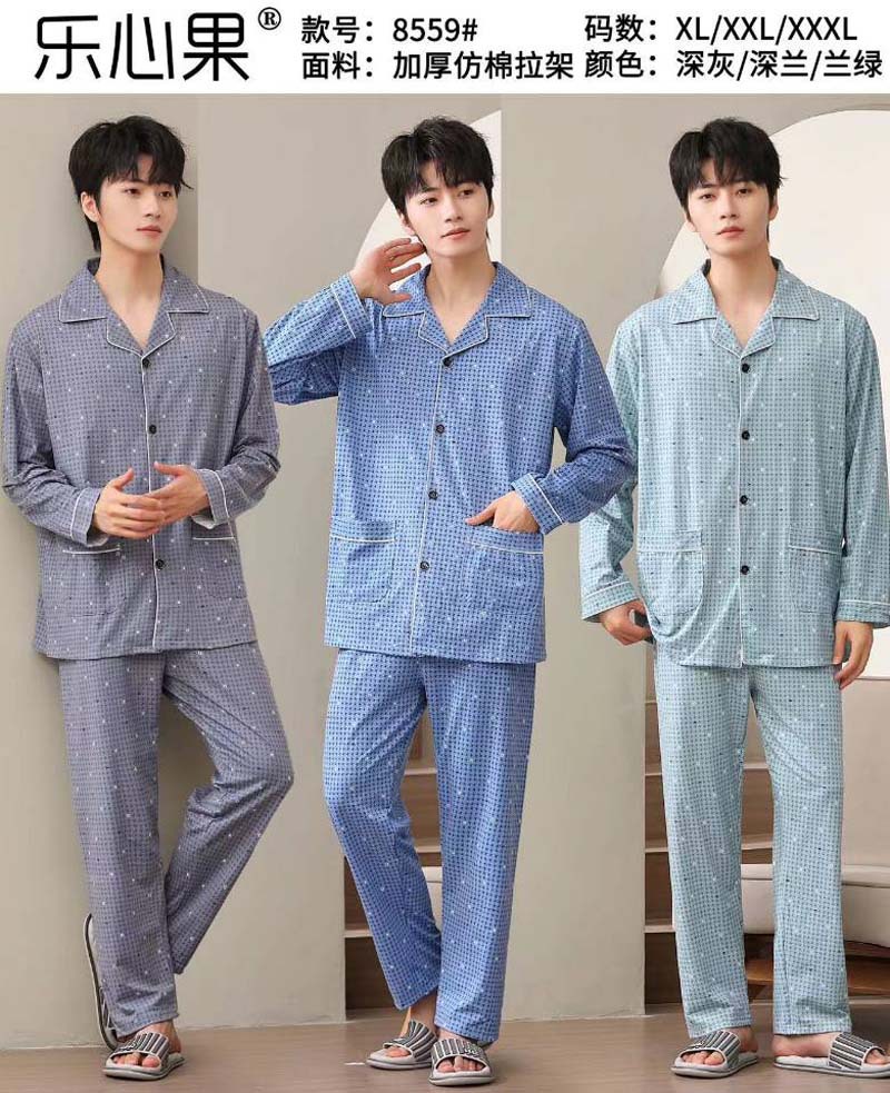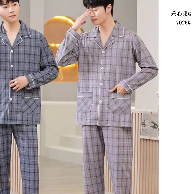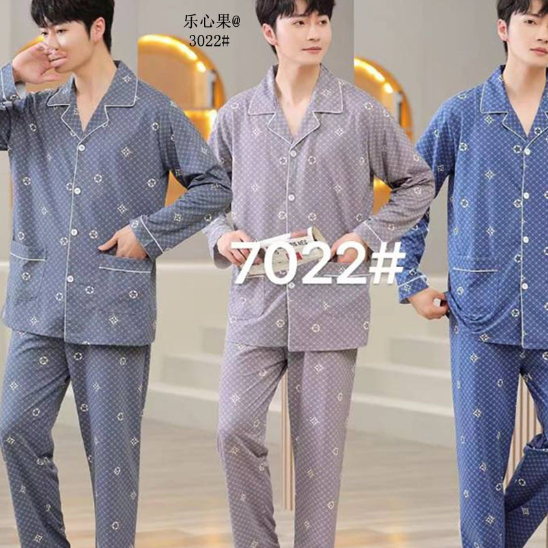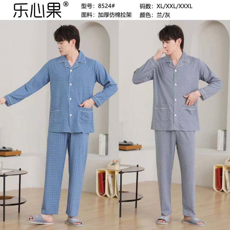 Le Xin Guo 피부 친화적 인 면화 모조 면 긴 소매 바지 홈 의류 카디건 세트 남성 25 개의 새로운 리버스 칼라 더블 롱 파자마스토어 가기