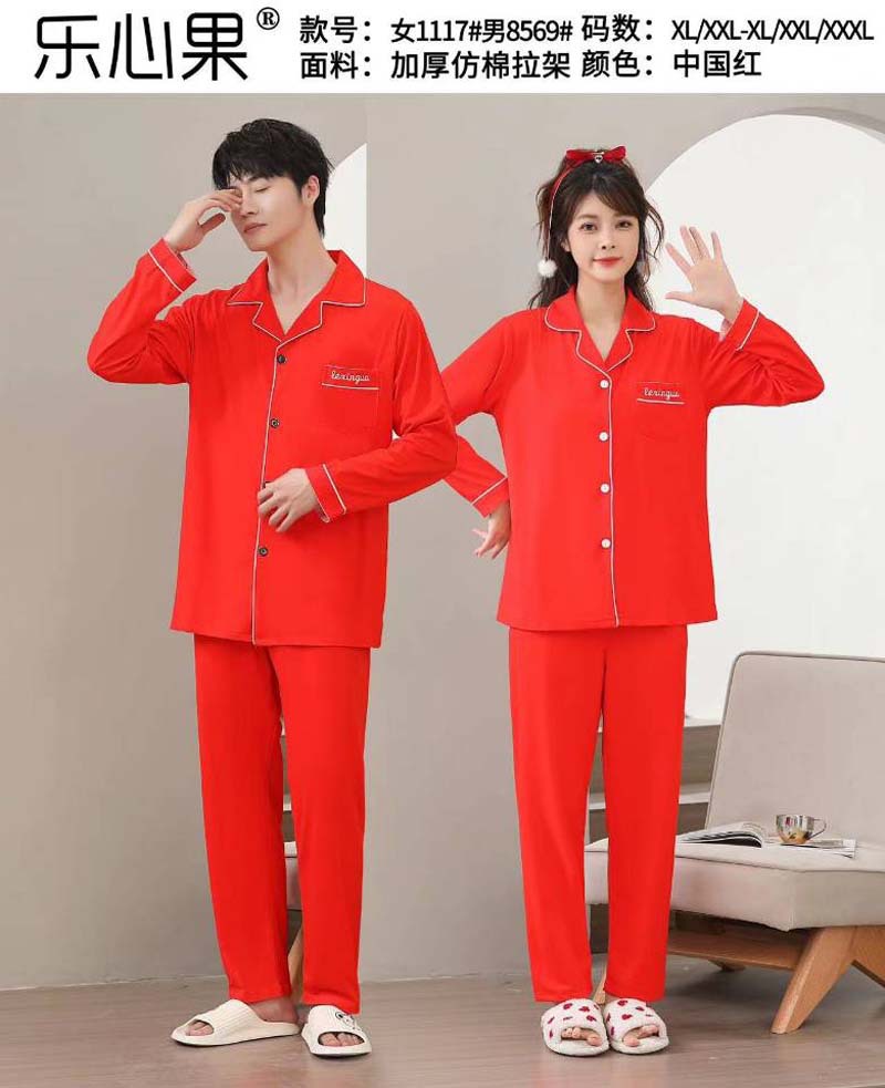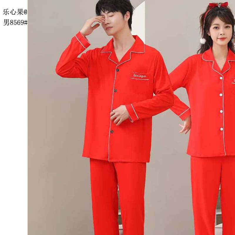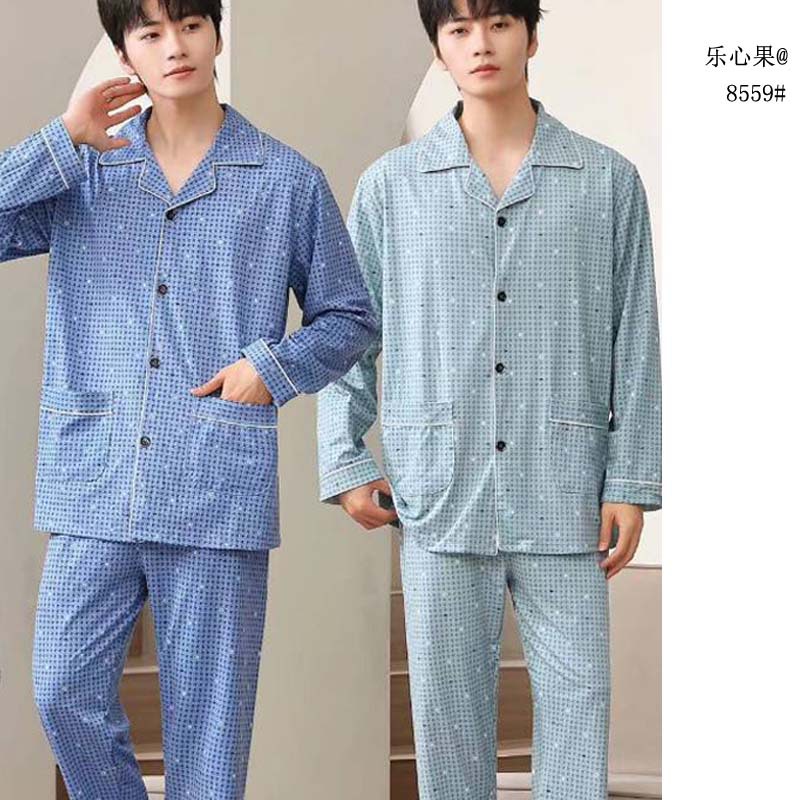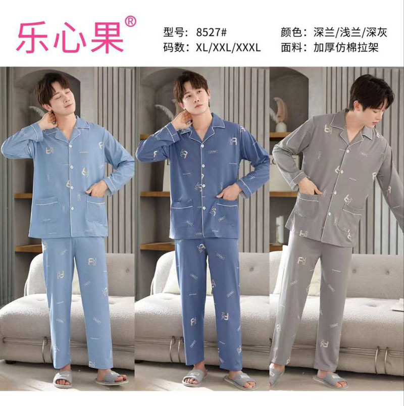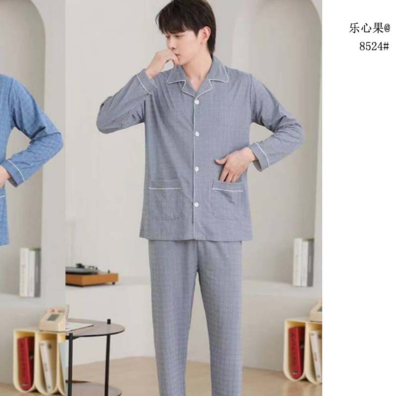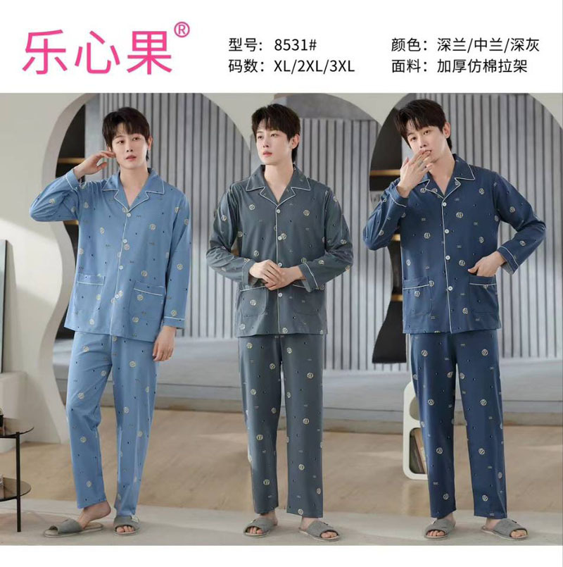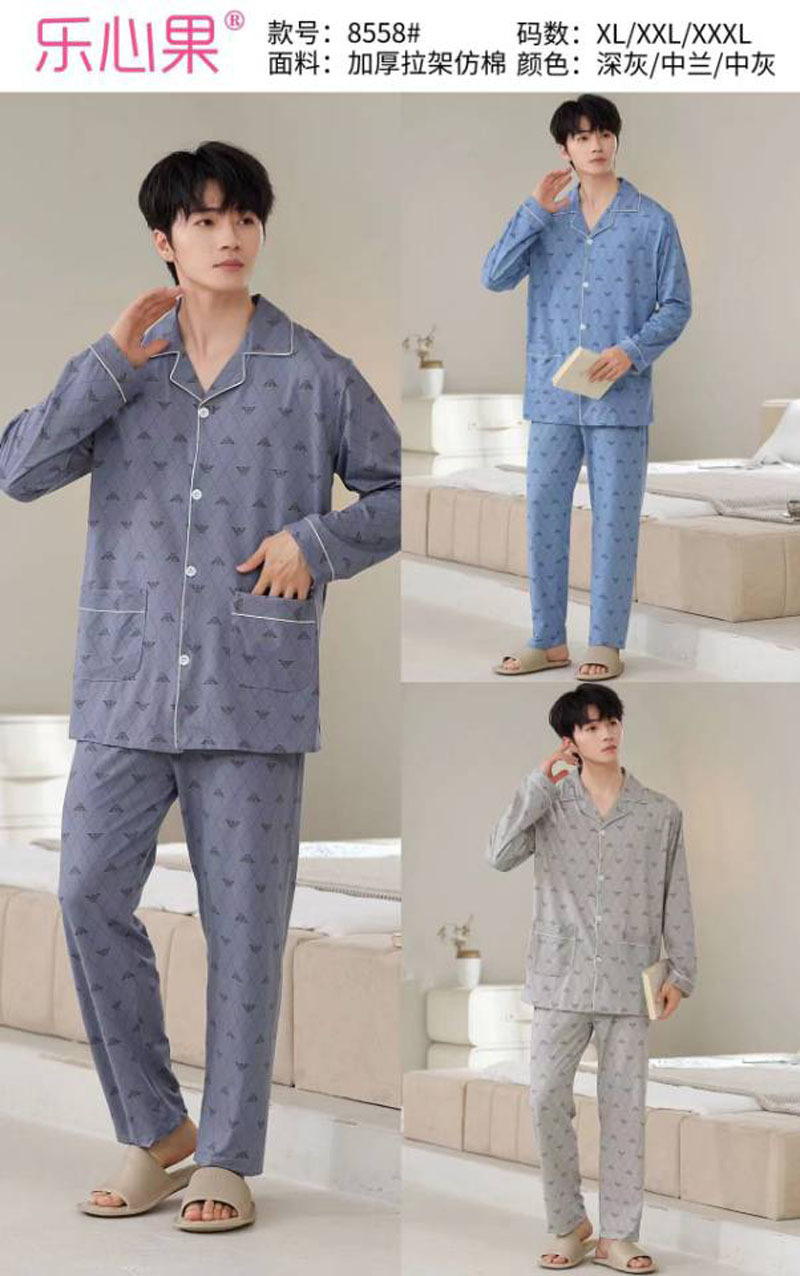 Le Xin Guo 피부 친화적 인 면화 모조 면 긴 소매 바지 홈 의류 카디건 세트 남성 25 개의 새로운 리버스 칼라 더블 롱 파자마스토어 가기