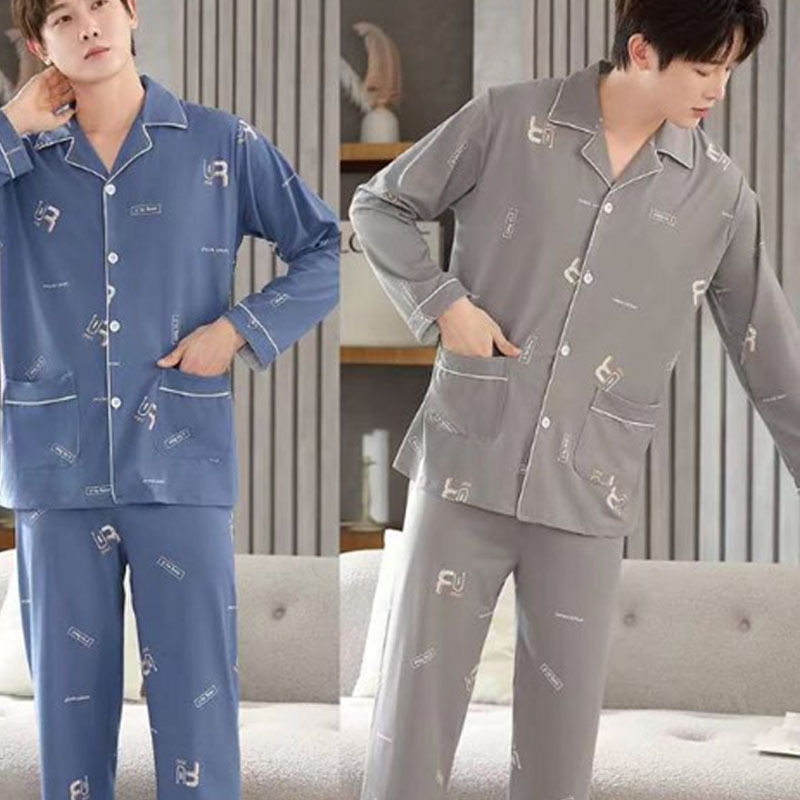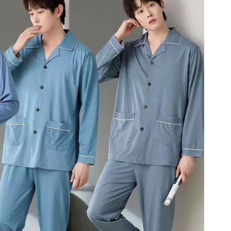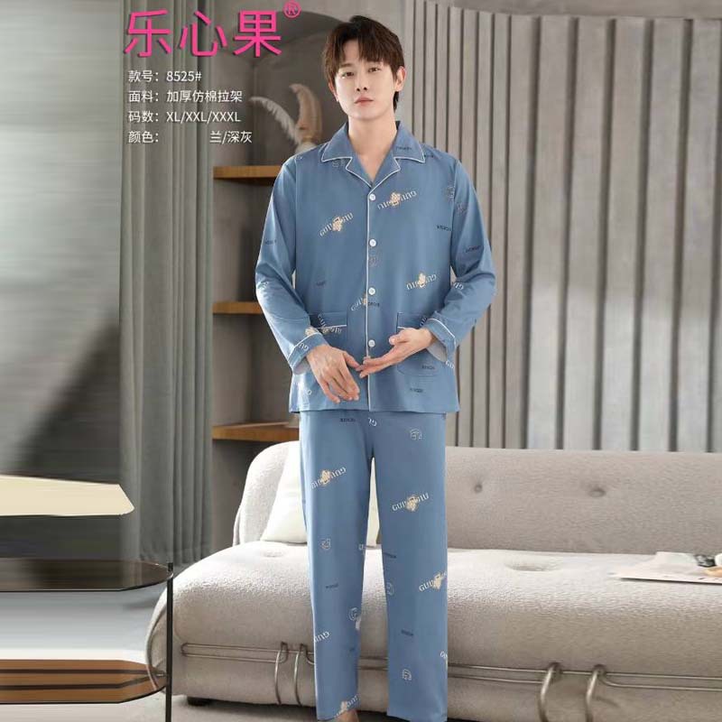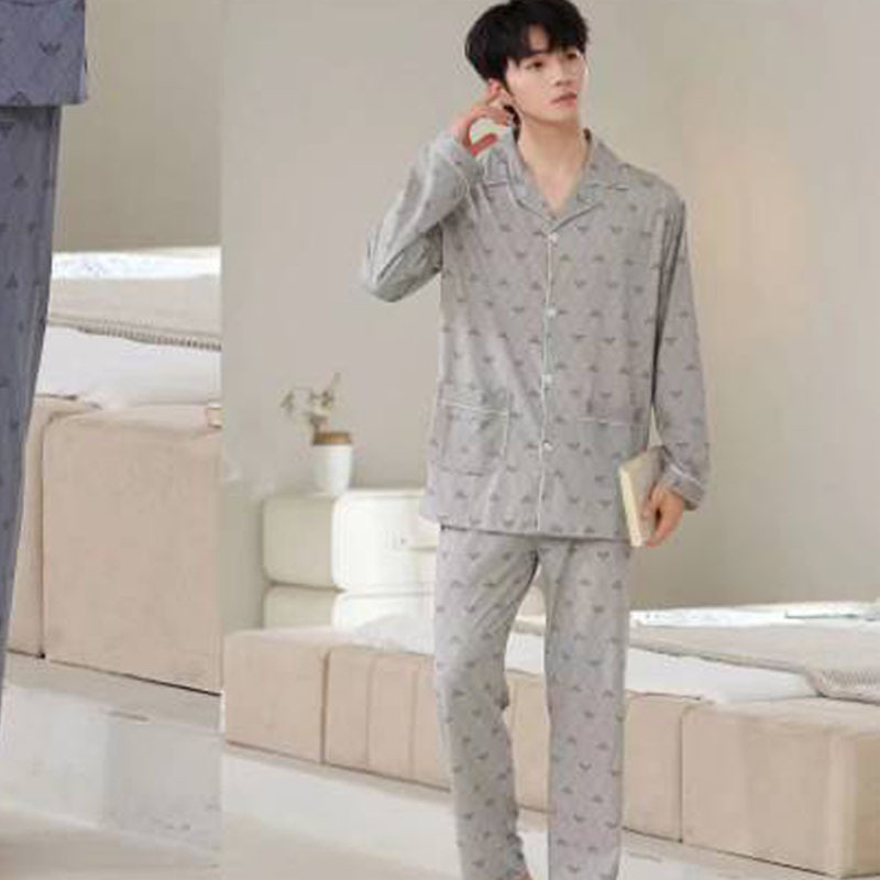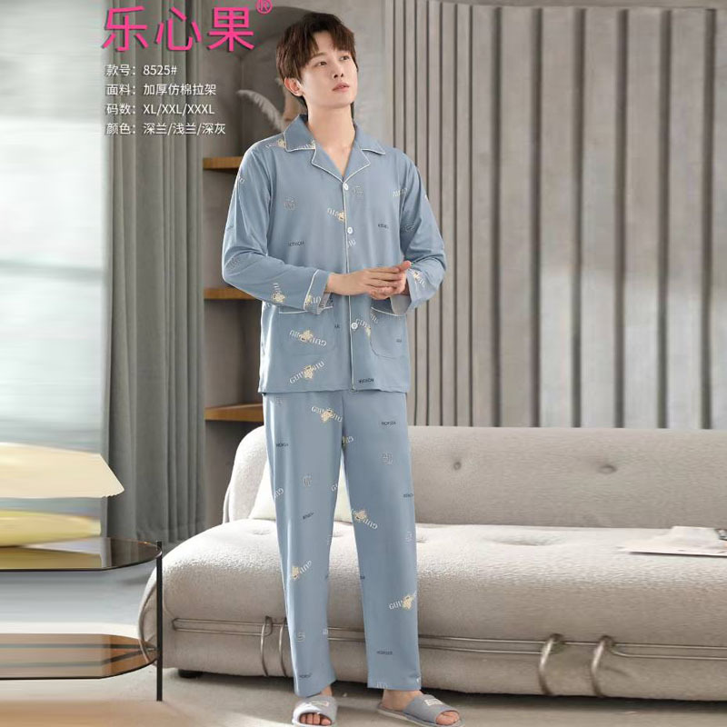 Le Xin Guo 피부 친화적 인 면화 모조 면 긴 소매 바지 홈 의류 카디건 세트 남성 25 개의 새로운 리버스 칼라 더블 롱 파자마