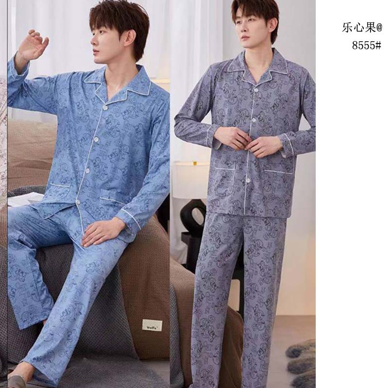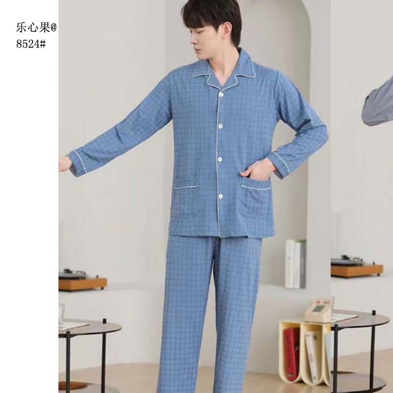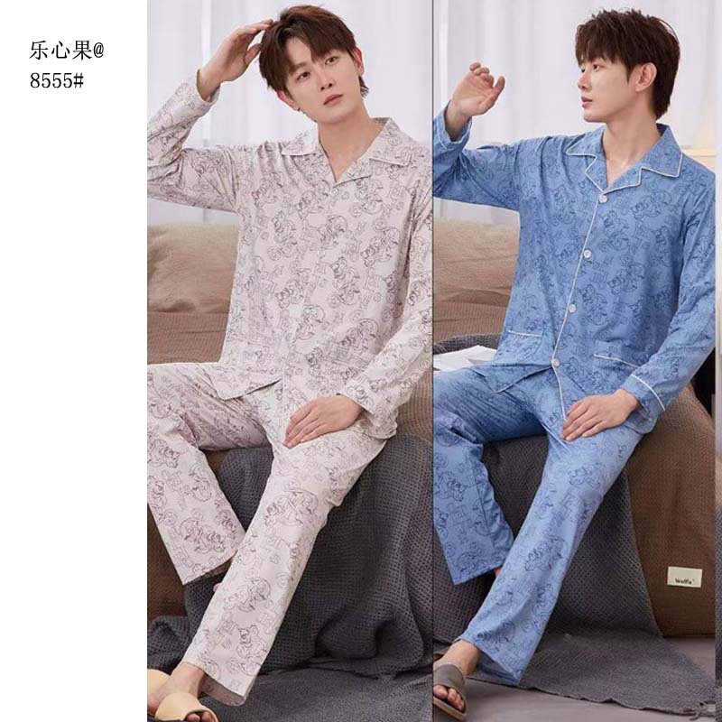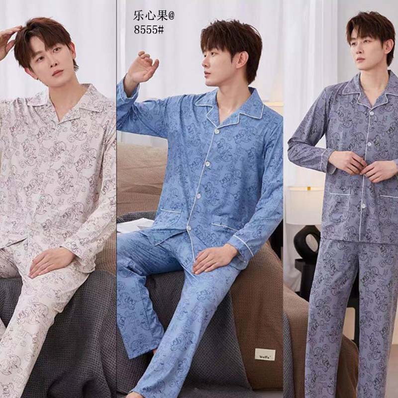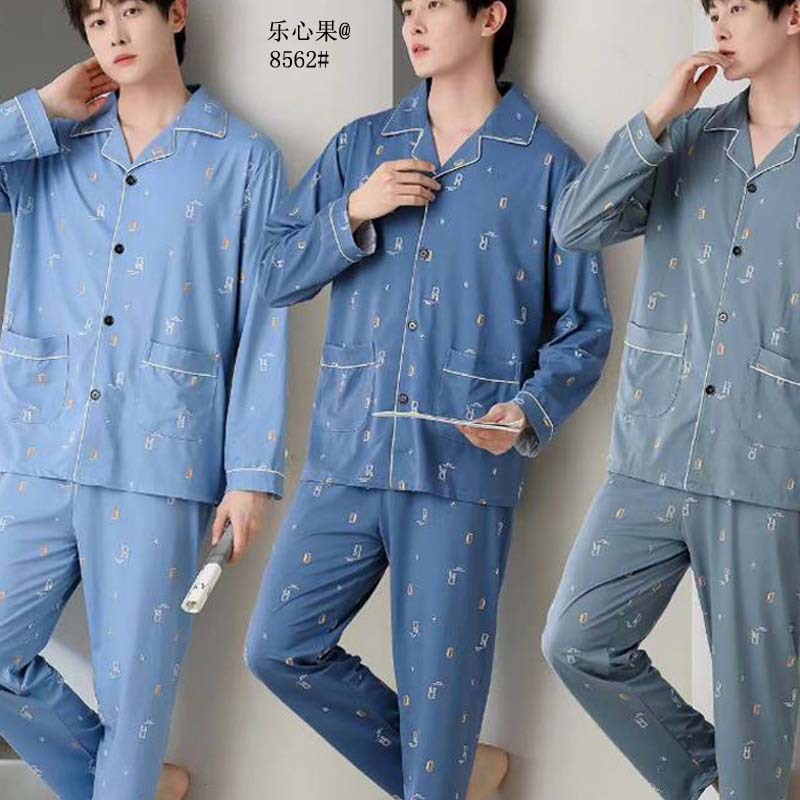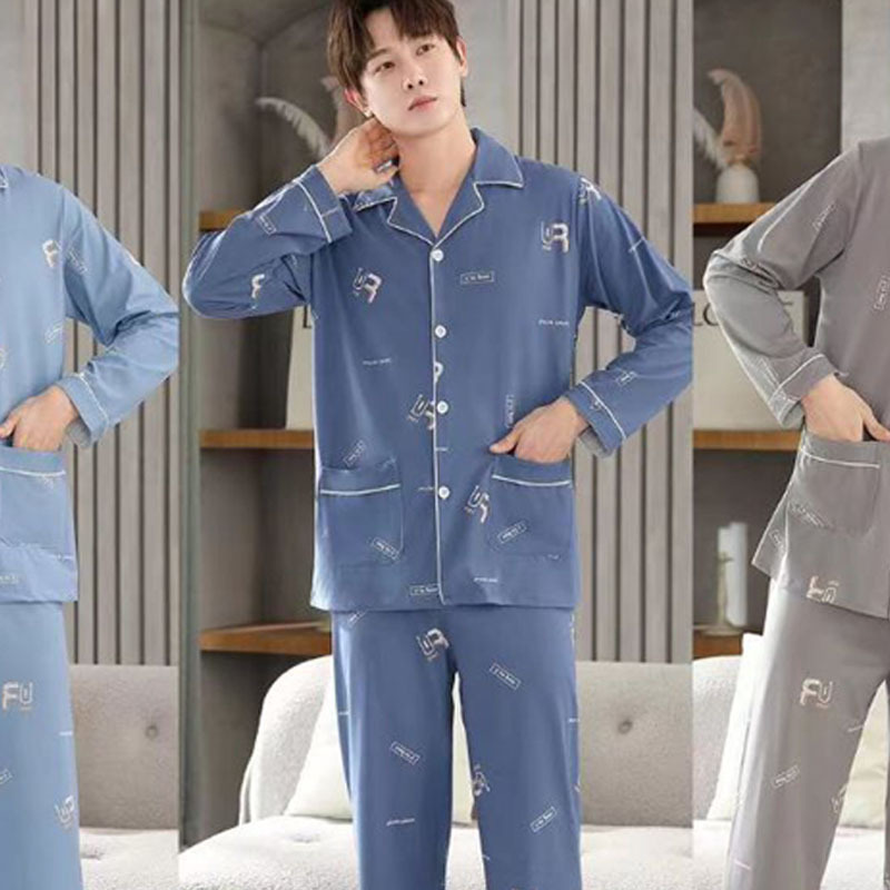 Le Xin Guo 피부 친화적 인 면화 모조 면 긴 소매 바지 홈 의류 카디건 세트 남성 25 개의 새로운 리버스 칼라 더블 롱 파자마