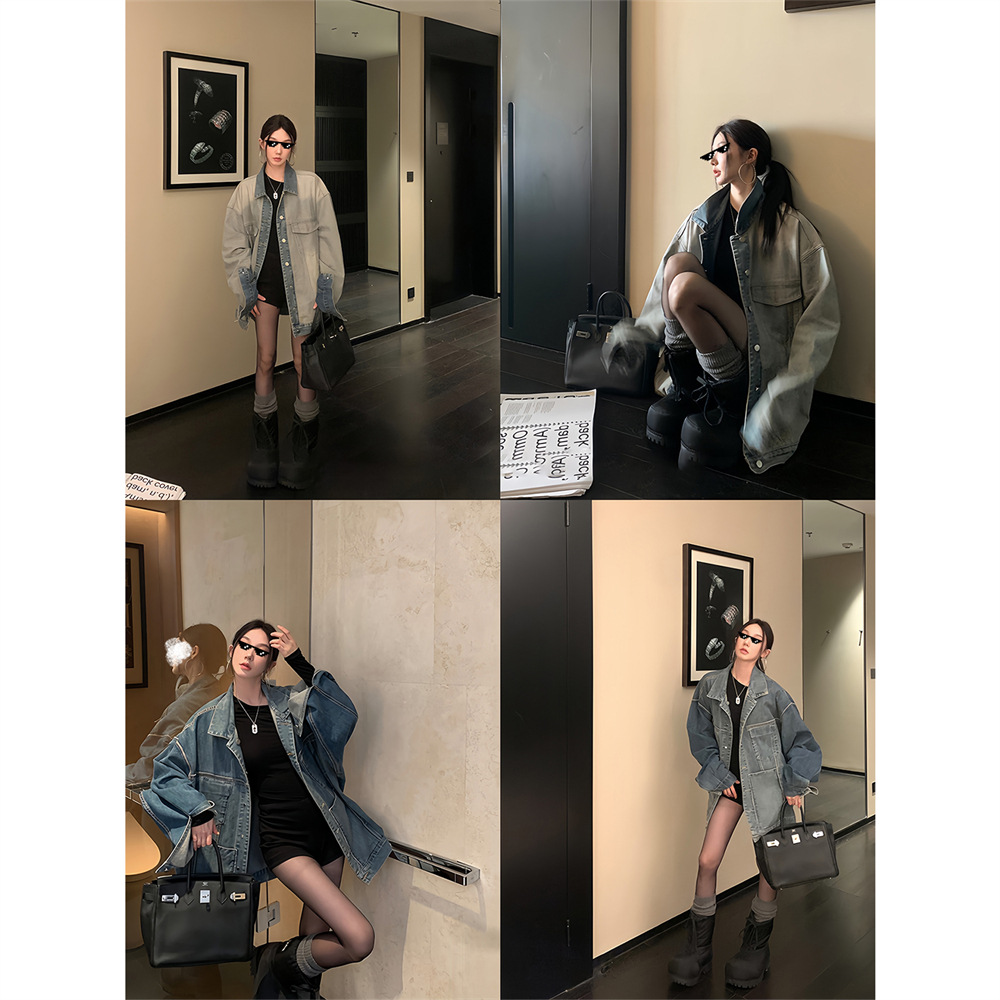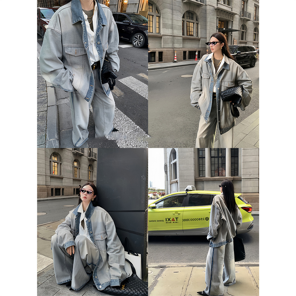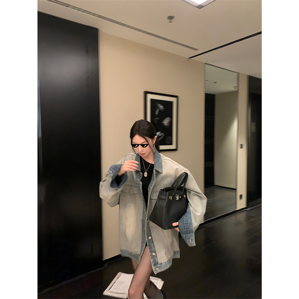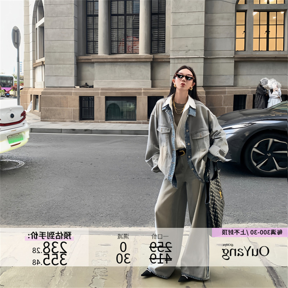 Ouyang 양면 데님 재킷 여성의 가을 느슨한 복고풍 재킷 디자인 틈새 캐주얼 탑스토어 가기