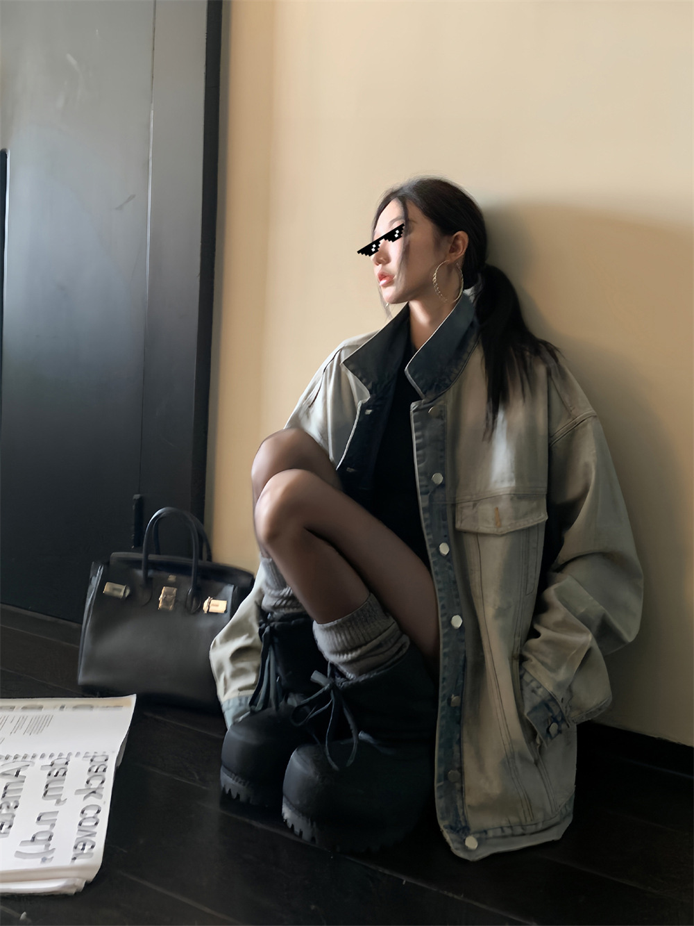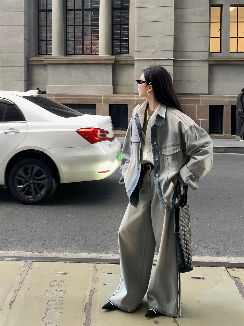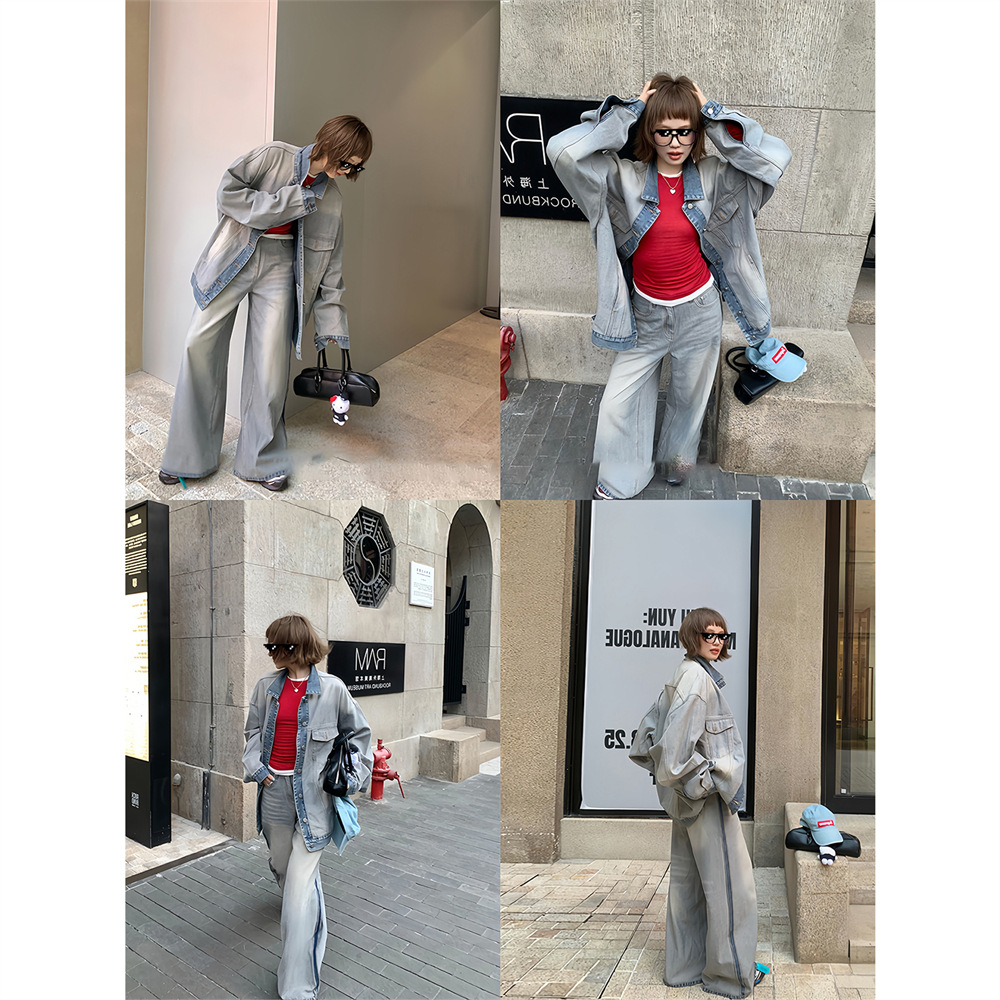 Ouyang 양면 데님 재킷 여성의 가을 느슨한 복고풍 재킷 디자인 틈새 캐주얼 탑스토어 가기