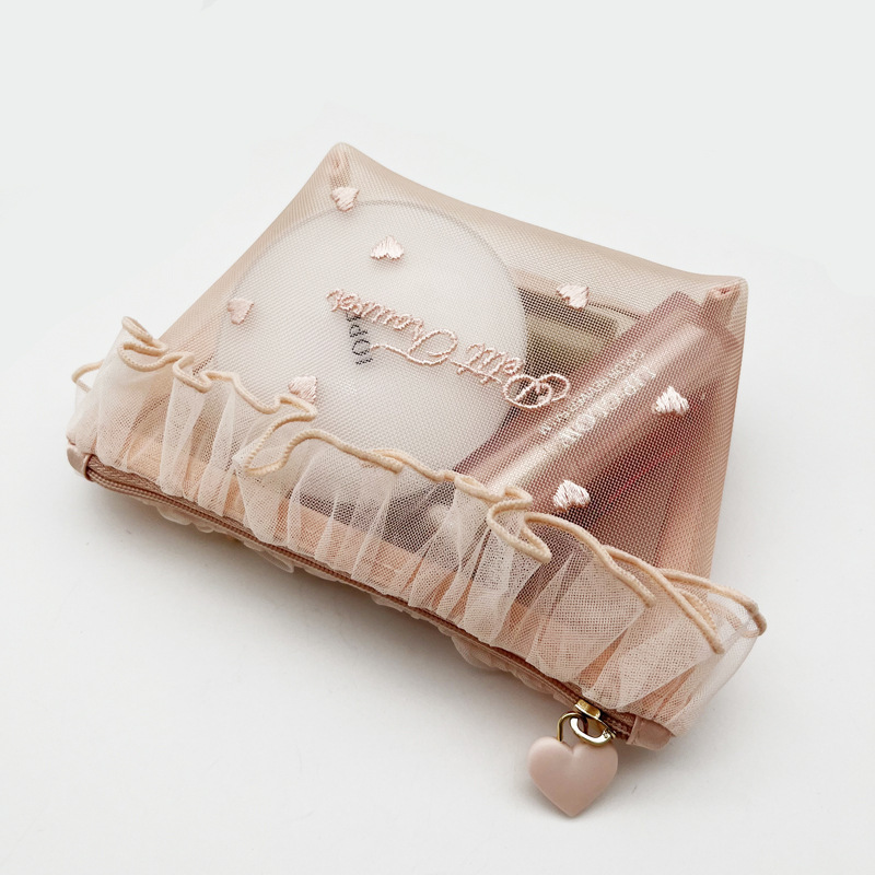 쁘띠 트루 메쉬 사랑 자수 레이스 휴대용 화장품 가방 귀여운 티슈 가방 메이크업 보관 가방스토어 가기