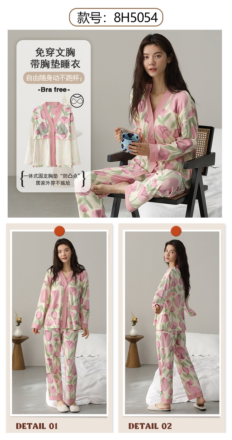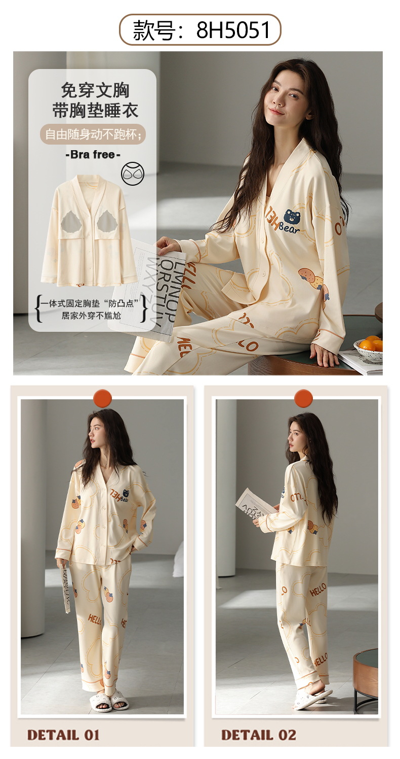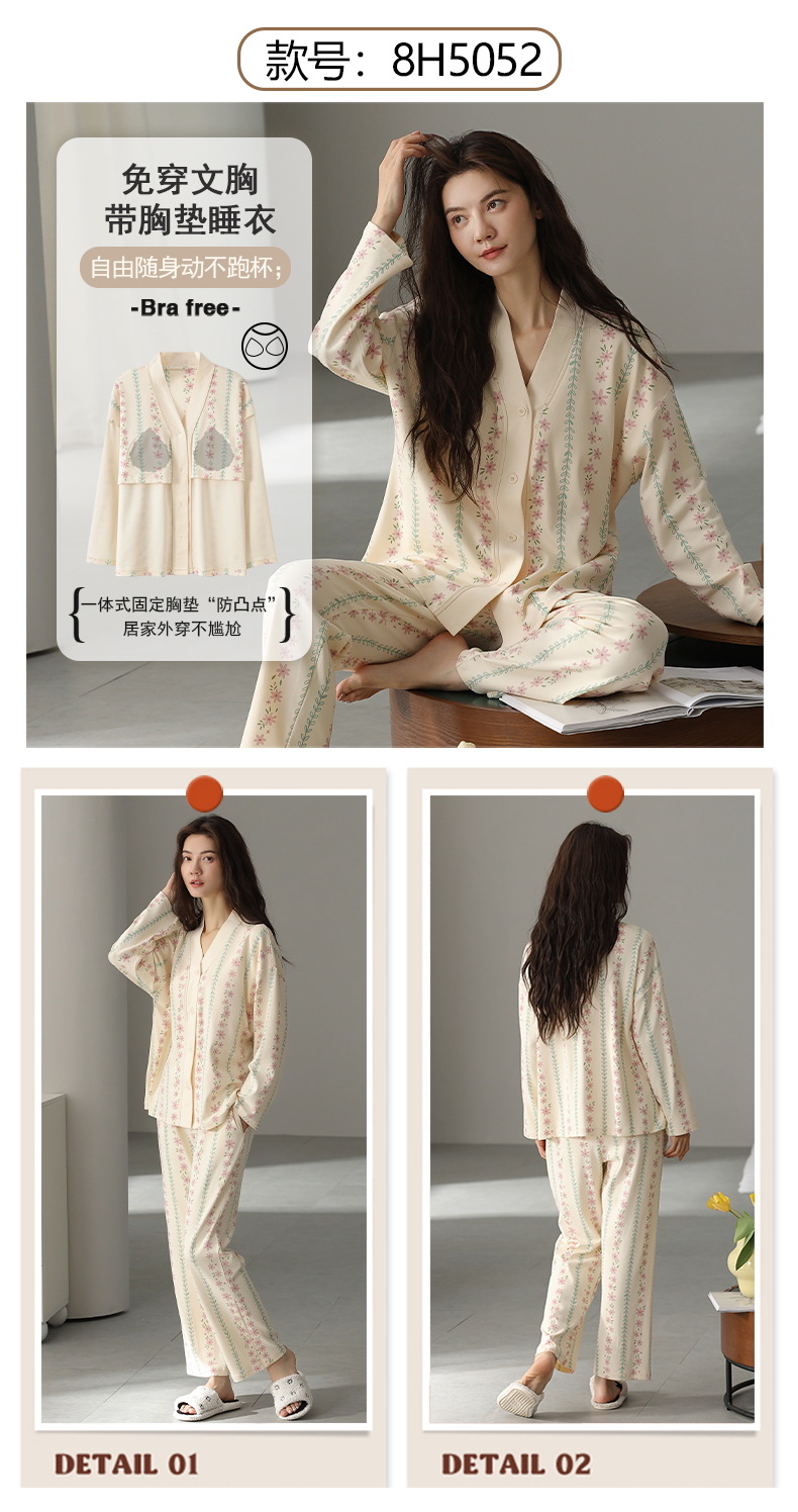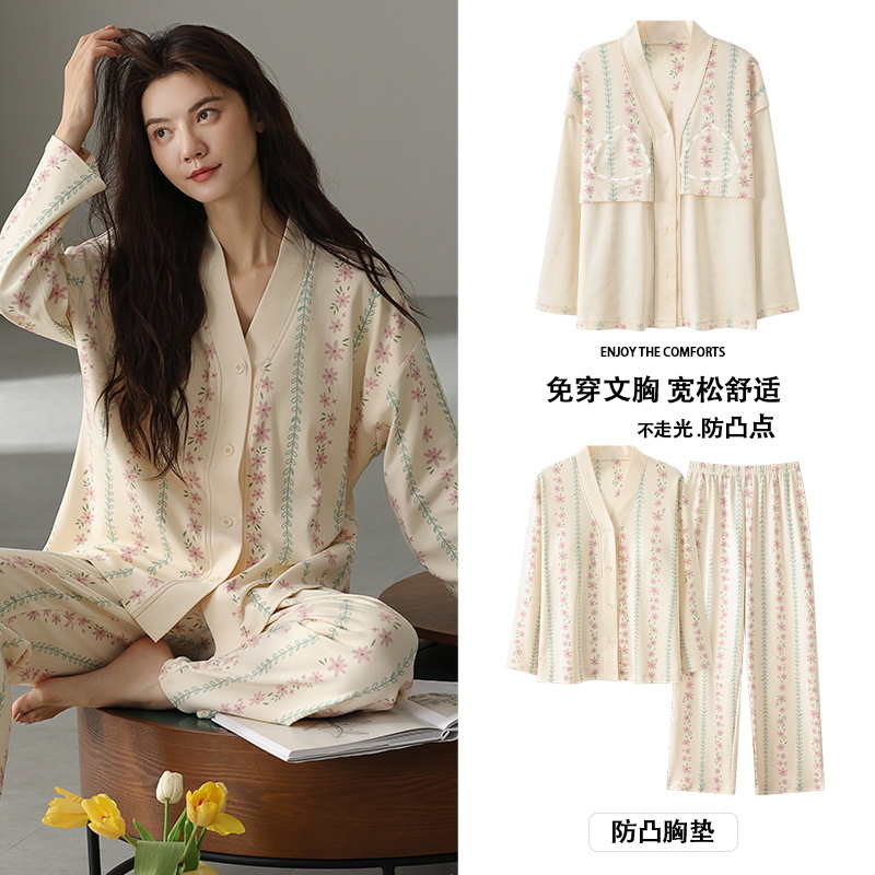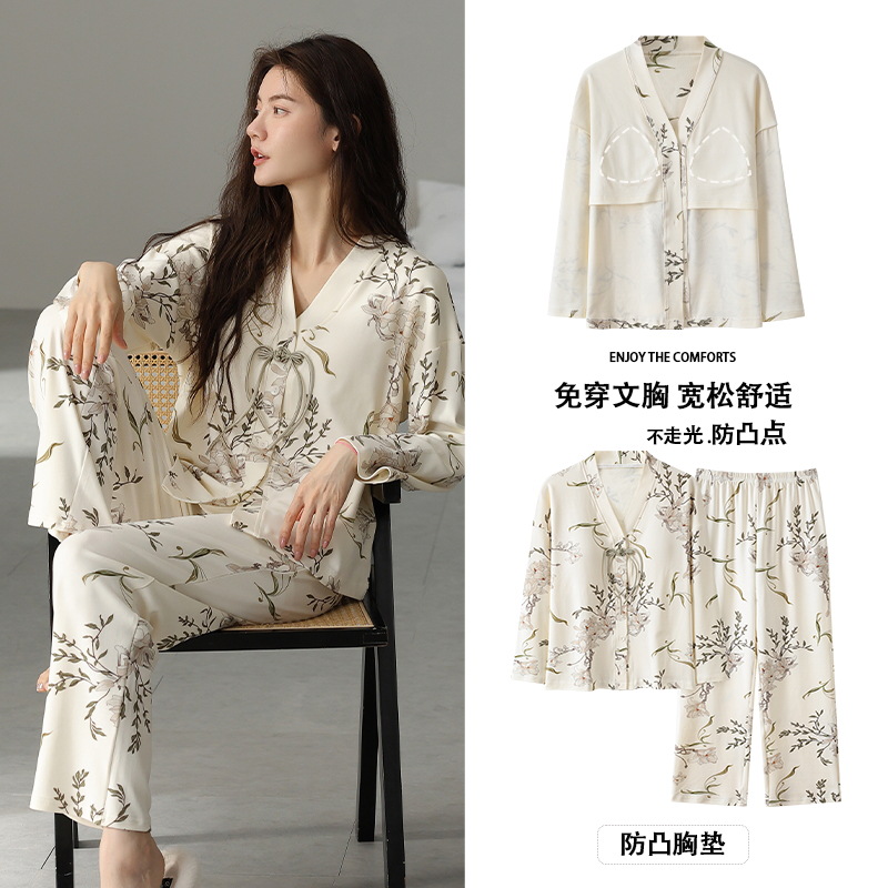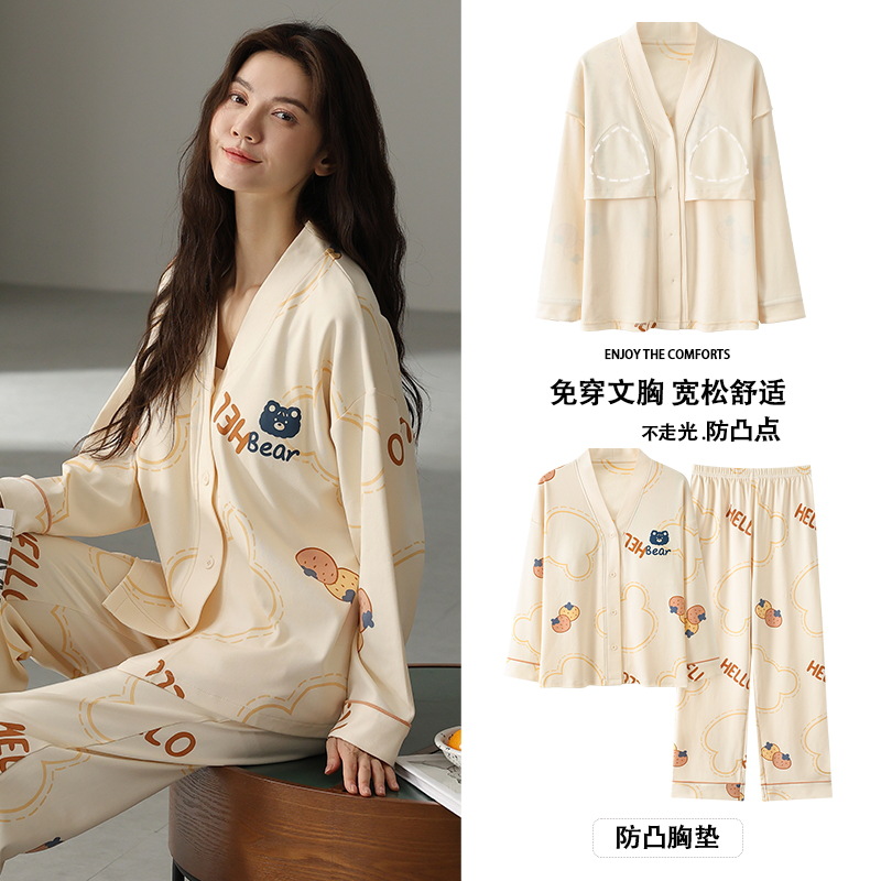 코튼 파자마 여성의 봄과 가을 가슴 패드 하나 2024 새로운 긴 소매 카디건 외부 착용 홈 의류 세트스토어 가기