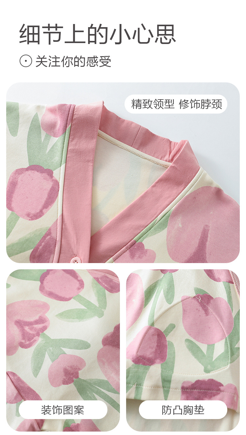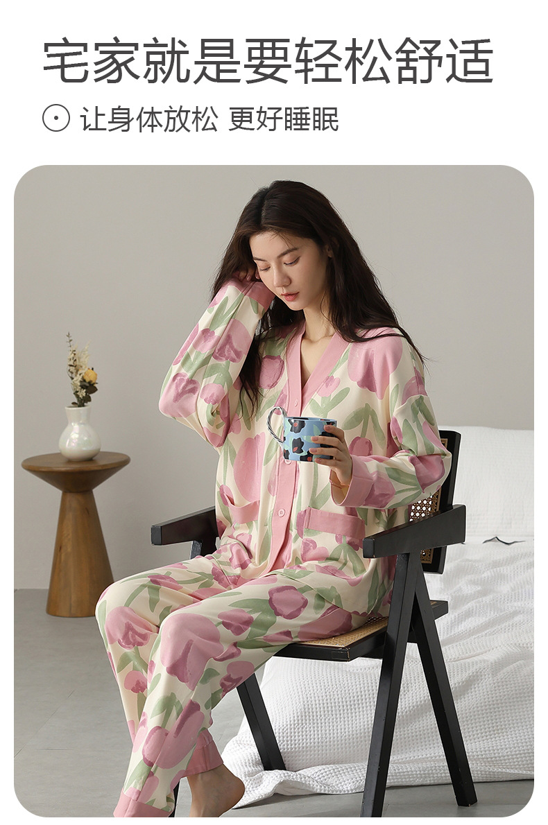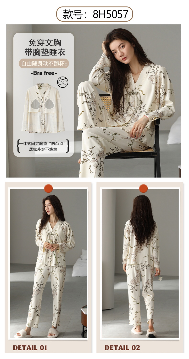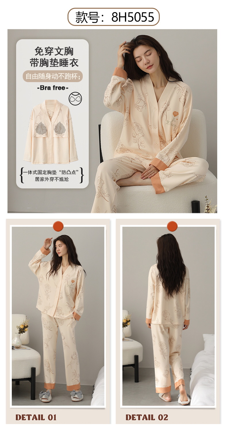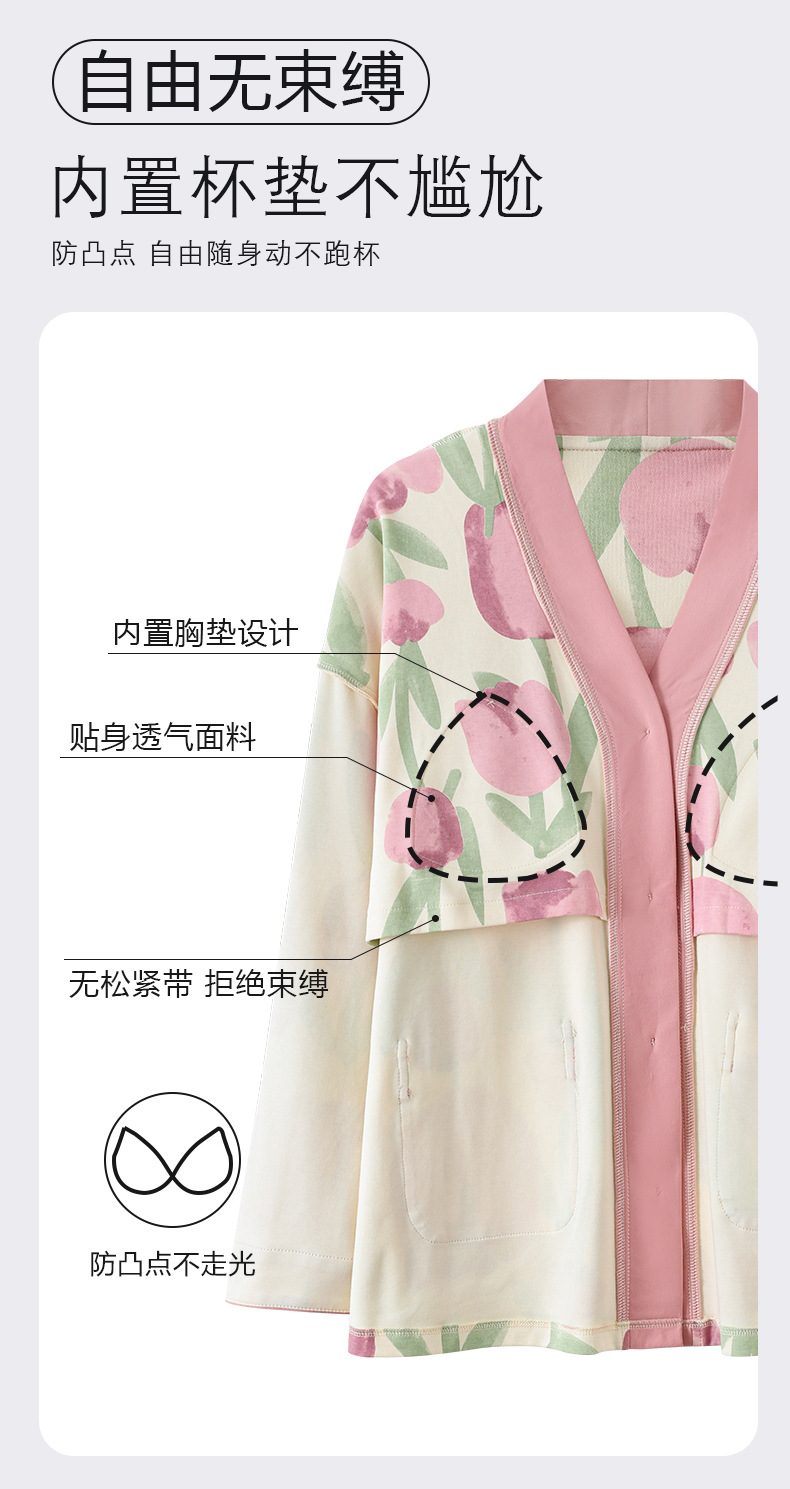 코튼 파자마 여성의 봄과 가을 가슴 패드 하나 2024 새로운 긴 소매 카디건 외부 착용 홈 의류 세트스토어 가기
