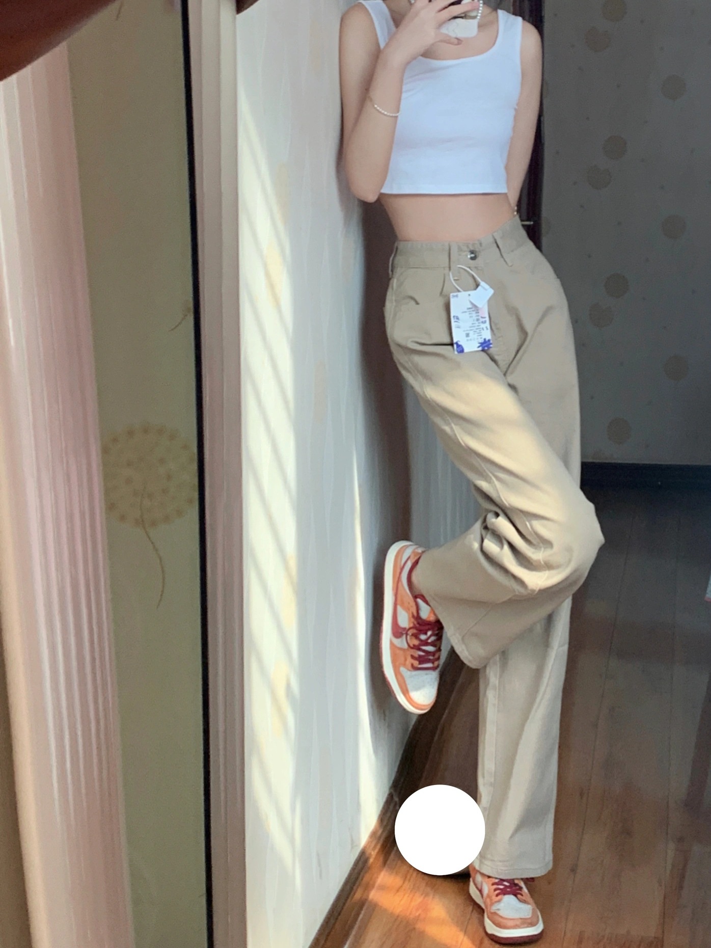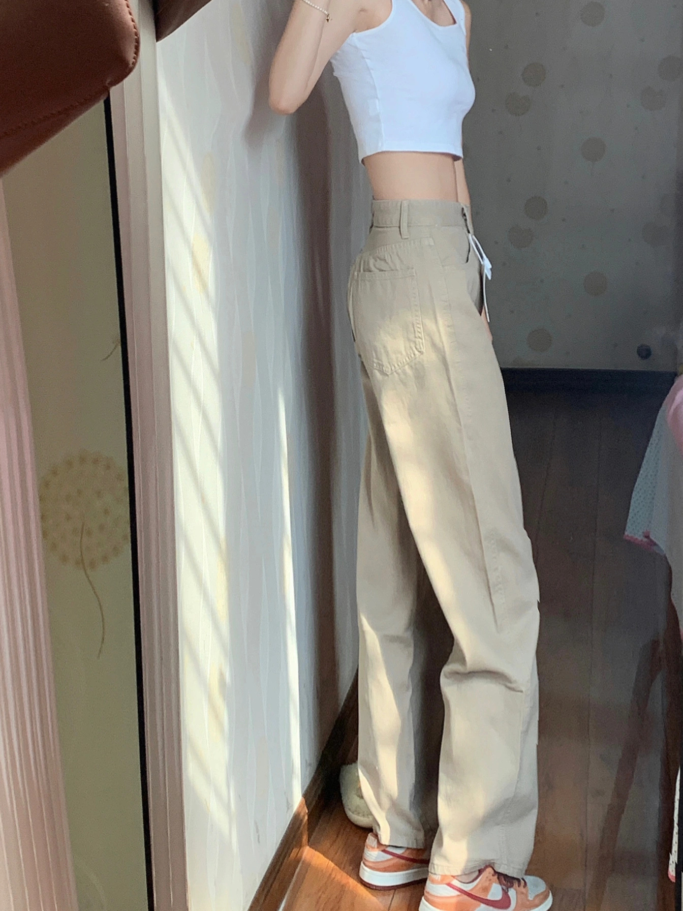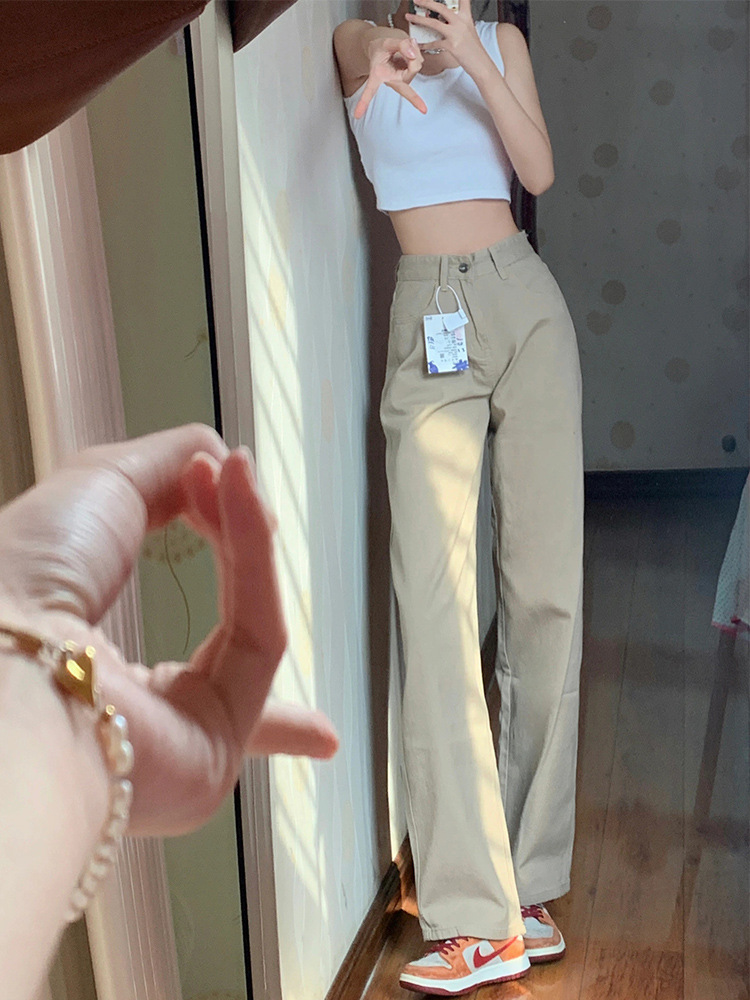 카키 좁은 직선 청바지 여성의 2024 새로운 높은 허리 더미 느슨한 슬림 넓은 다리 바지스토어 가기