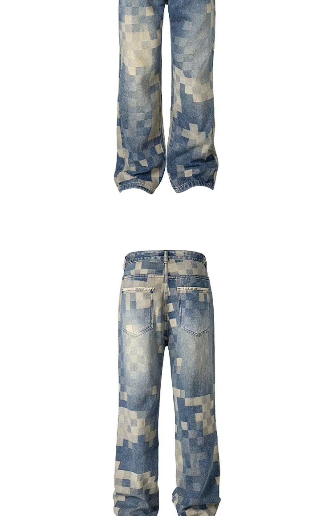 모자이크 체커 보드 청바지 남성 가을 패션 브랜드 스트레이트 루즈 하이 스트리트 와이드 레그 미국 스타일 독특한 긴 바지
