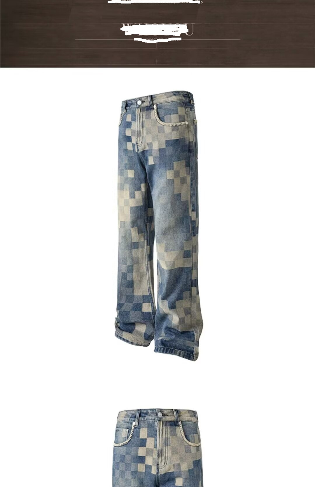 모자이크 체커 보드 청바지 남성 가을 패션 브랜드 스트레이트 루즈 하이 스트리트 와이드 레그 미국 스타일 독특한 긴 바지스토어 가기