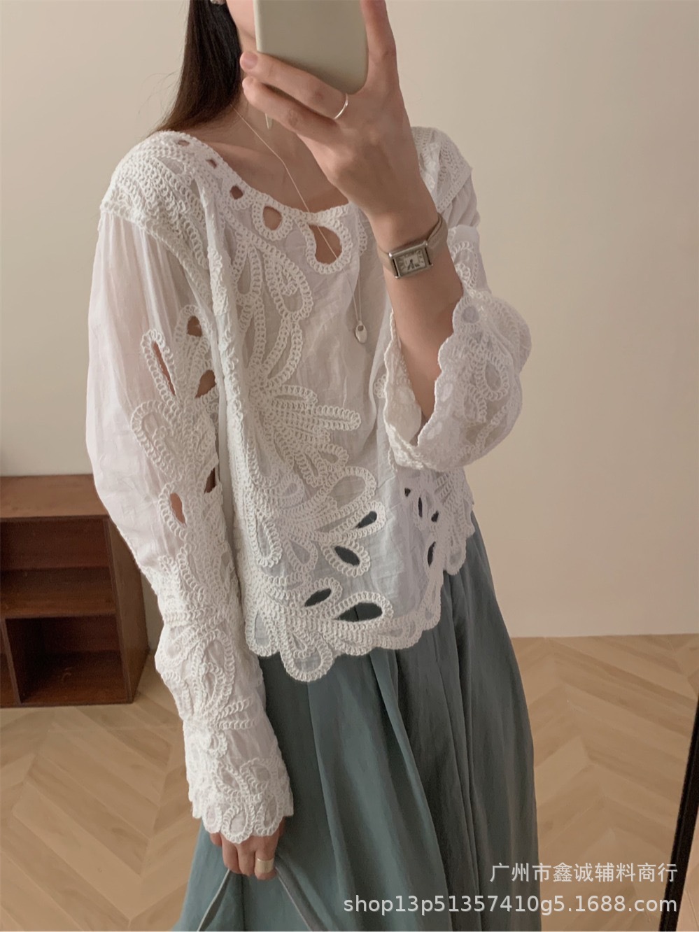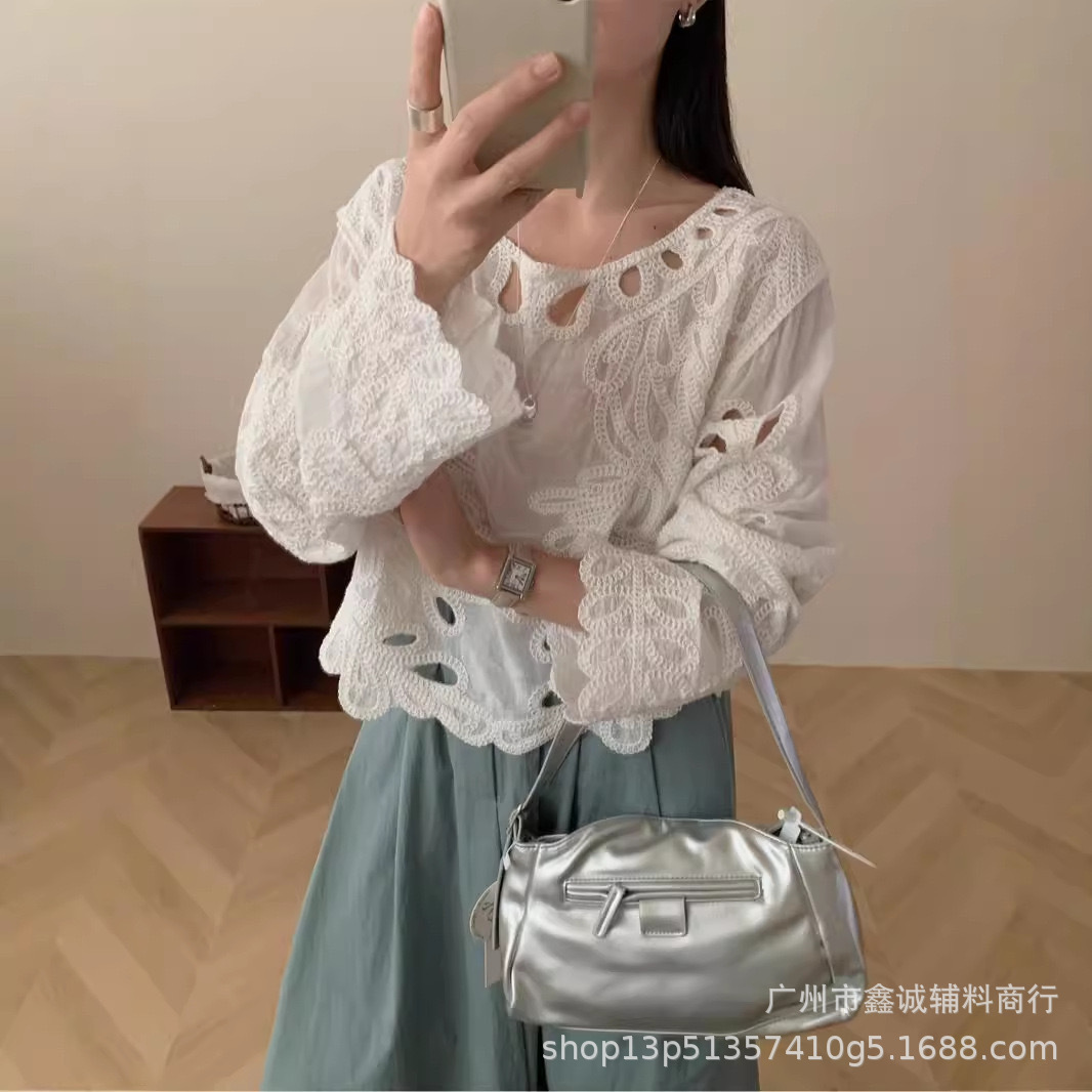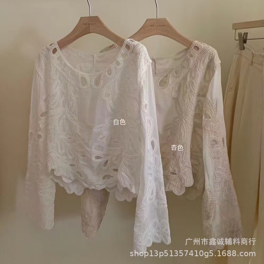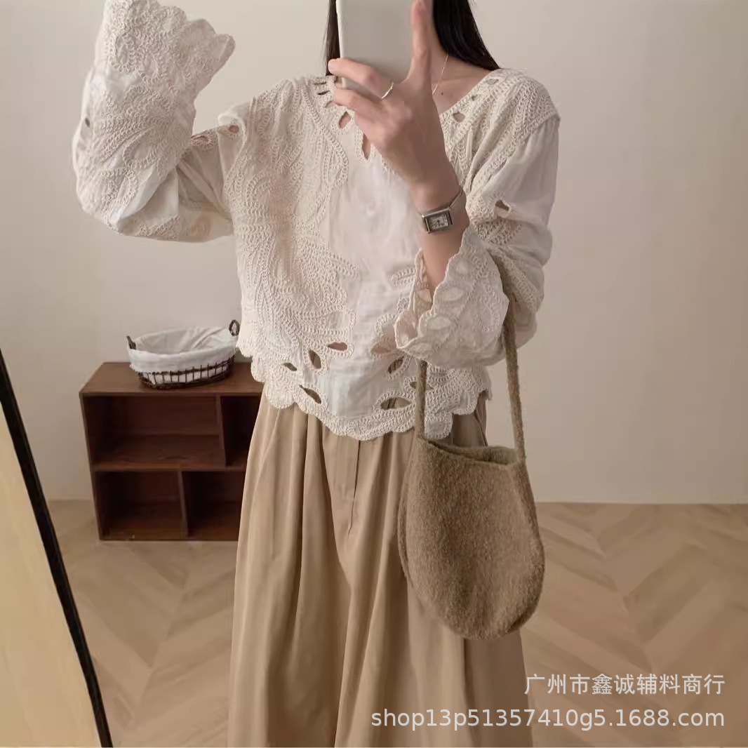 봄 · 가을 한국 동대문 할로우 긴소매 셔츠 면 리넨 레이스 프라이드 스트리트 디자인 센스 패션 루즈 여성 탑