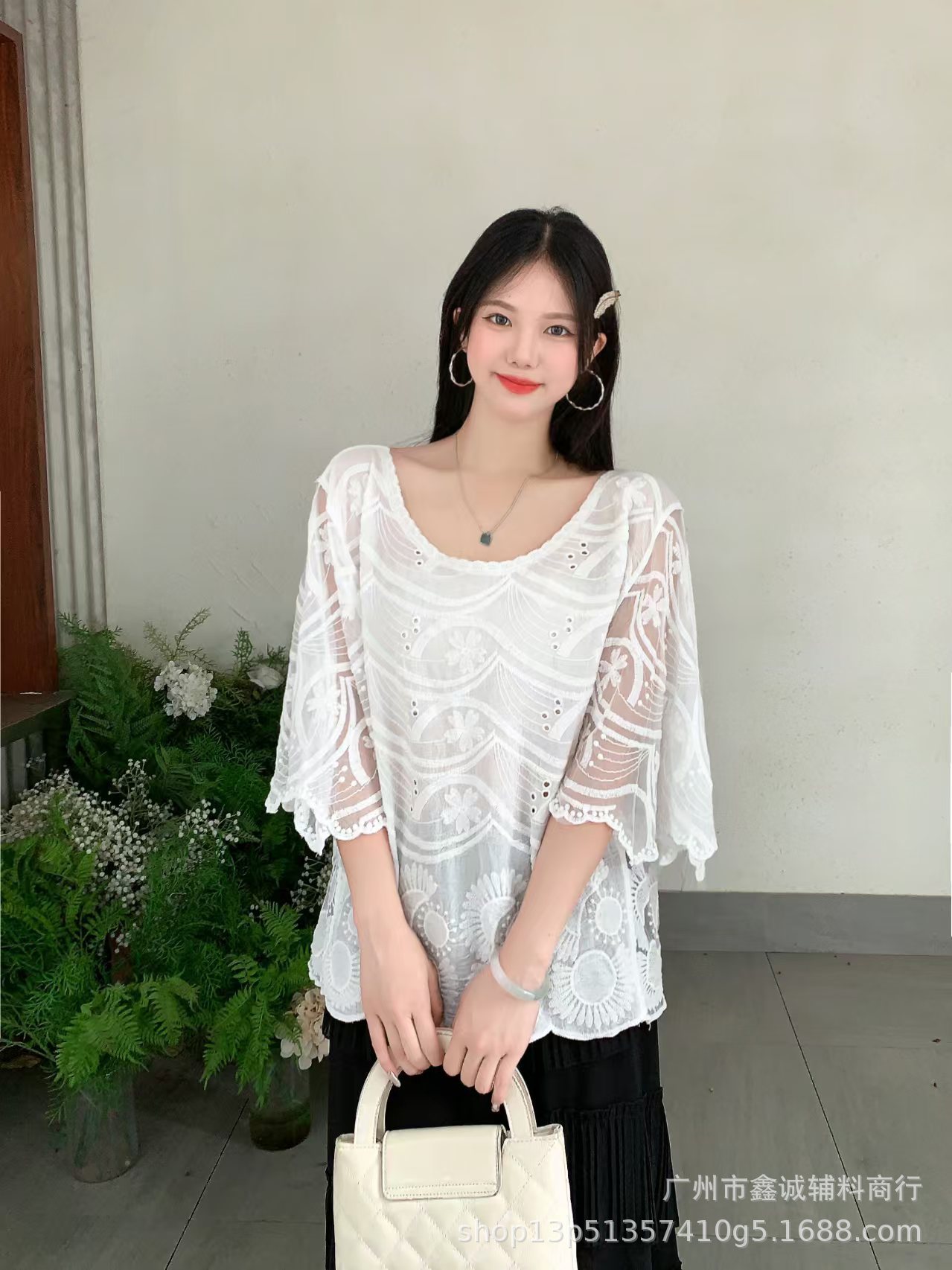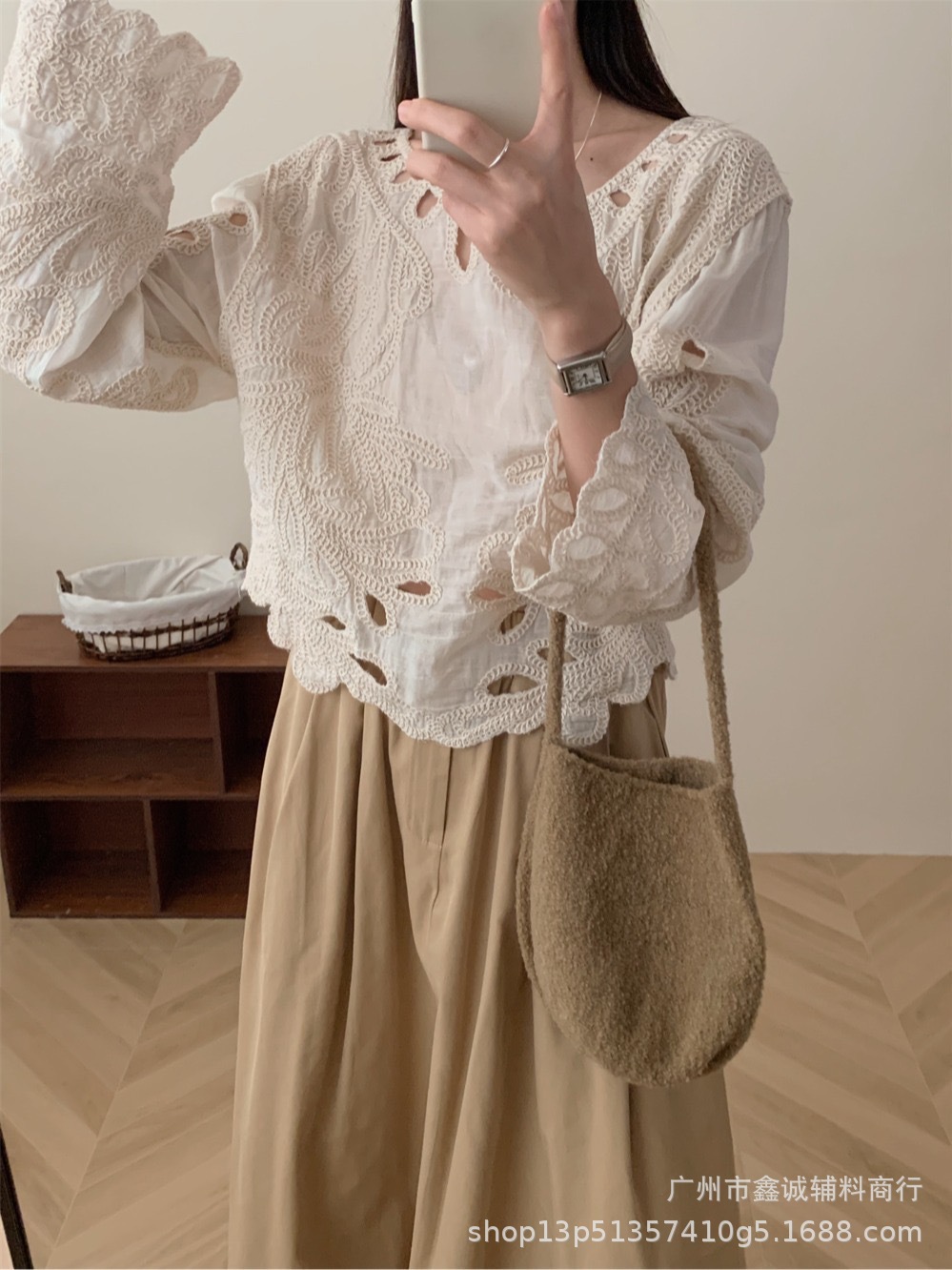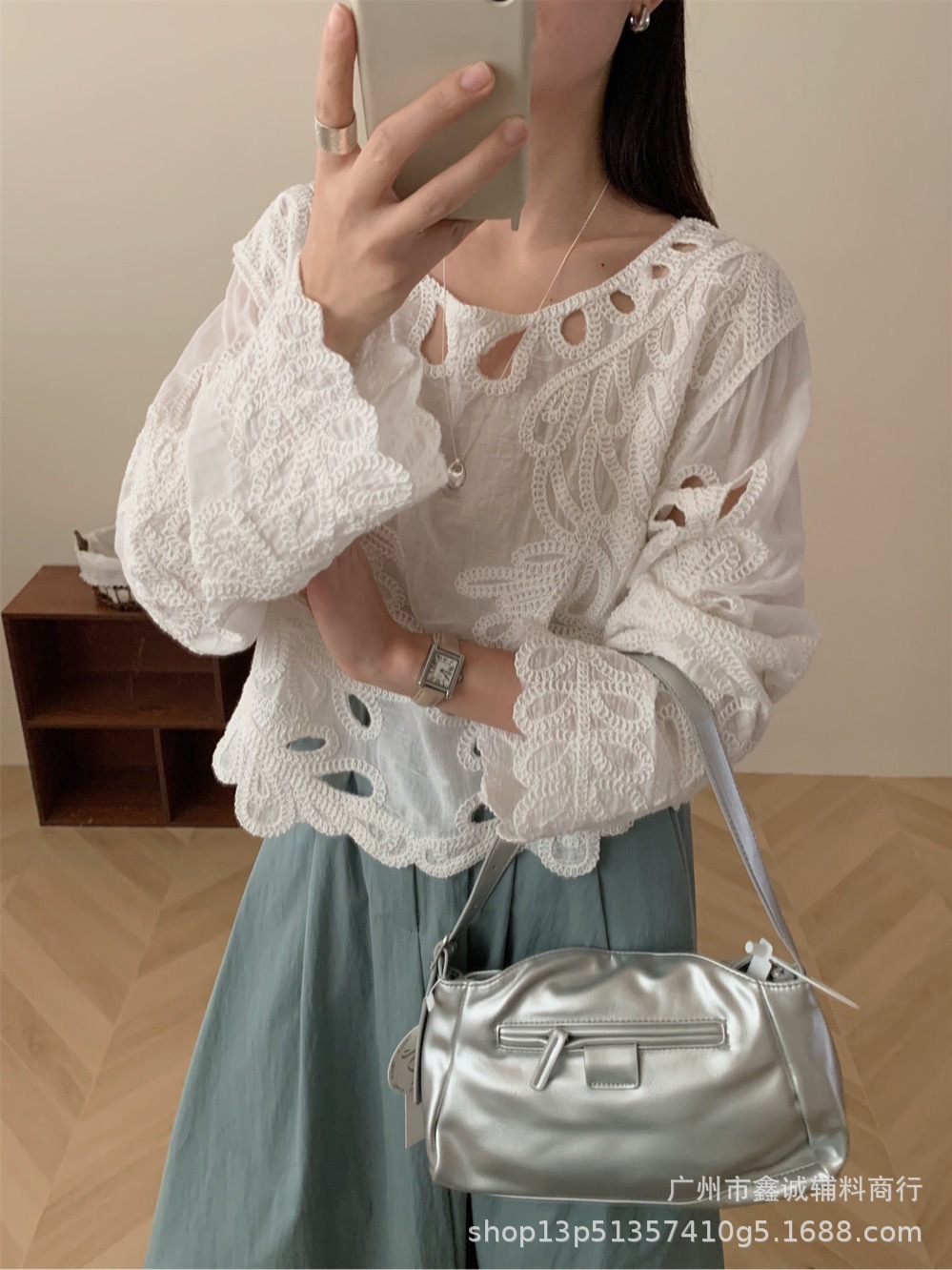 봄 · 가을 한국 동대문 할로우 긴소매 셔츠 면 리넨 레이스 프라이드 스트리트 디자인 센스 패션 루즈 여성 탑