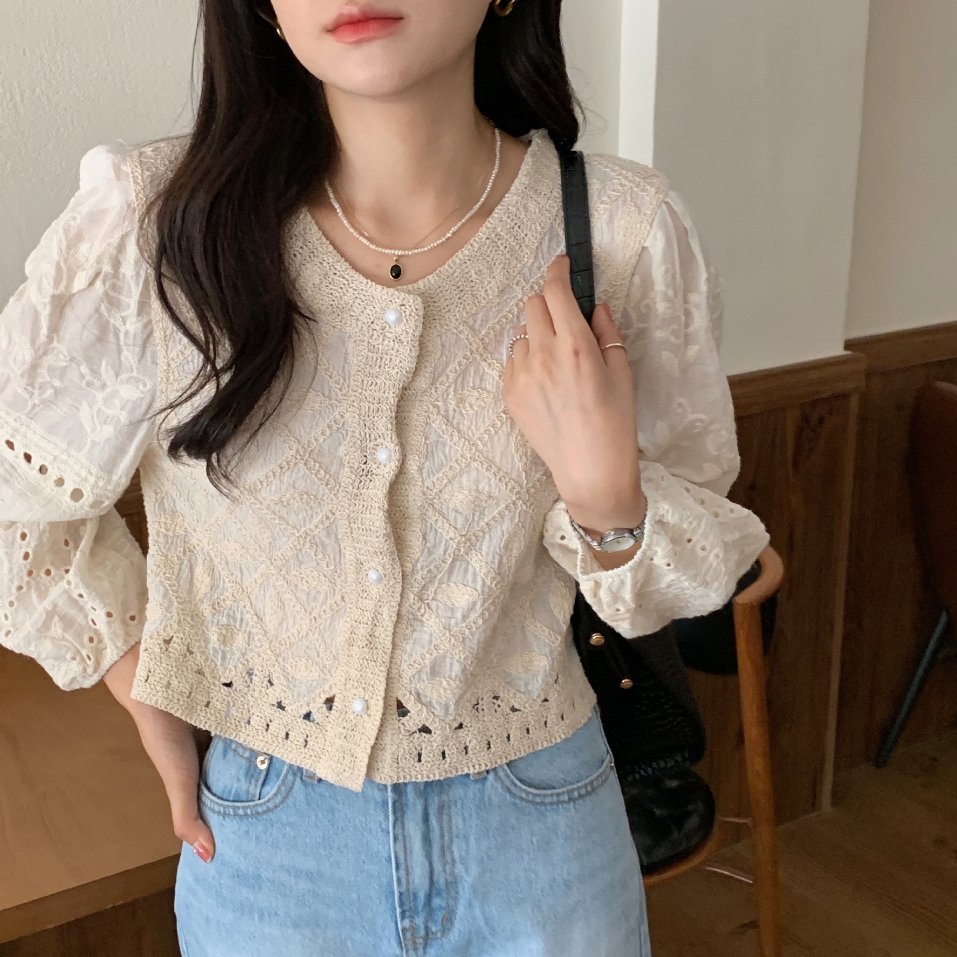 봄 · 가을 한국 동대문 할로우 긴소매 셔츠 면 리넨 레이스 프라이드 스트리트 디자인 센스 패션 루즈 여성 탑스토어 가기