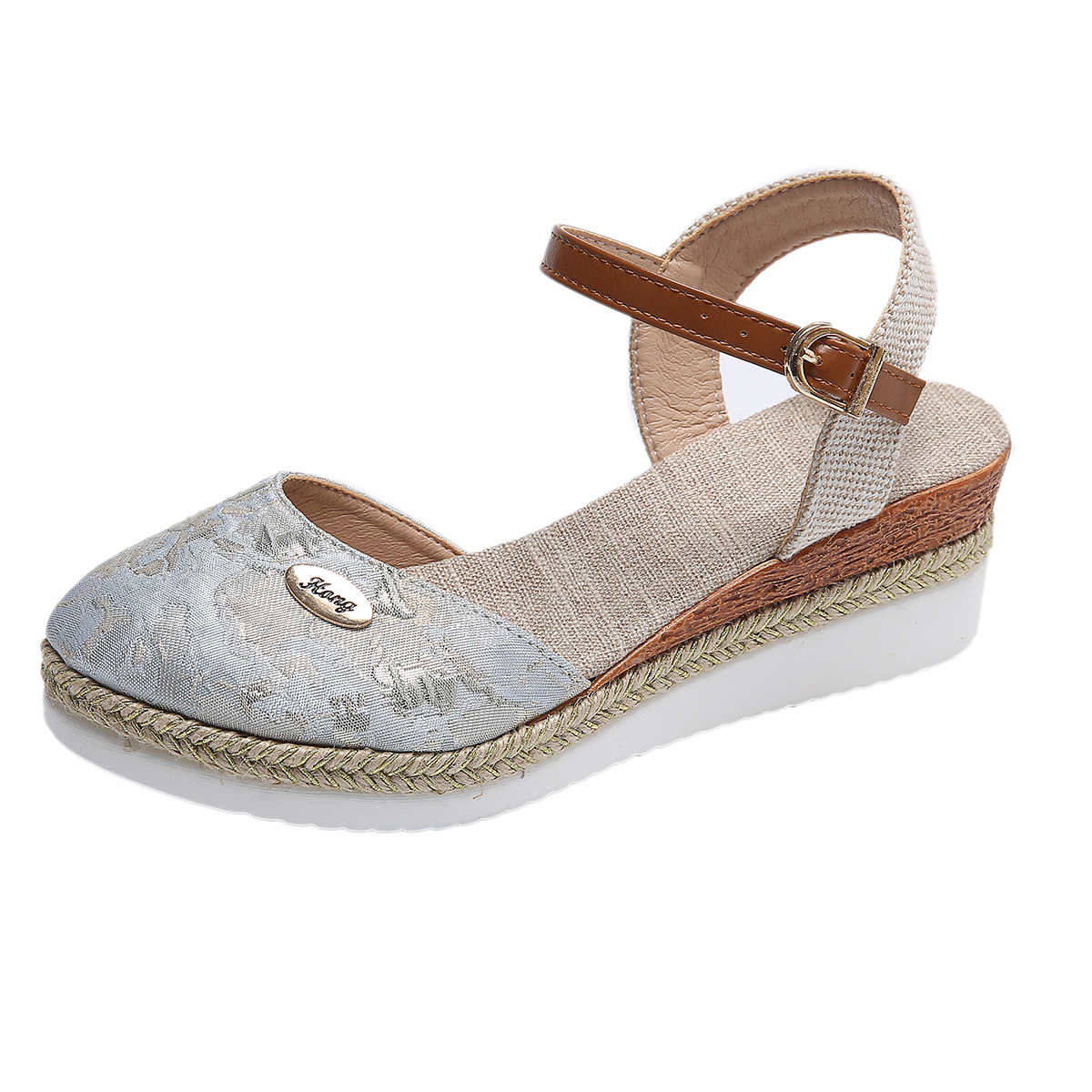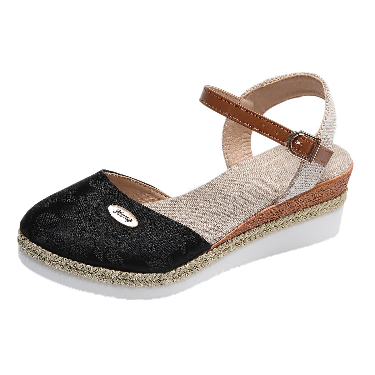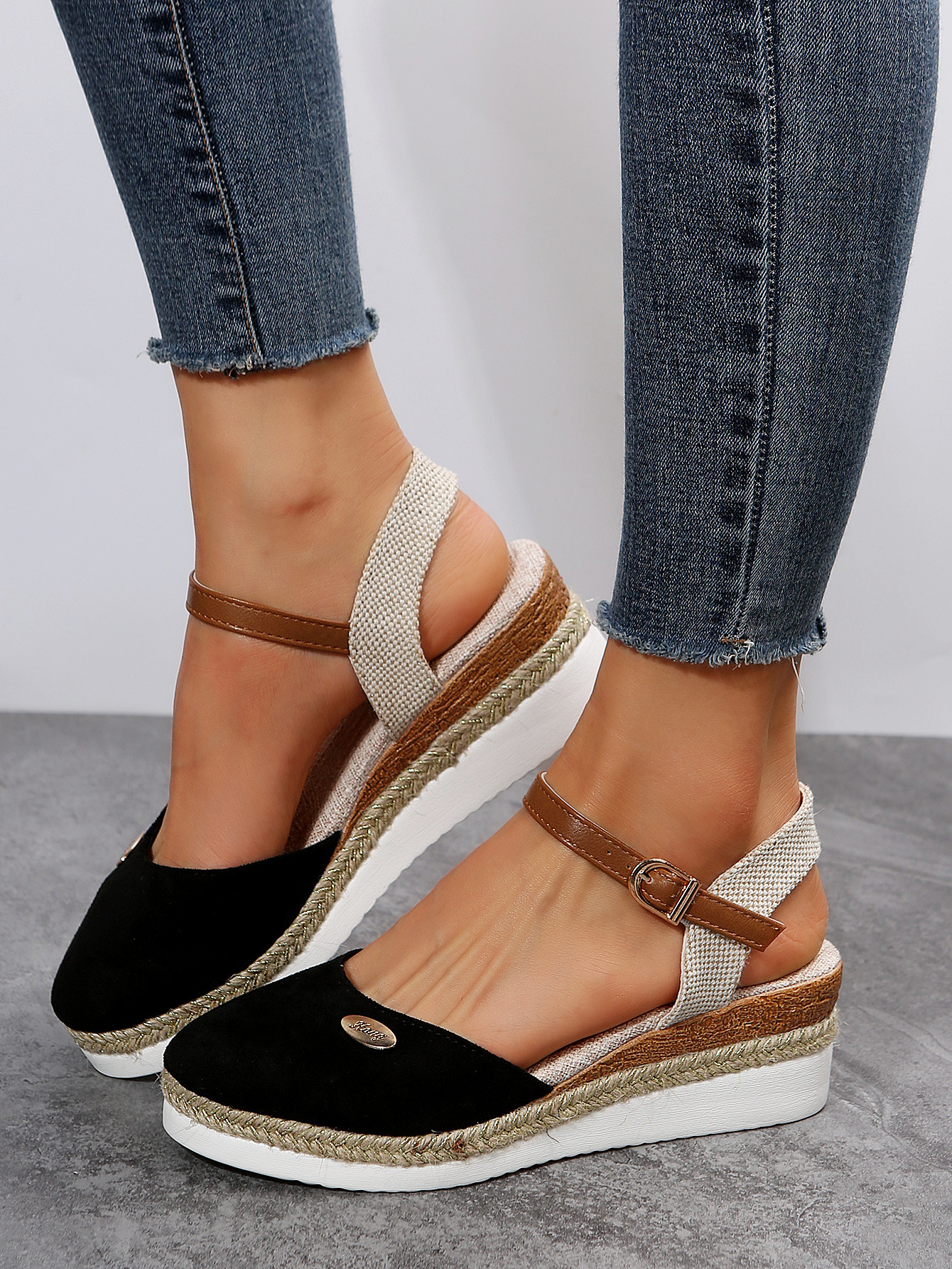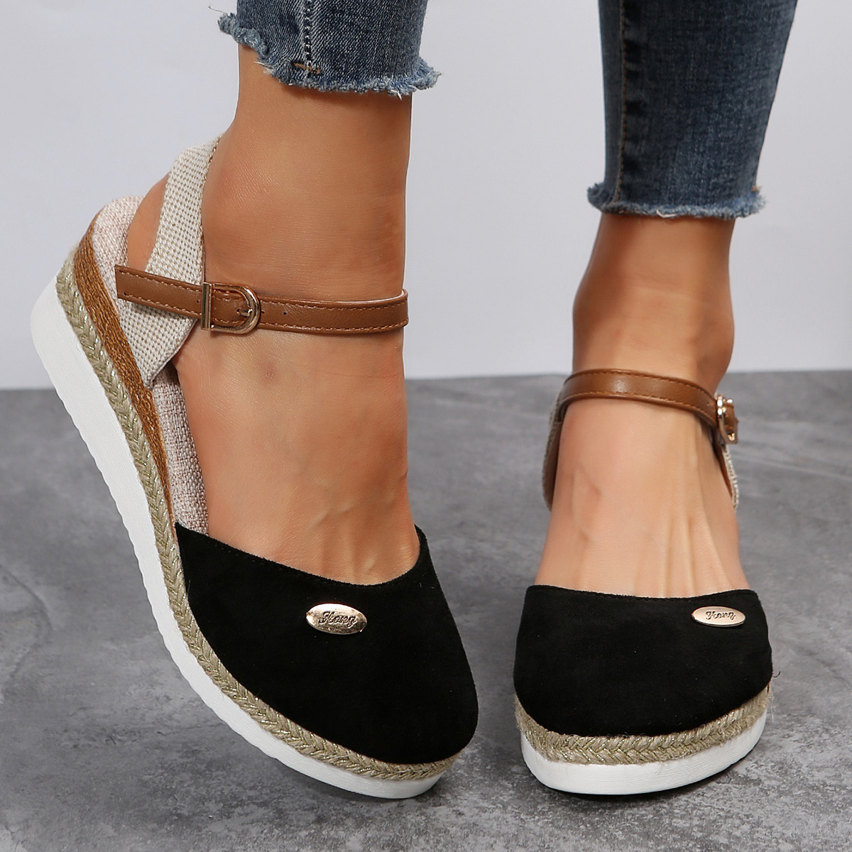 2024 년 새로운 유럽 및 미국 플러스 사이즈 대외 무역 로마 샌들 여성 봄과 여름 커버 발가락 가방 웨지 버클 대마 바닥 샌들