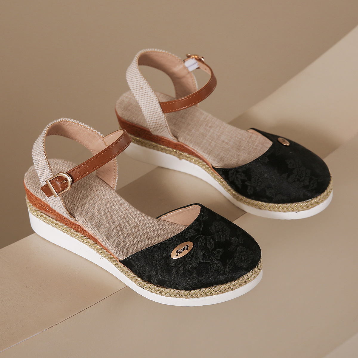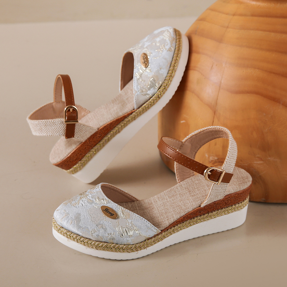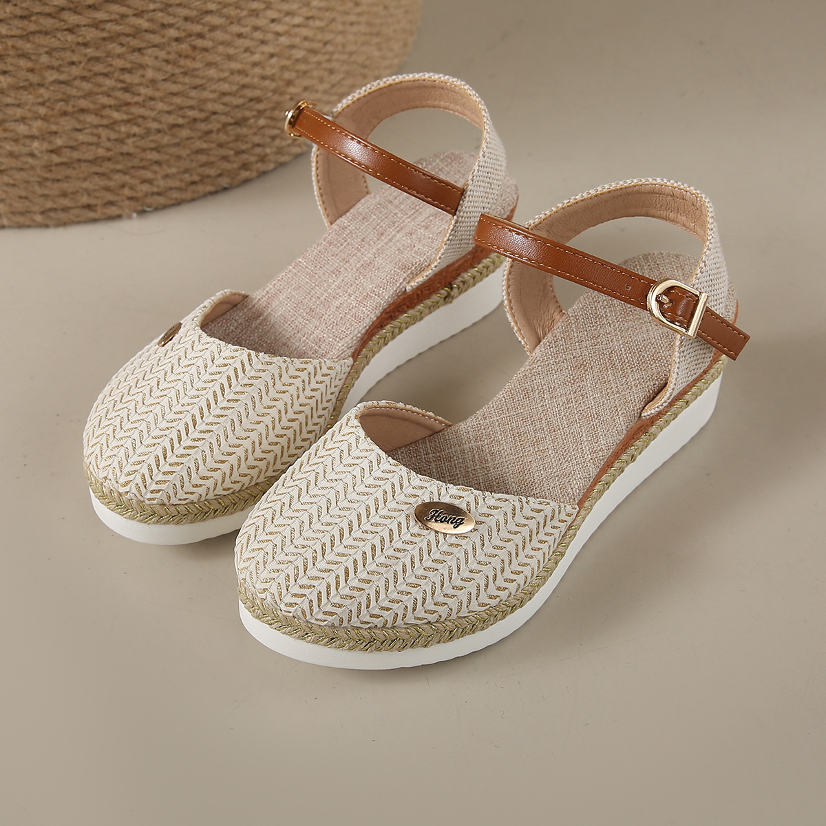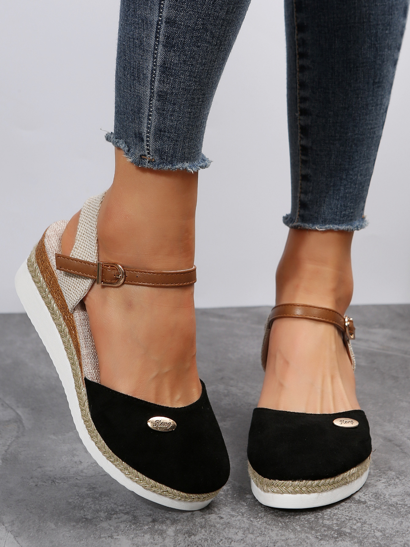 2024 년 새로운 유럽 및 미국 플러스 사이즈 대외 무역 로마 샌들 여성 봄과 여름 커버 발가락 가방 웨지 버클 대마 바닥 샌들