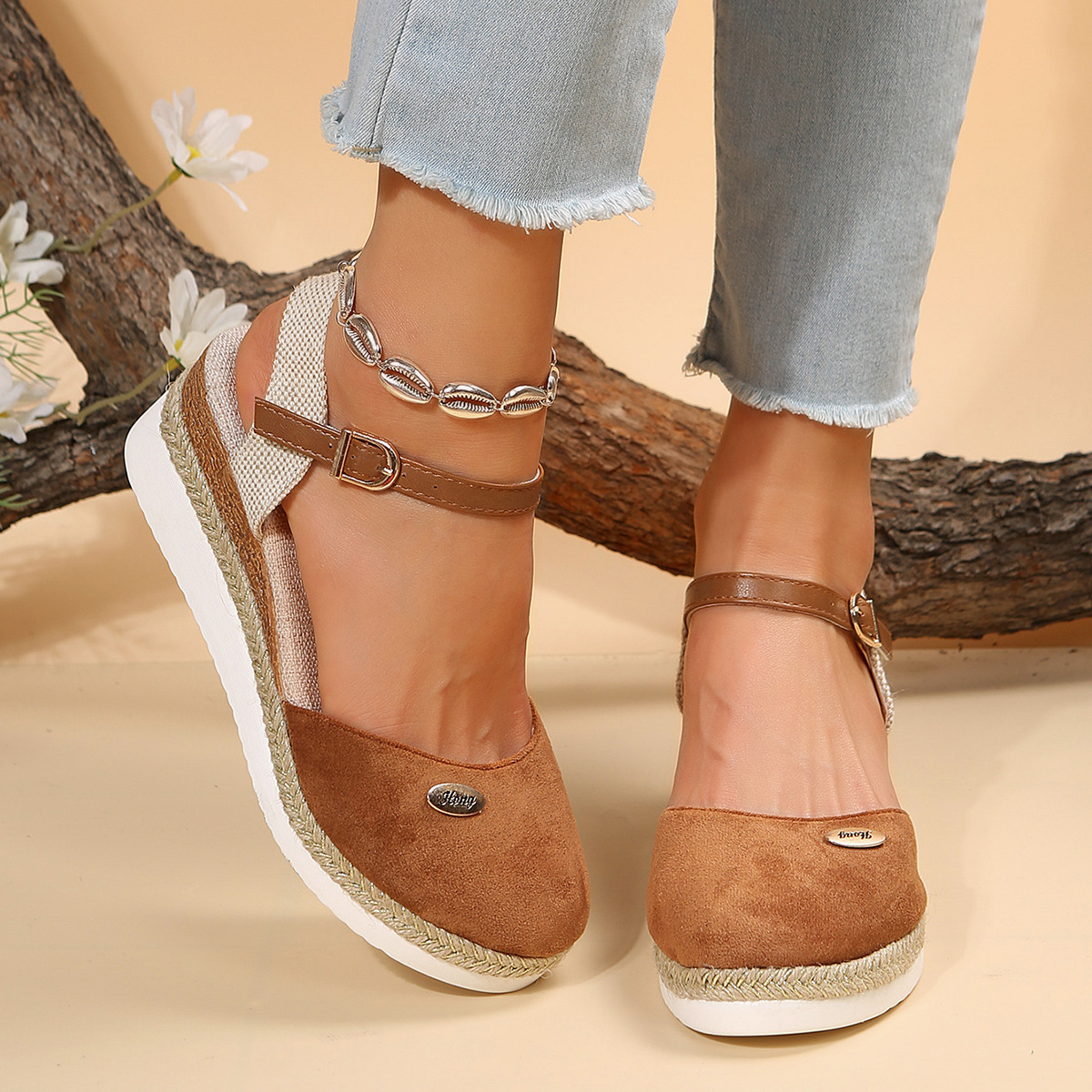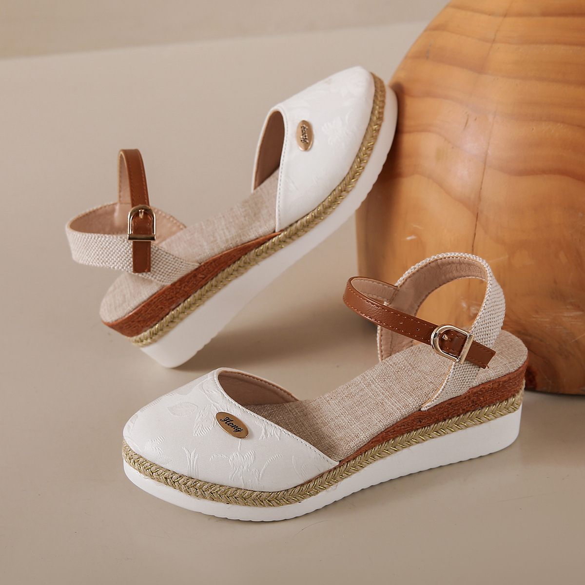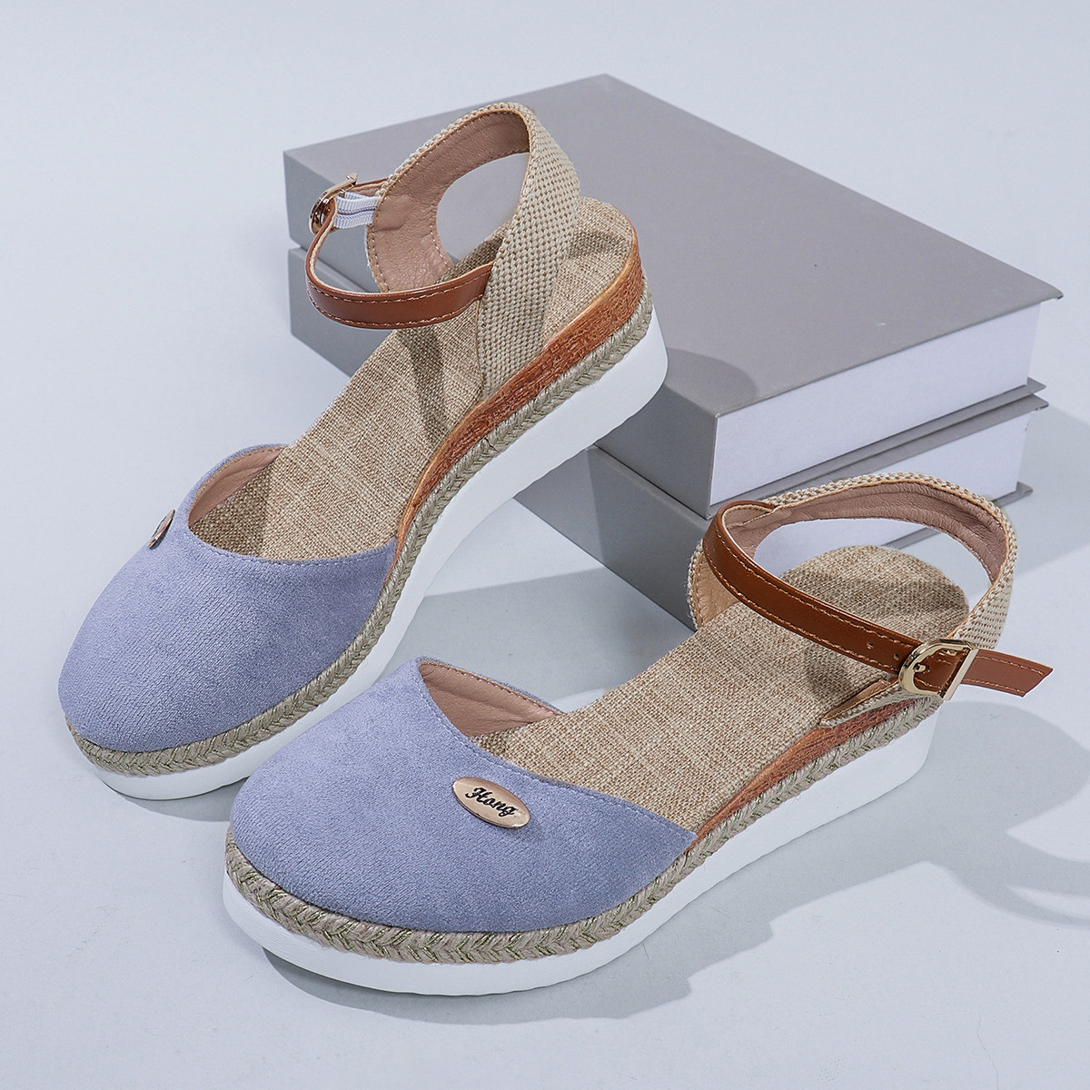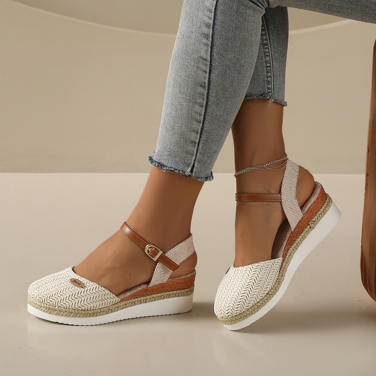 2024 년 새로운 유럽 및 미국 플러스 사이즈 대외 무역 로마 샌들 여성 봄과 여름 커버 발가락 가방 웨지 버클 대마 바닥 샌들