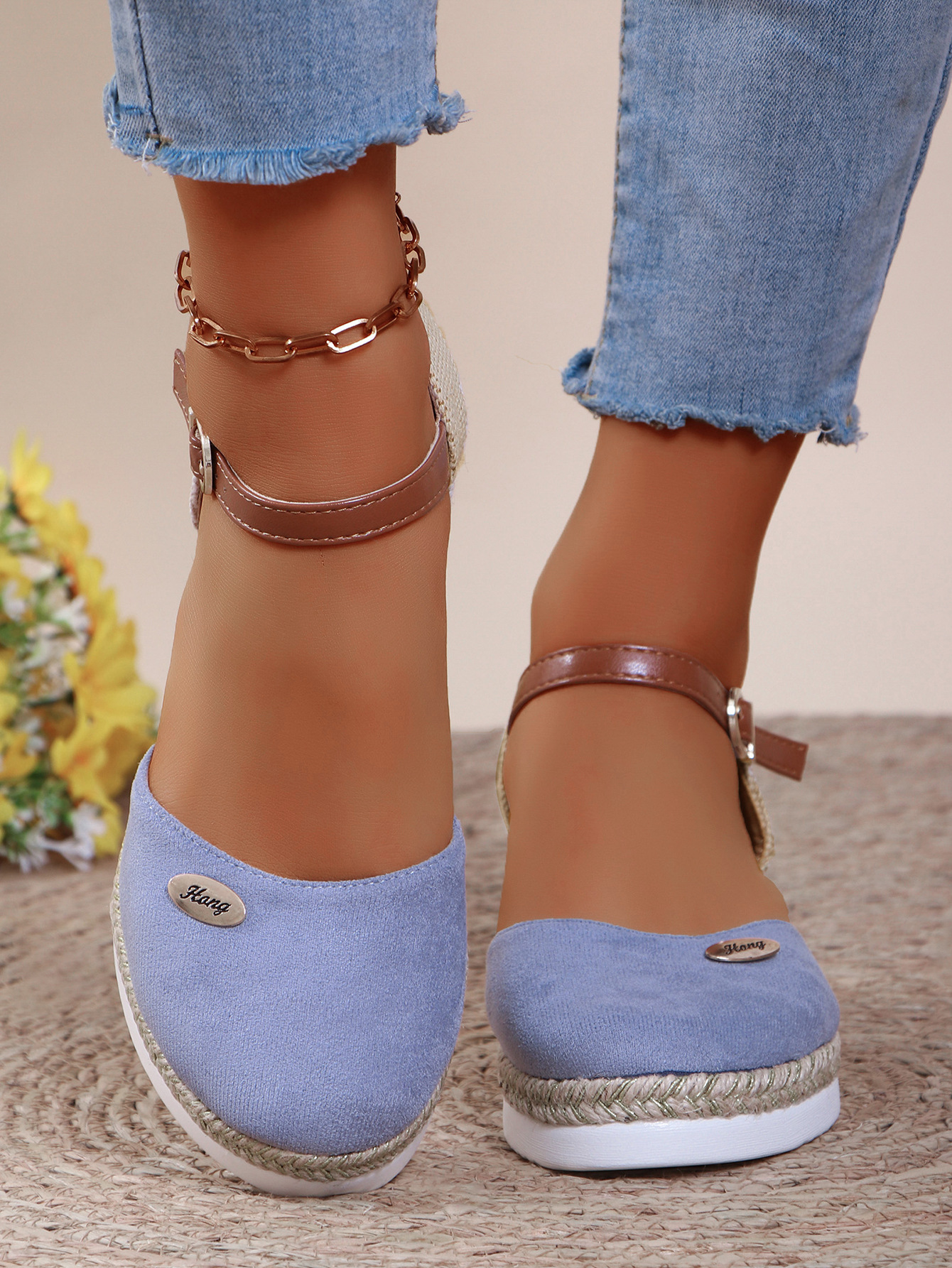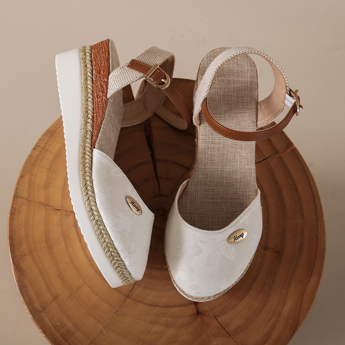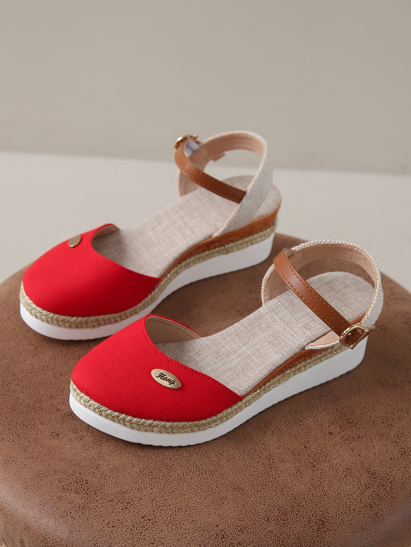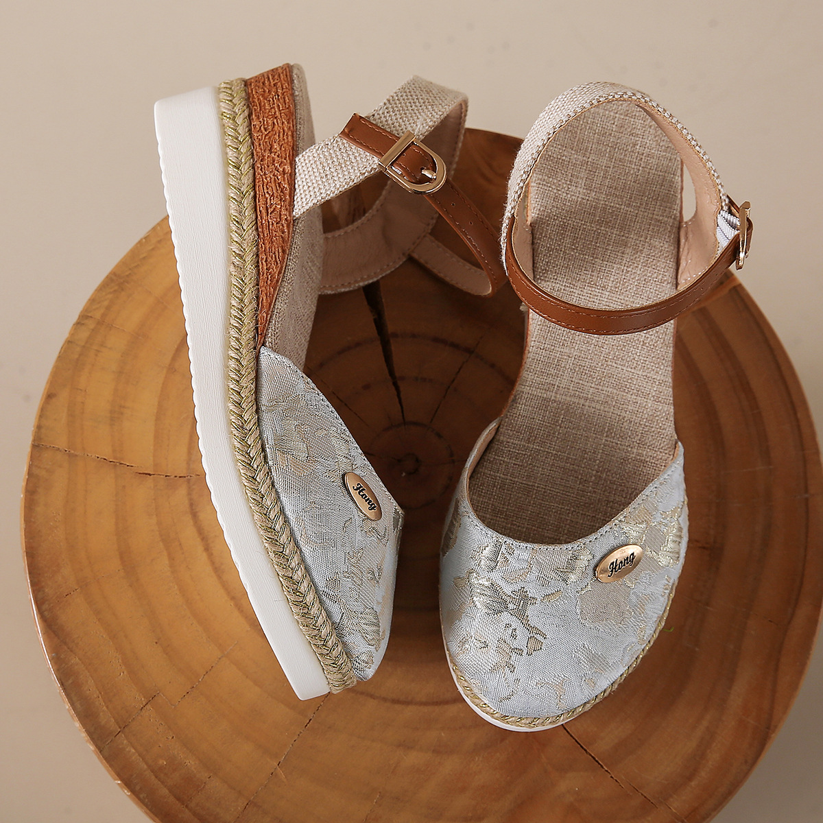 2024 년 새로운 유럽 및 미국 플러스 사이즈 대외 무역 로마 샌들 여성 봄과 여름 커버 발가락 가방 웨지 버클 대마 바닥 샌들