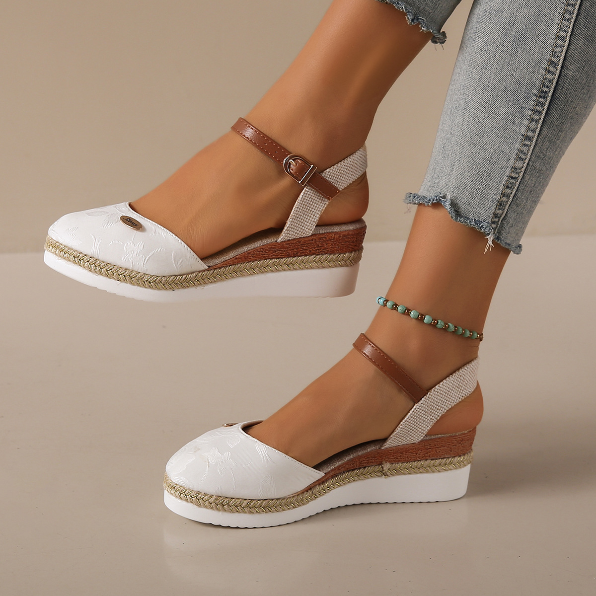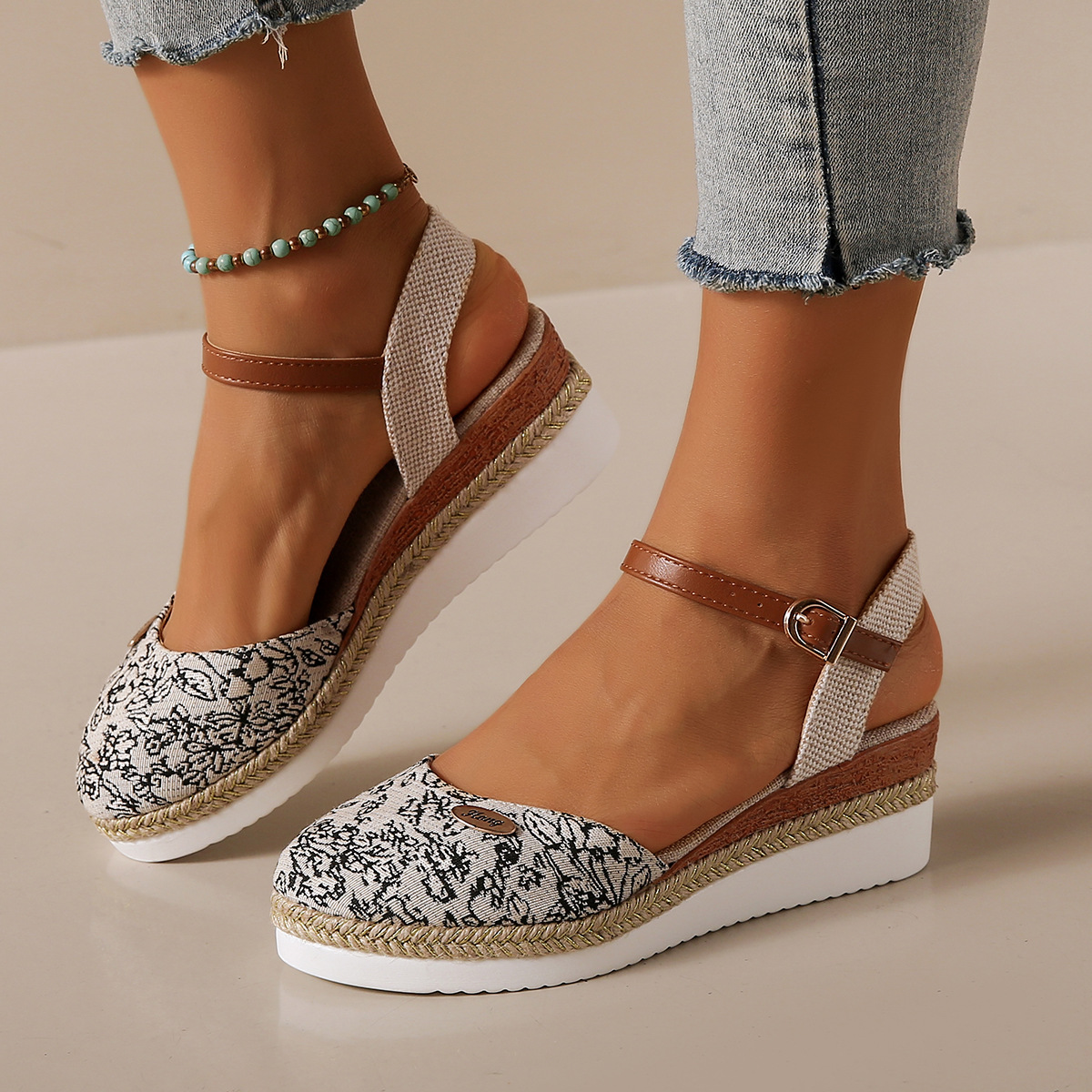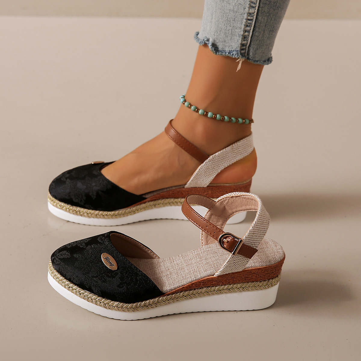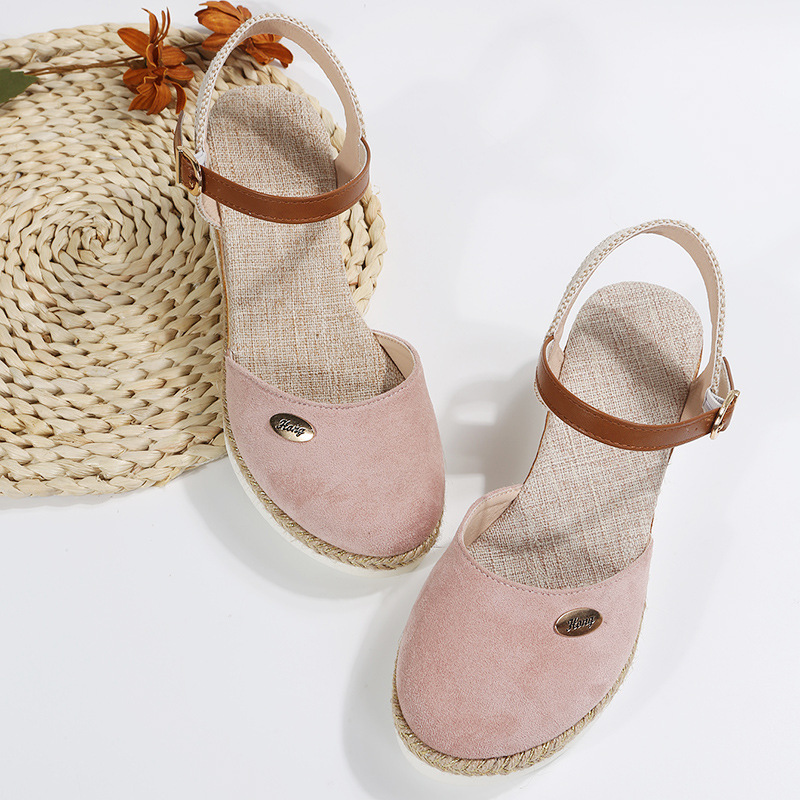 2024 년 새로운 유럽 및 미국 플러스 사이즈 대외 무역 로마 샌들 여성 봄과 여름 커버 발가락 가방 웨지 버클 대마 바닥 샌들스토어 가기