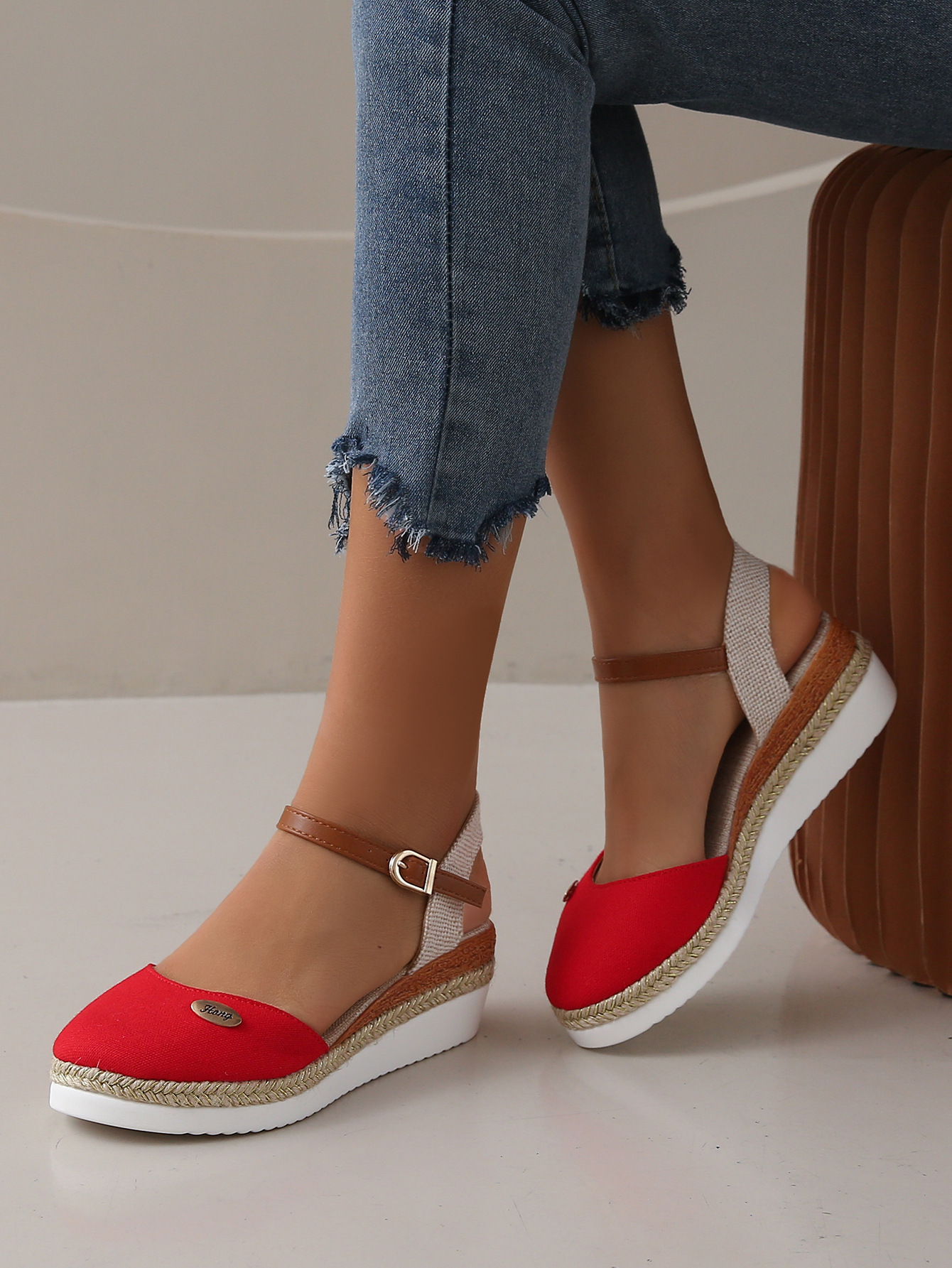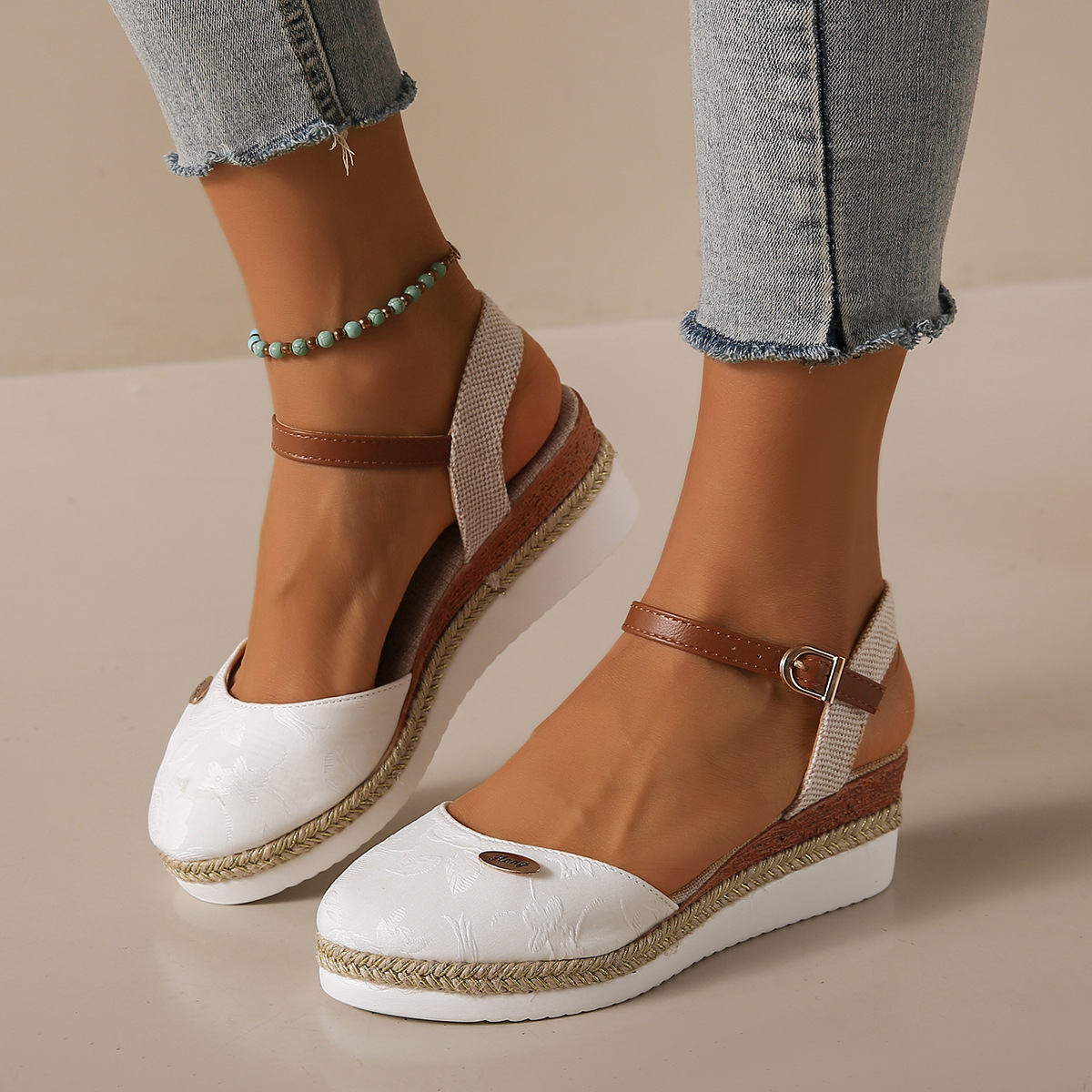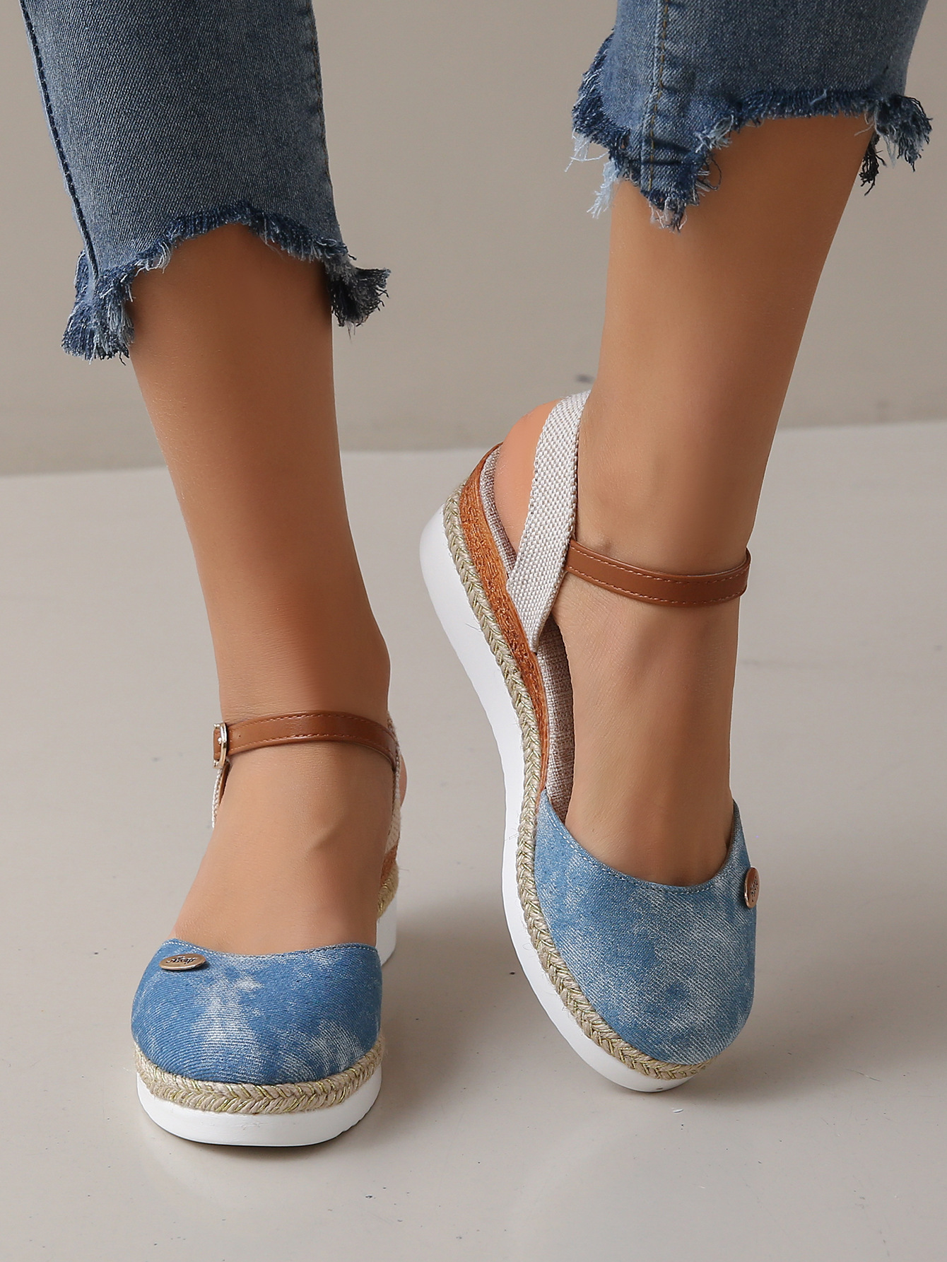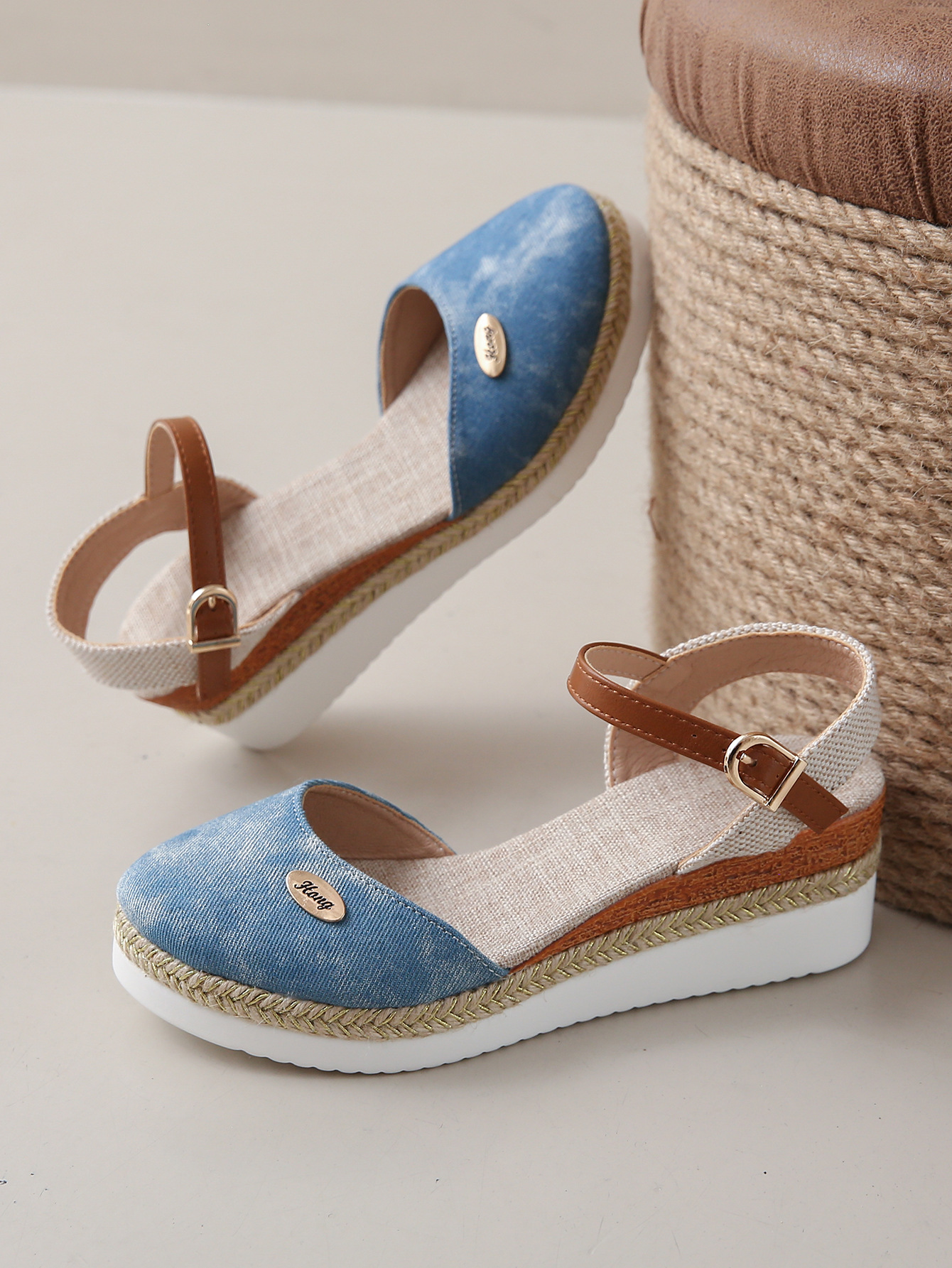2024 년 새로운 유럽 및 미국 플러스 사이즈 대외 무역 로마 샌들 여성 봄과 여름 커버 발가락 가방 웨지 버클 대마 바닥 샌들스토어 가기