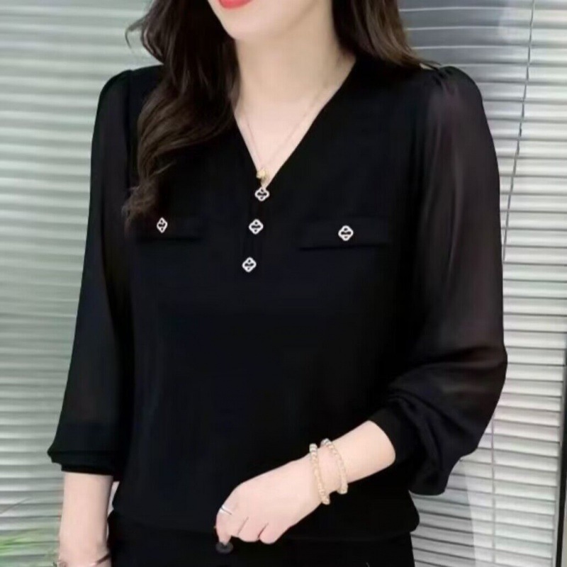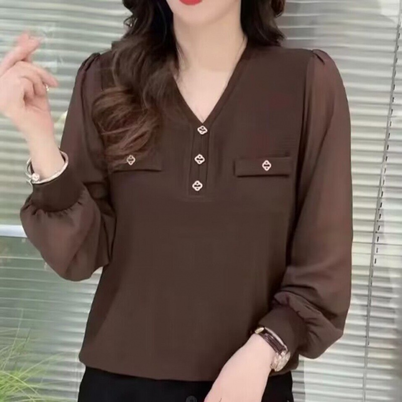 시폰 벨리 커버 쉬폰 셔츠 긴 소매 2024 가을 새로운 V-Neck 백킹 올 매치 웨스턴 스타일 숙녀 도매스토어 가기